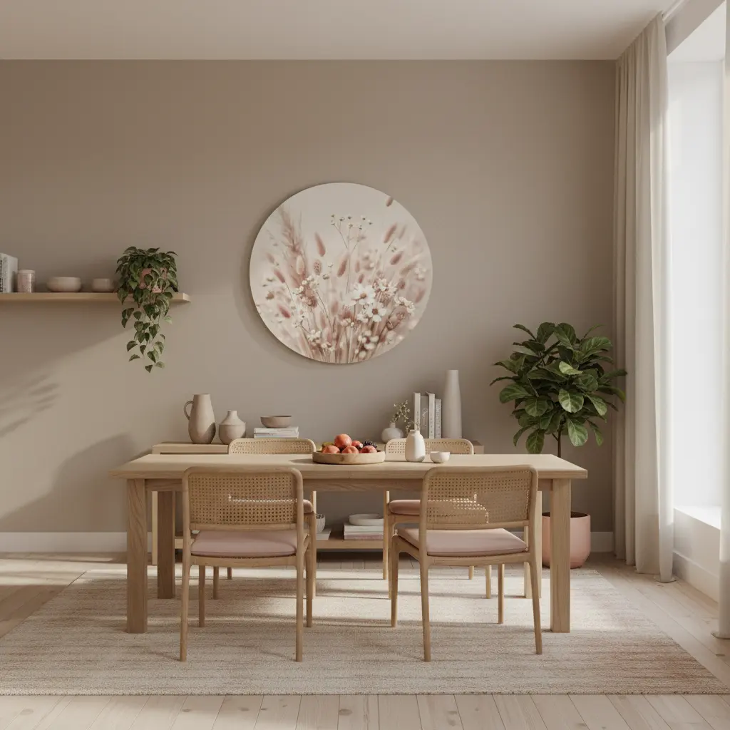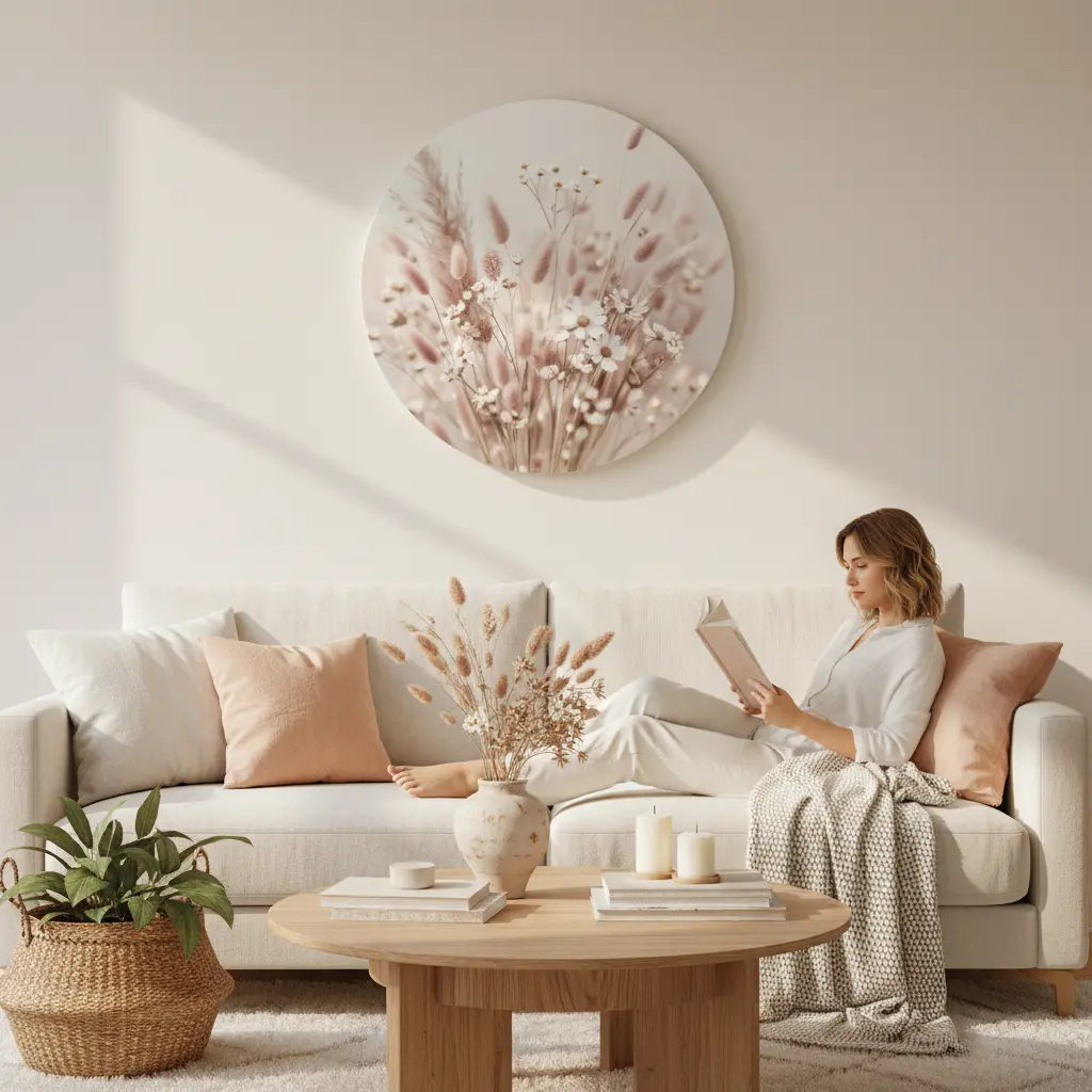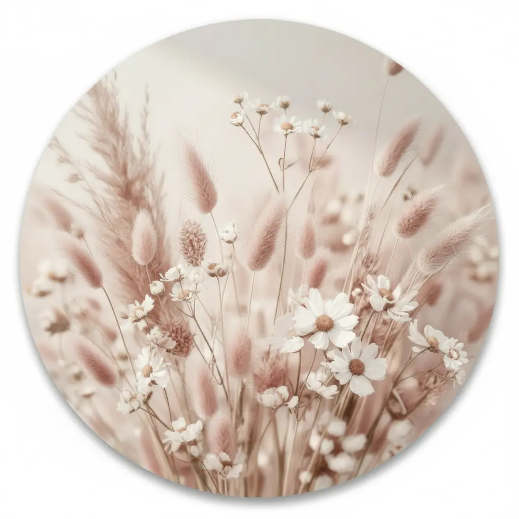 Een zachte fotokunst print met blush-roze droogbloemen en kleine witte bloemetjes, gevangen in warm zomers licht met een rustige matte fine-art uitstraling. De luchtige bokeh en romantische tinten geven deze muurcirkel een premium boho sfeer die perfect past bij een zacht en warm interieur.