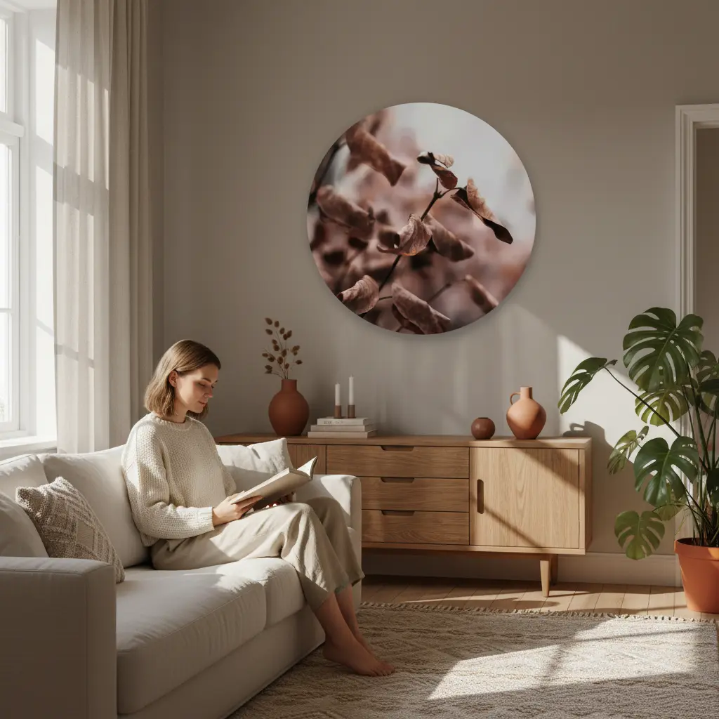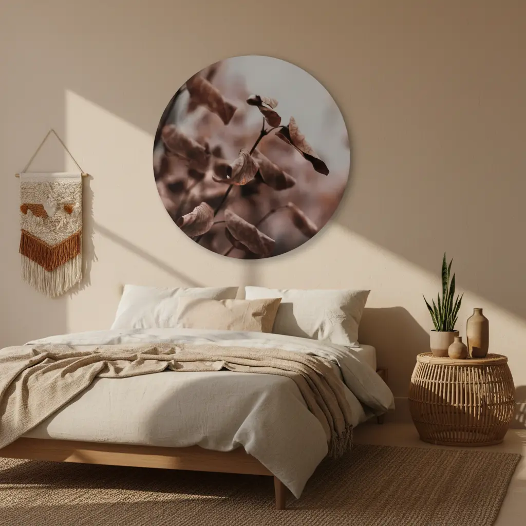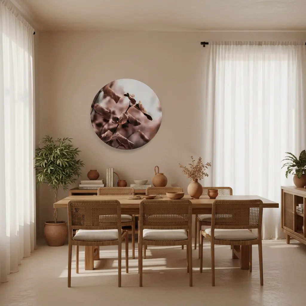 Een subtiel en elegant kunstwerk dat de zachte schoonheid van gedroogde bloemen vastlegt. Met warme beige en bruine tinten creëert dit minimalistisch ontwerp een rustgevend, natuurlijk gevoel. Perfect voor wie op zoek is naar een kunstwerk dat elegantie en organische warmte combineert.