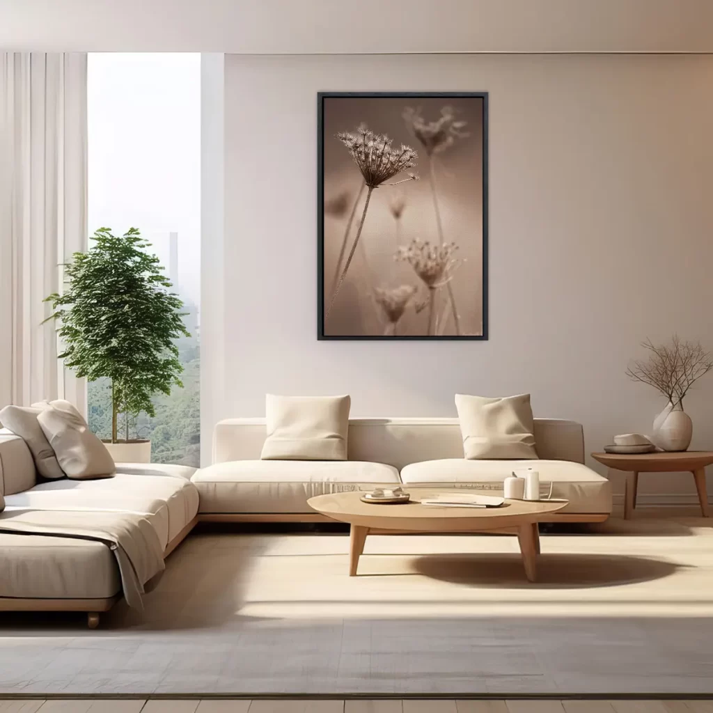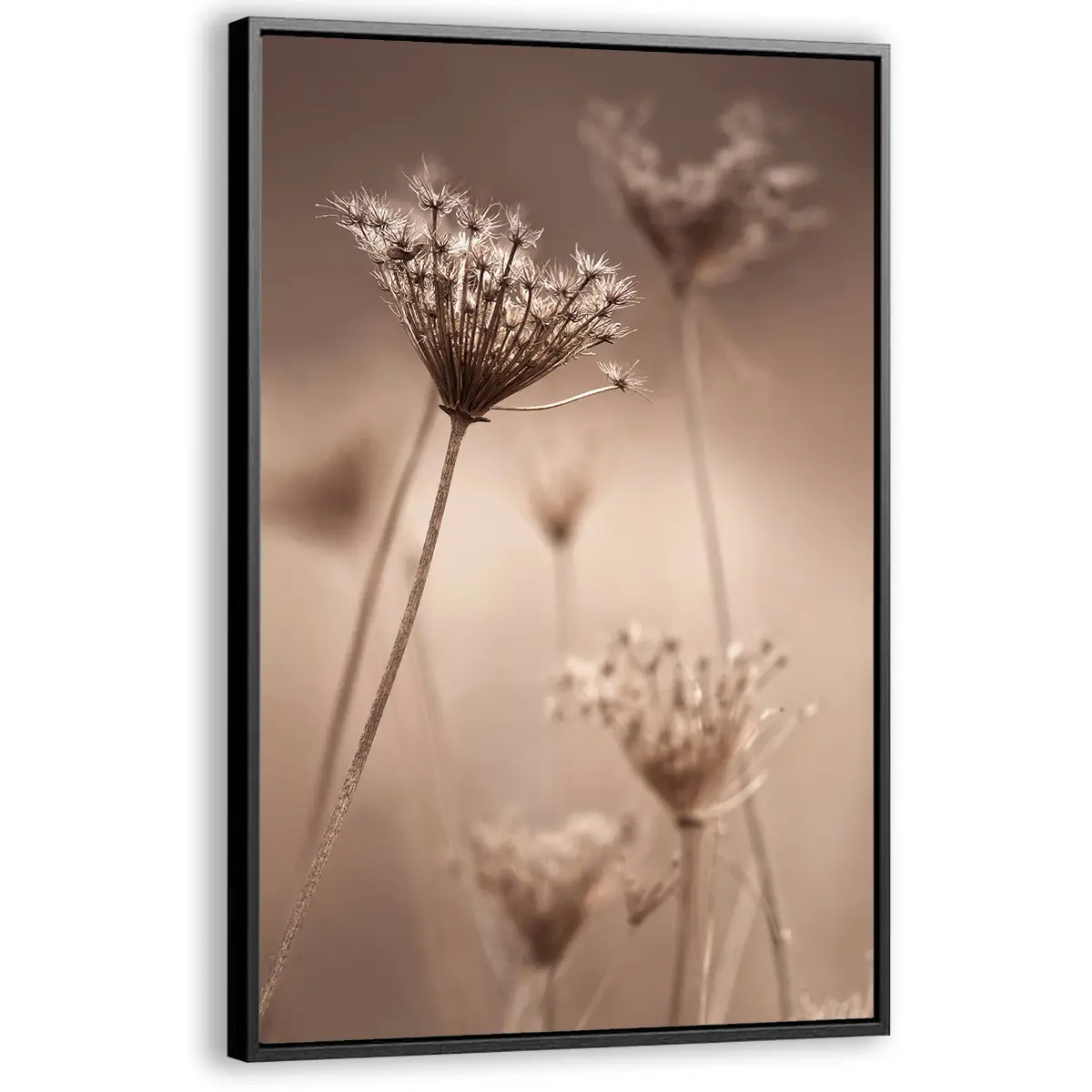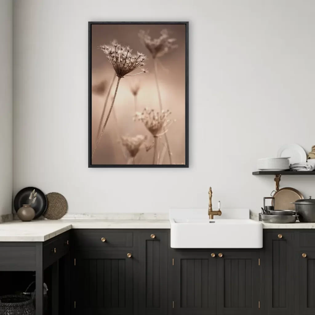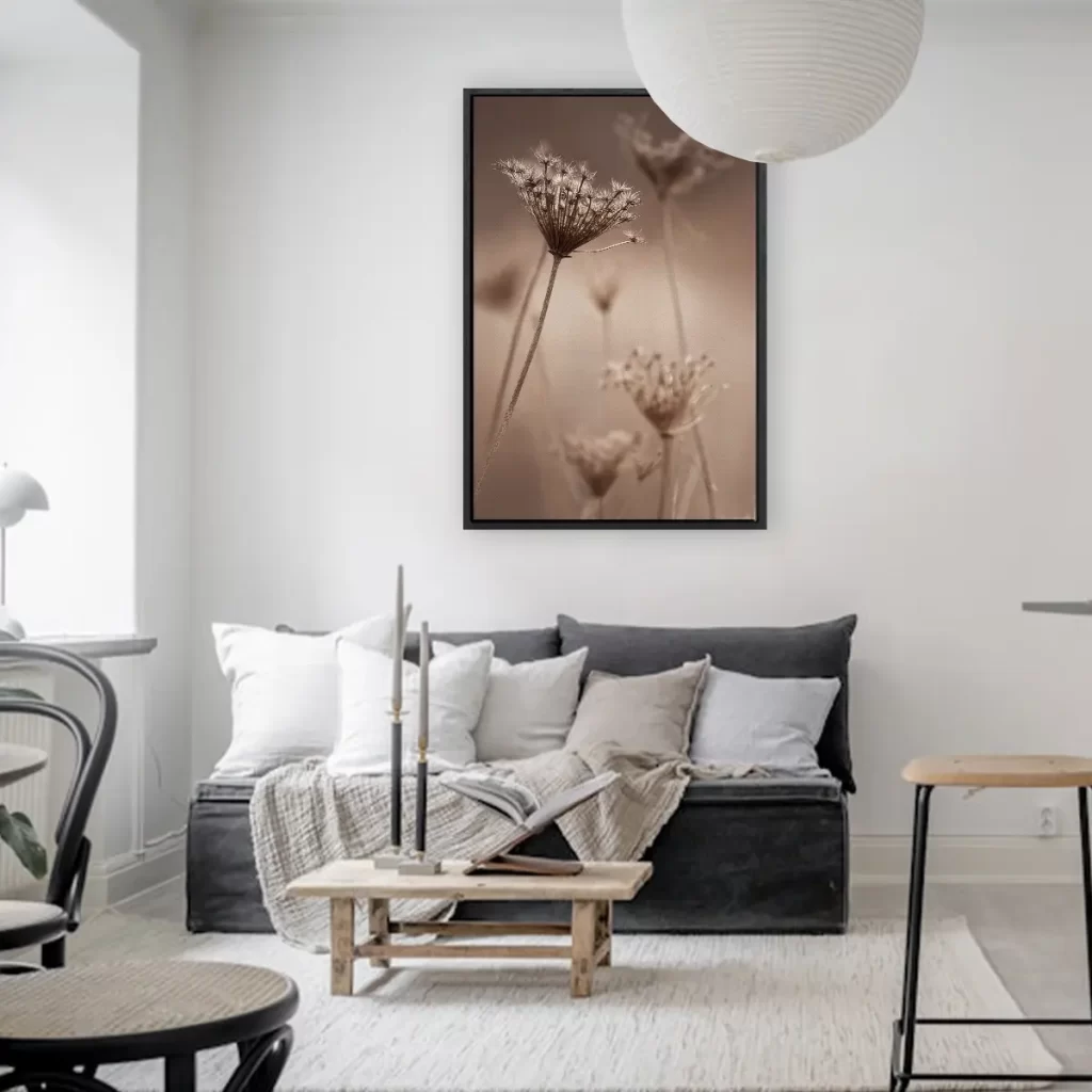 Een sfeervolle close-up van een uitgebloeide berenklauw in warme sepiatinten. De delicate structuur en het spel van licht maken deze botanische print tot een elegant kunstwerk. Als wanddecoratie brengt deze afbeelding een subtiele natuurlijke touch en tijdloze elegantie in elk interieur, perfect passend in een moderne of Scandinavische woonstijl.