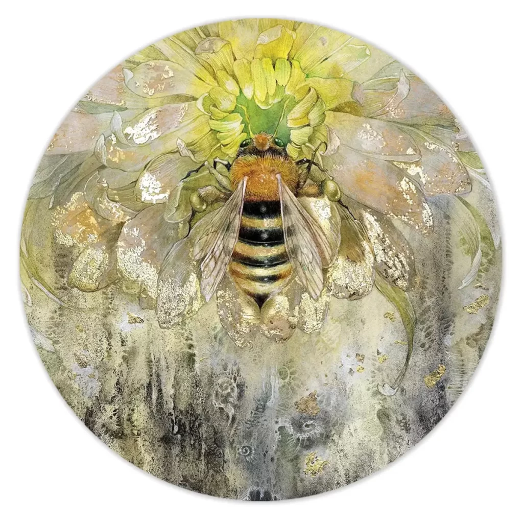 Een sfeervolle aquarel van een honingbij op een stralend gele bloem. De zachte, impressionistische stijl en de warme kleurtonen creëren een vriendelijke, natuurlijke sfeer. Als wanddecoratie brengt deze print een vleugje zomer en natuur in huis, perfect voor een botanisch of landelijk interieur. De gouden accenten geven het werk een luxueuze uitstraling.