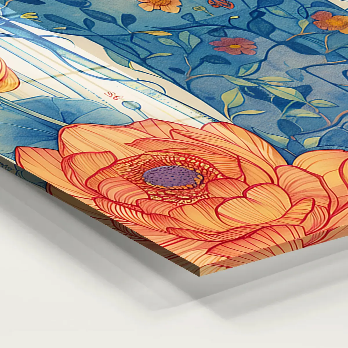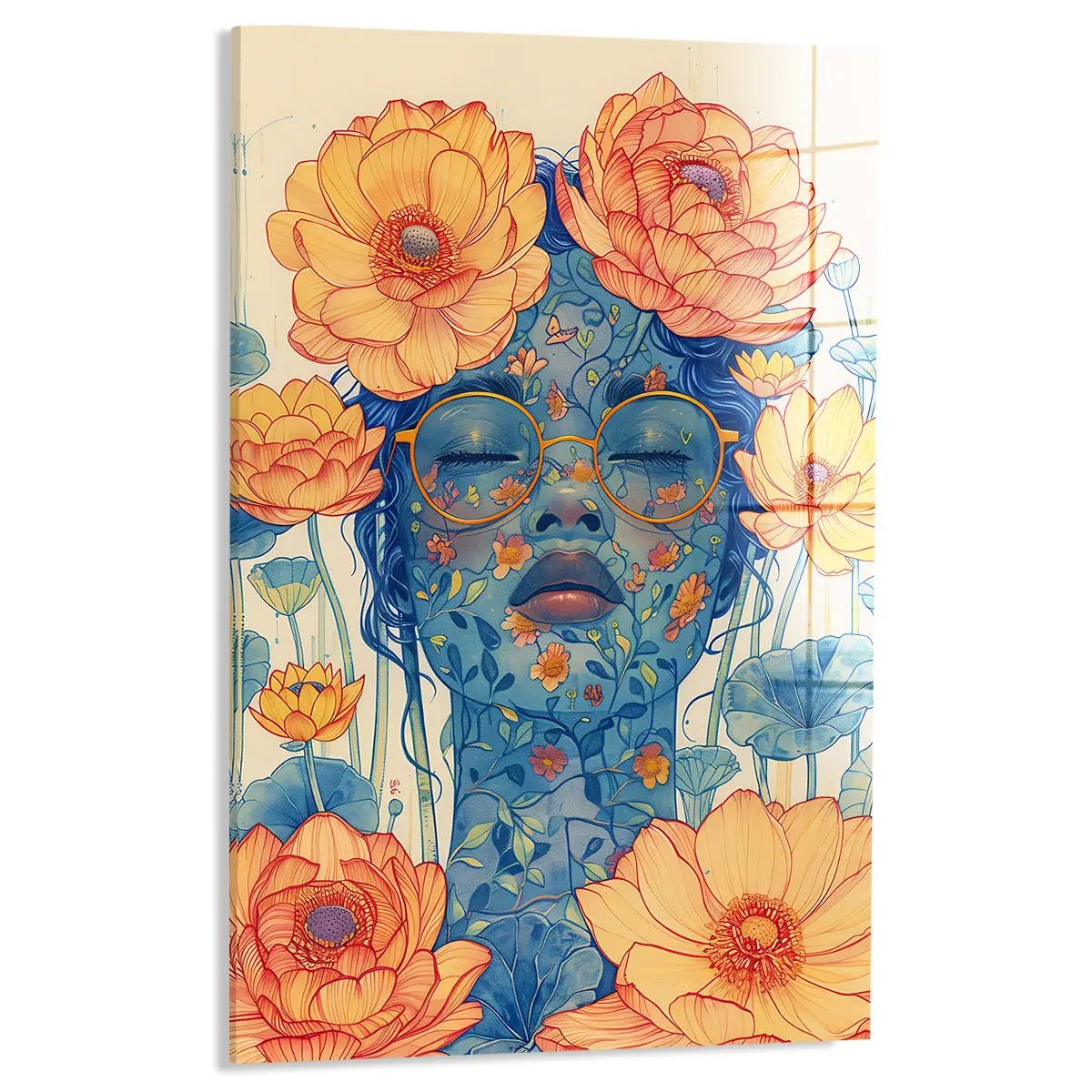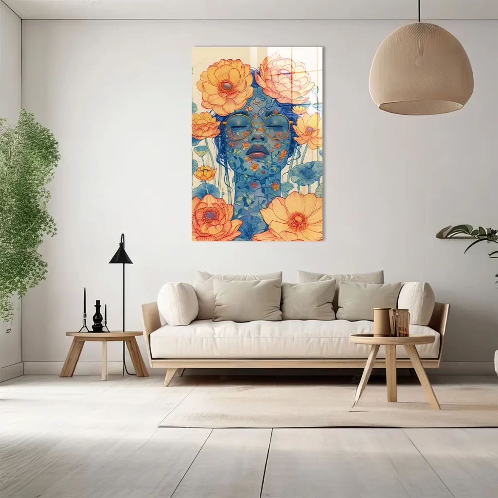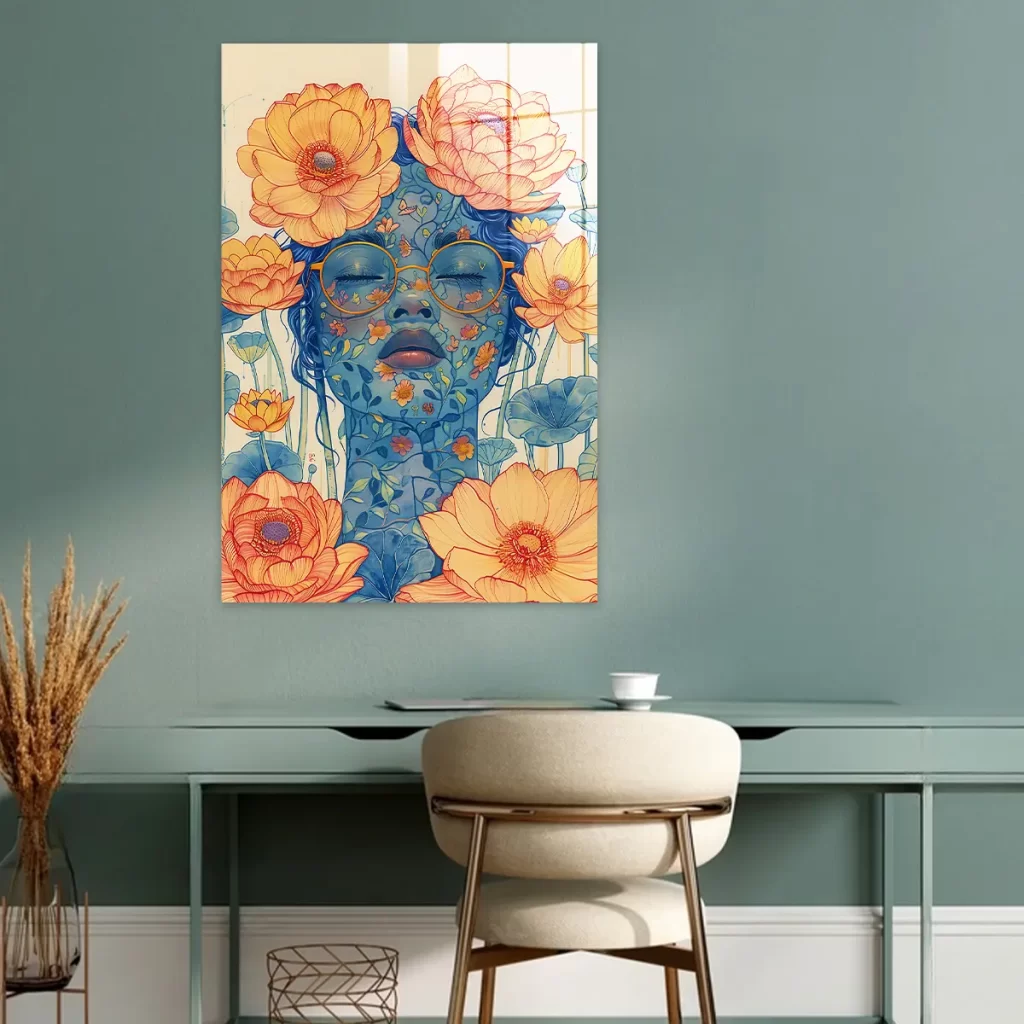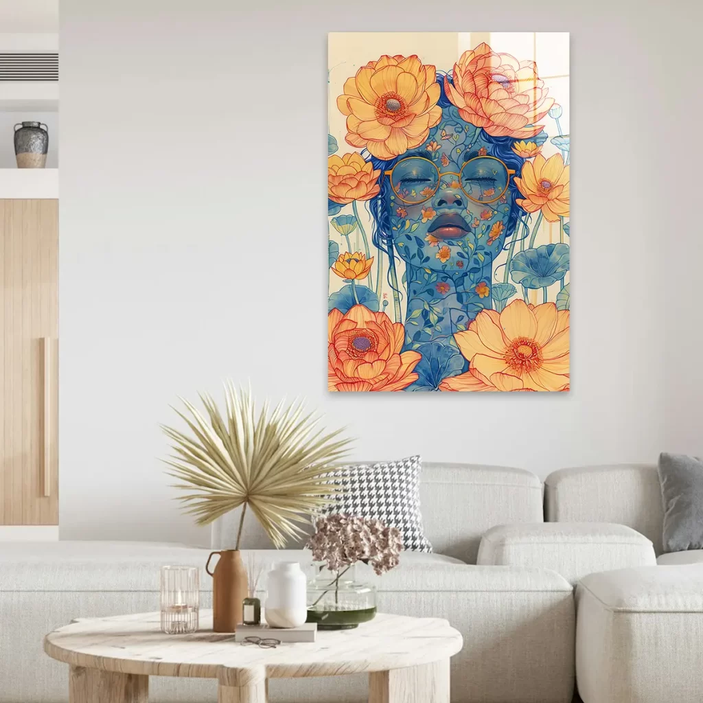 Dit kunstwerk straalt een gevoel van rust, poëzie en verbinding met de natuur uit. De levendige bloemen en het contrast tussen de warme oranje tinten en de koele blauwe tonen creëren een dromerige en uitnodigende sfeer.