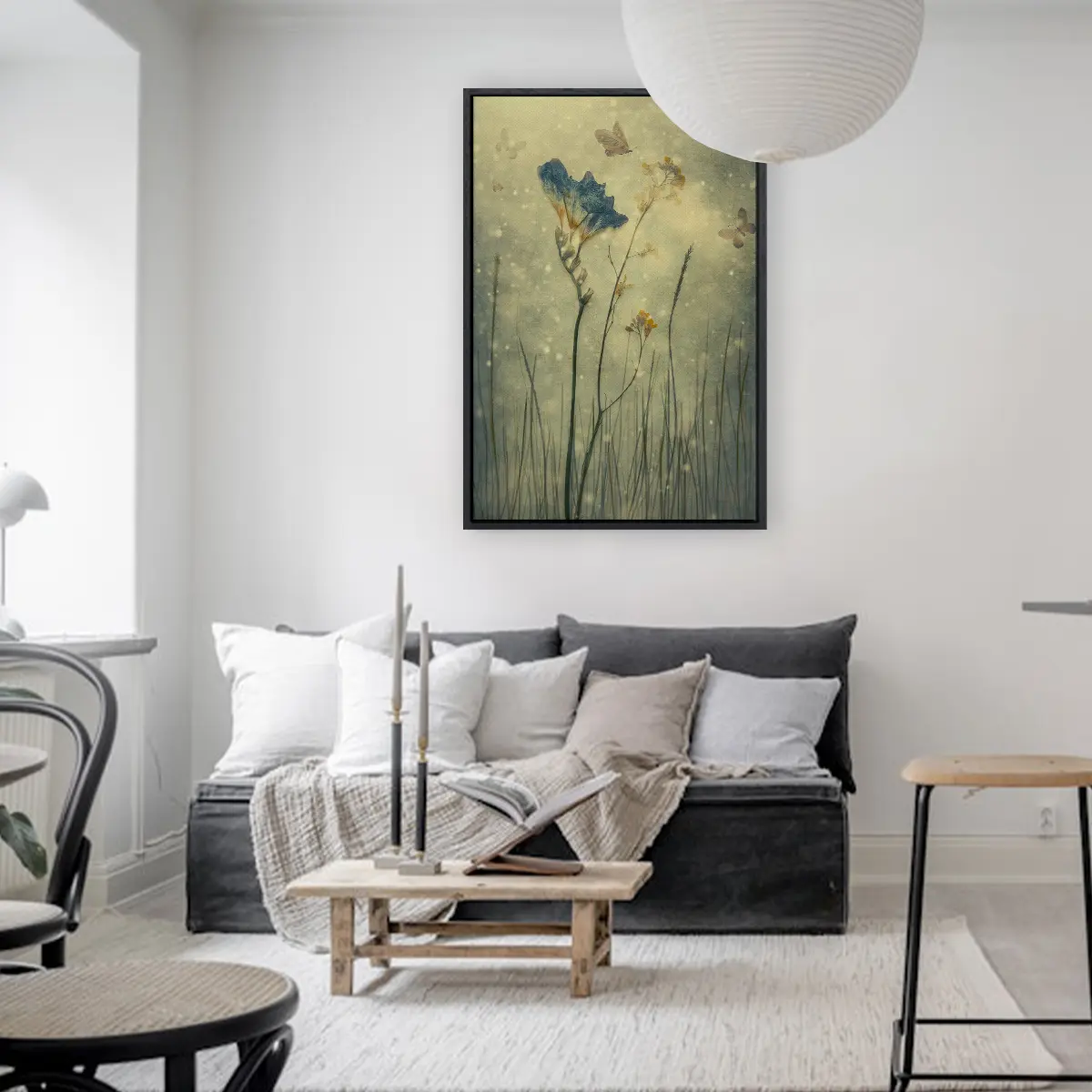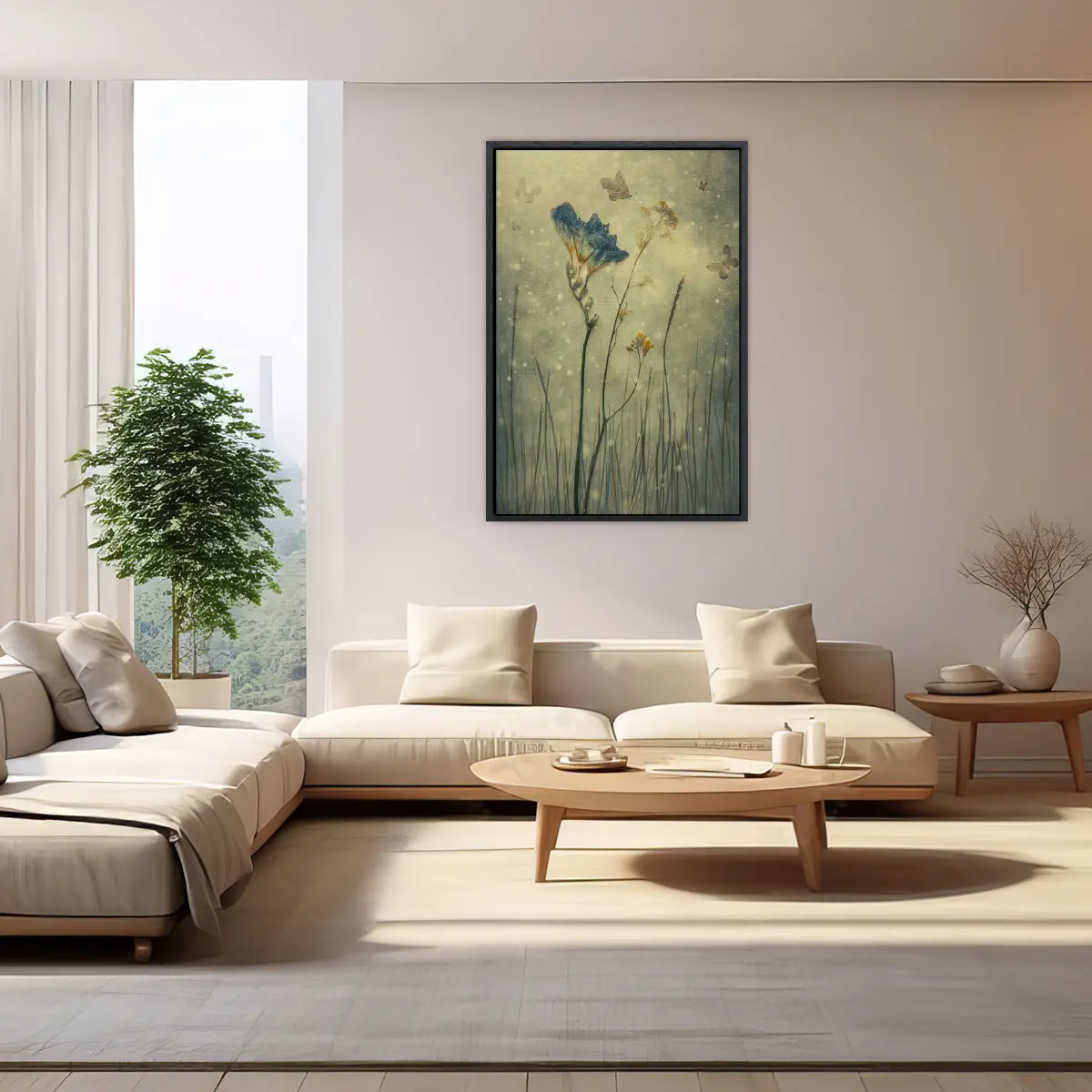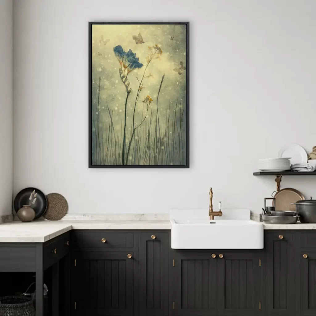 Een betoverend beeld van een blauwe bloem tegen een zacht, mistig decor met dansende vlinders en delicate wilde bloemen. De dromerige, vintage uitstraling en de zachte kleurschakeringen creëren een rustgevende sfeer die perfect past in een romantisch of landelijk interieur. De subtiele lichtpuntjes in de achtergrond geven het geheel een magische dimensie.
