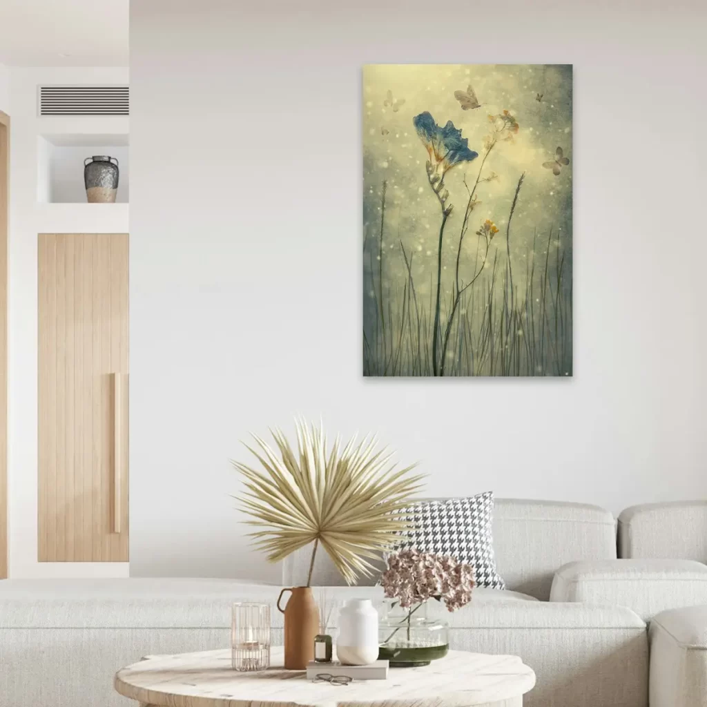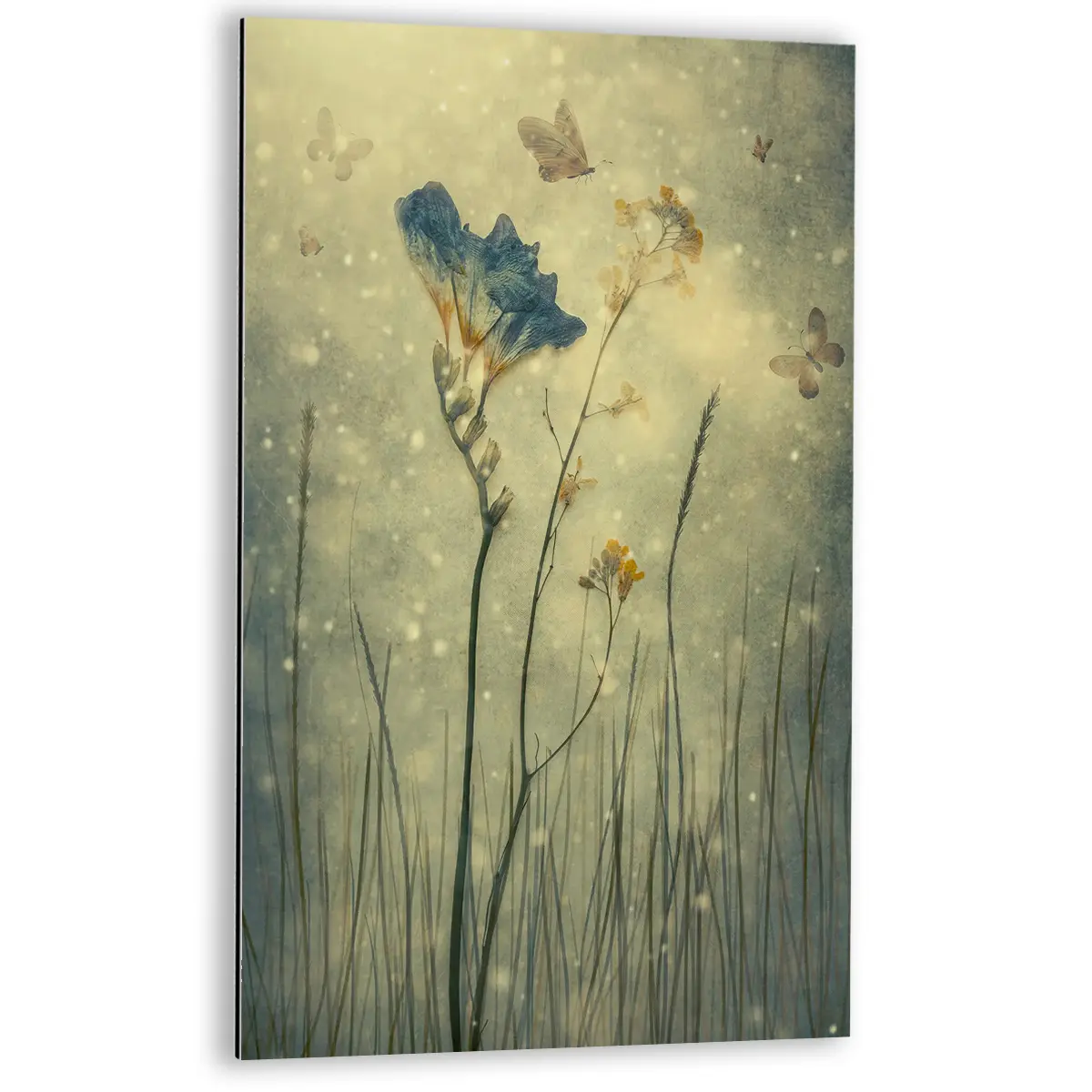 Een betoverend beeld van een blauwe bloem tegen een zacht, mistig decor met dansende vlinders en delicate wilde bloemen. De dromerige, vintage uitstraling en de zachte kleurschakeringen creëren een rustgevende sfeer die perfect past in een romantisch of landelijk interieur. De subtiele lichtpuntjes in de achtergrond geven het geheel een magische dimensie.