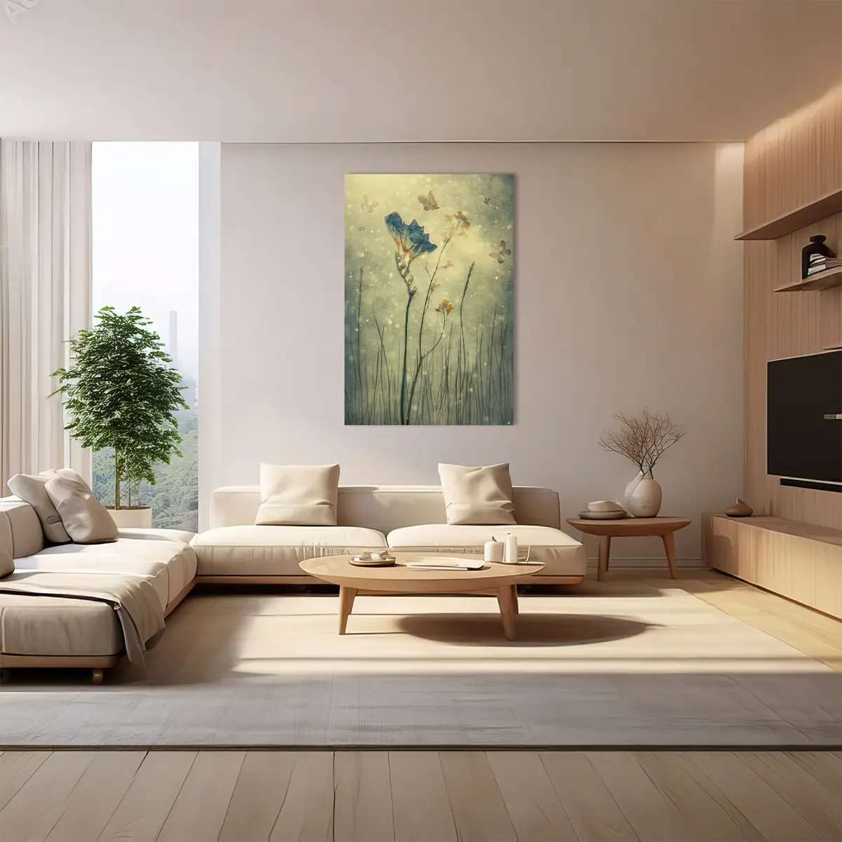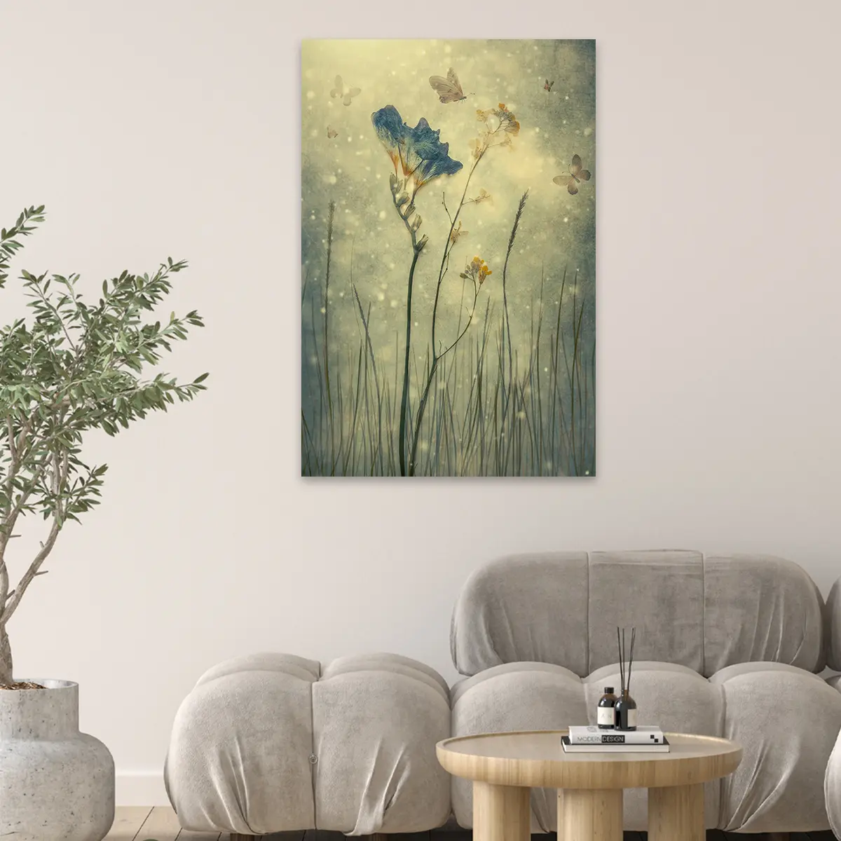Een betoverend beeld van een blauwe bloem tegen een zacht, mistig decor met dansende vlinders en delicate wilde bloemen. De dromerige, vintage uitstraling en de zachte kleurschakeringen creëren een rustgevende sfeer die perfect past in een romantisch of landelijk interieur. De subtiele lichtpuntjes in de achtergrond geven het geheel een magische dimensie.