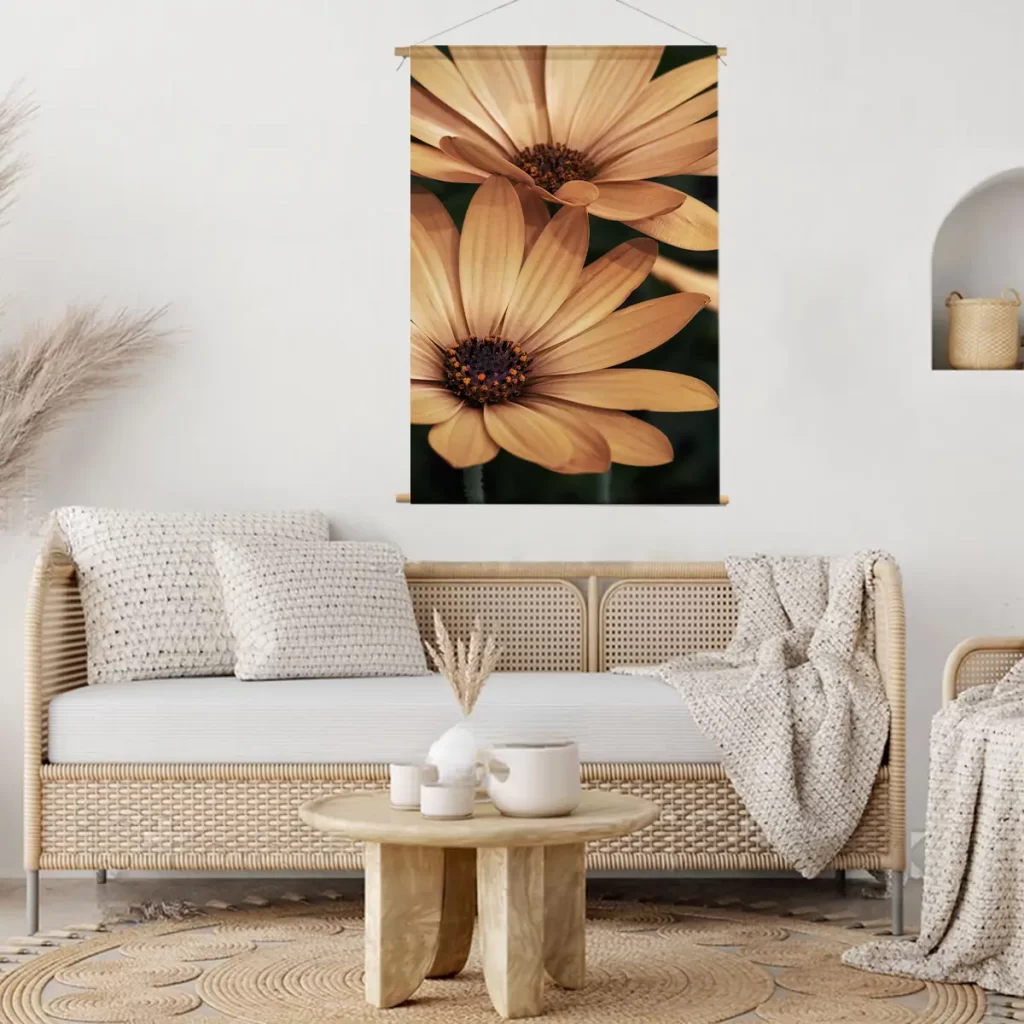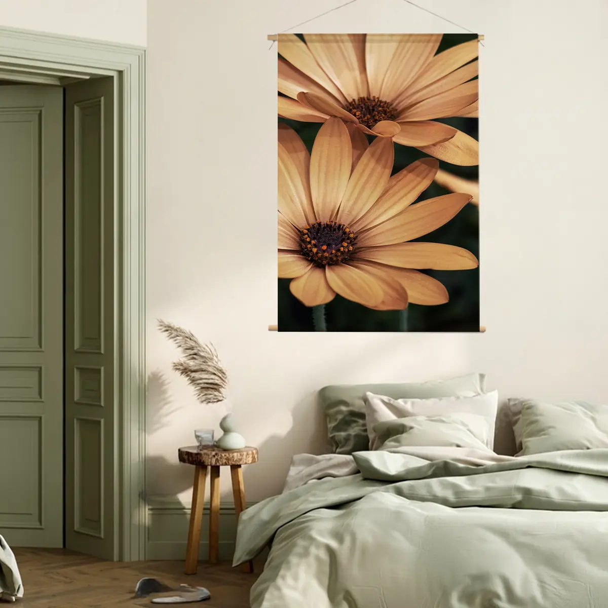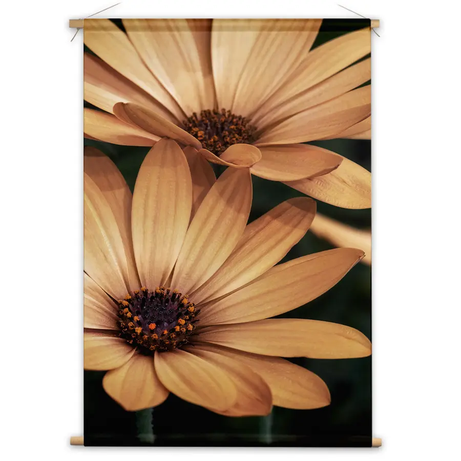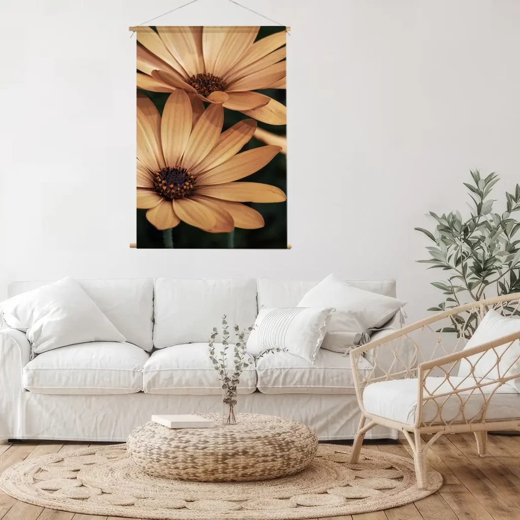 Een warme, intieme close-up van oranje madelieven die straalt van positieve energie. De rijke, honinggouden tinten en de scherpe details van de bloemblaadjes creëren een krachtig beeld dat warmte en levendigheid toevoegt aan elke ruimte. Perfect voor een modern of botanisch geïnspireerd interieur.