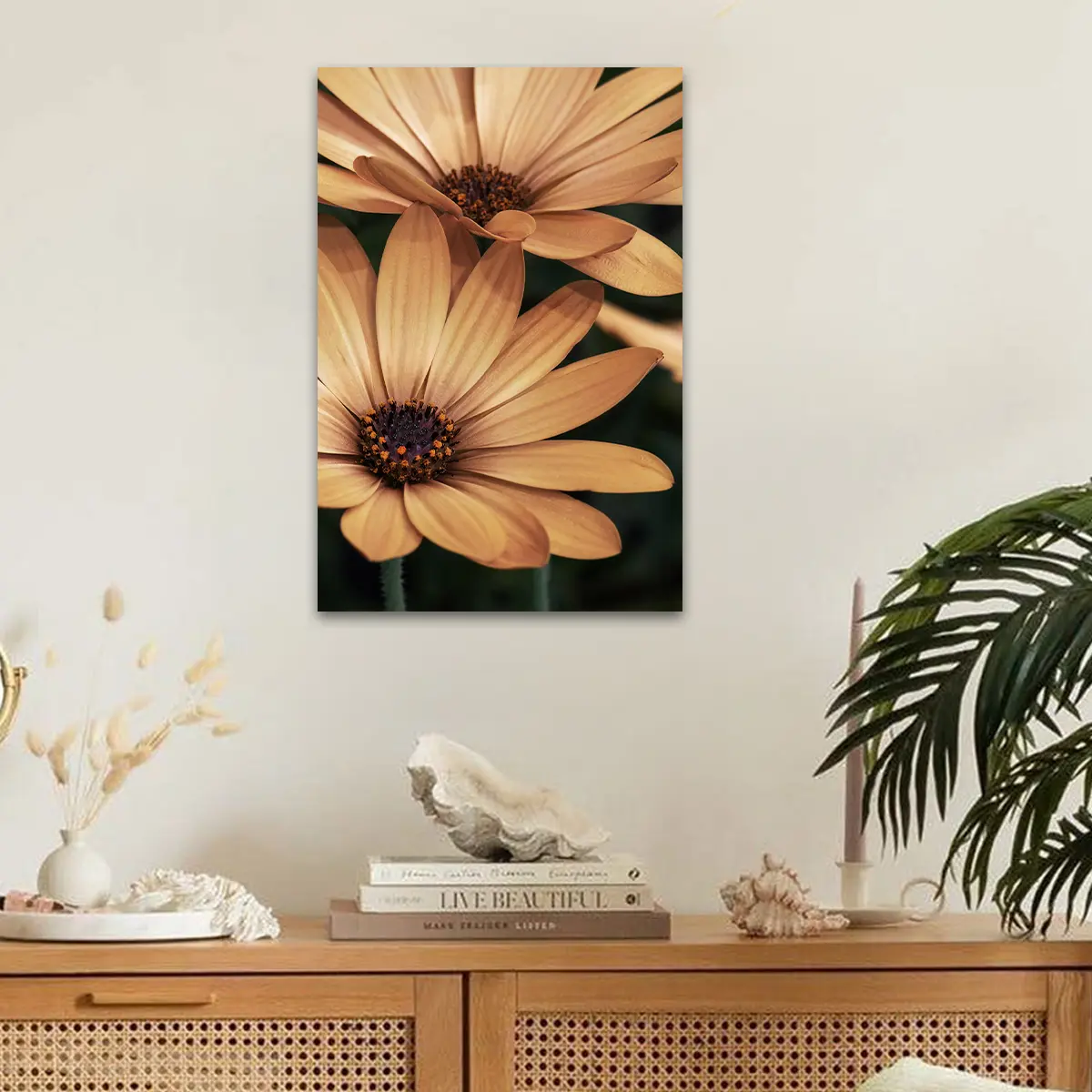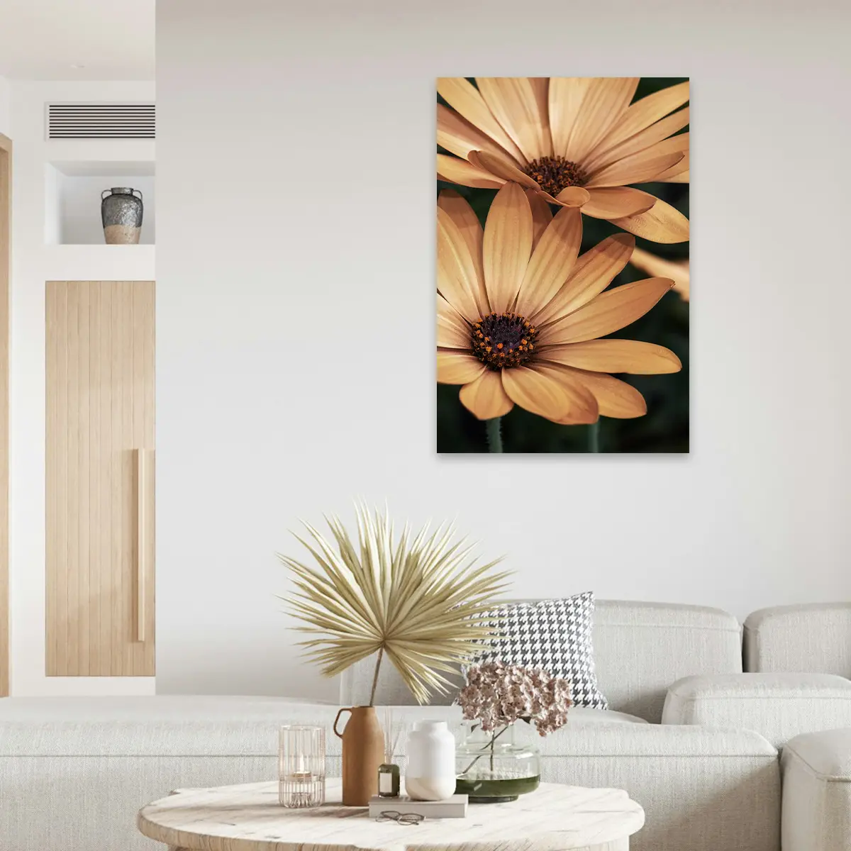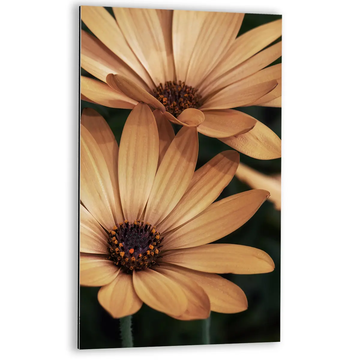 Een warme, intieme close-up van oranje madelieven die straalt van positieve energie. De rijke, honinggouden tinten en de scherpe details van de bloemblaadjes creëren een krachtig beeld dat warmte en levendigheid toevoegt aan elke ruimte. Perfect voor een modern of botanisch geïnspireerd interieur.