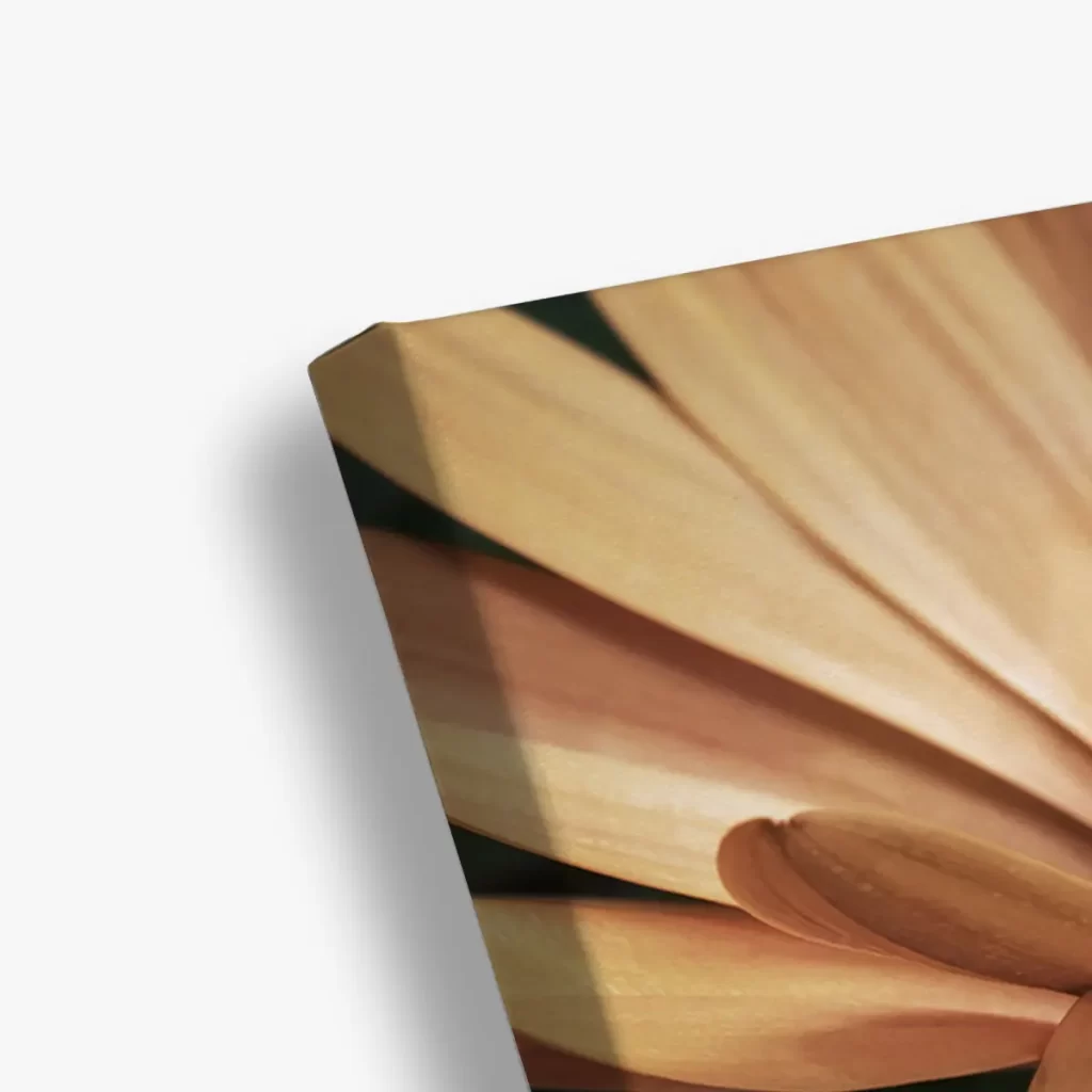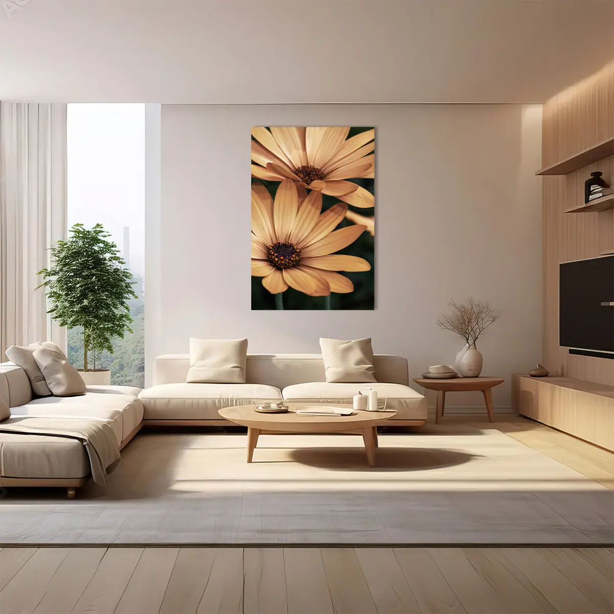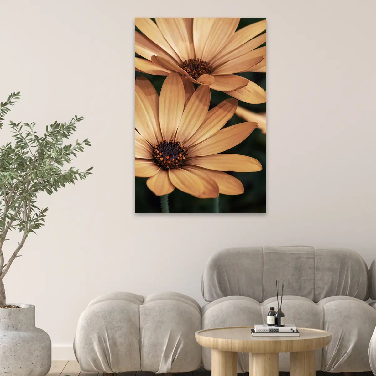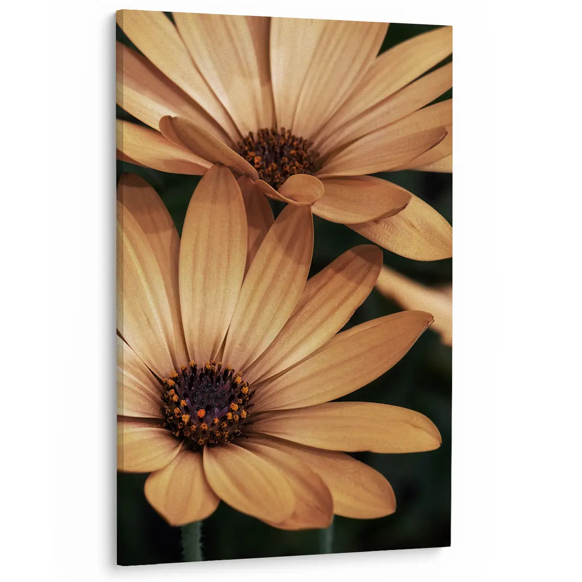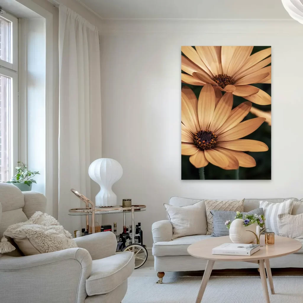 Een warme, intieme close-up van oranje madelieven die straalt van positieve energie. De rijke, honinggouden tinten en de scherpe details van de bloemblaadjes creëren een krachtig beeld dat warmte en levendigheid toevoegt aan elke ruimte. Perfect voor een modern of botanisch geïnspireerd interieur.