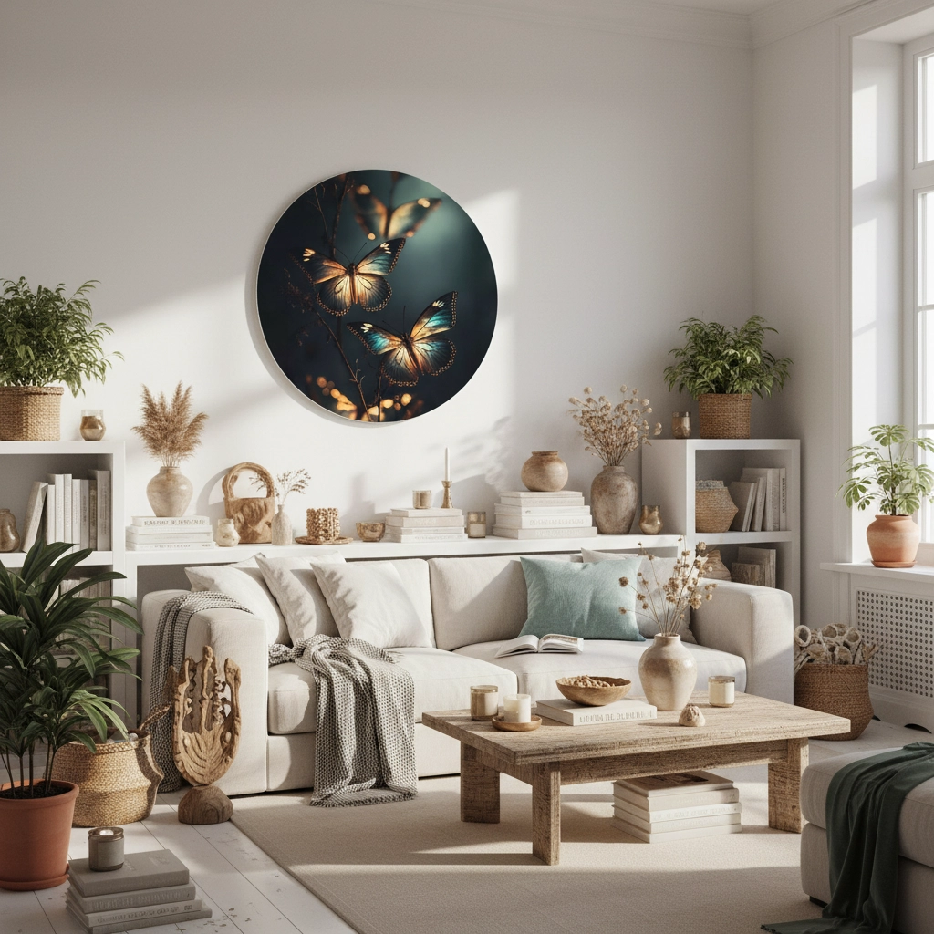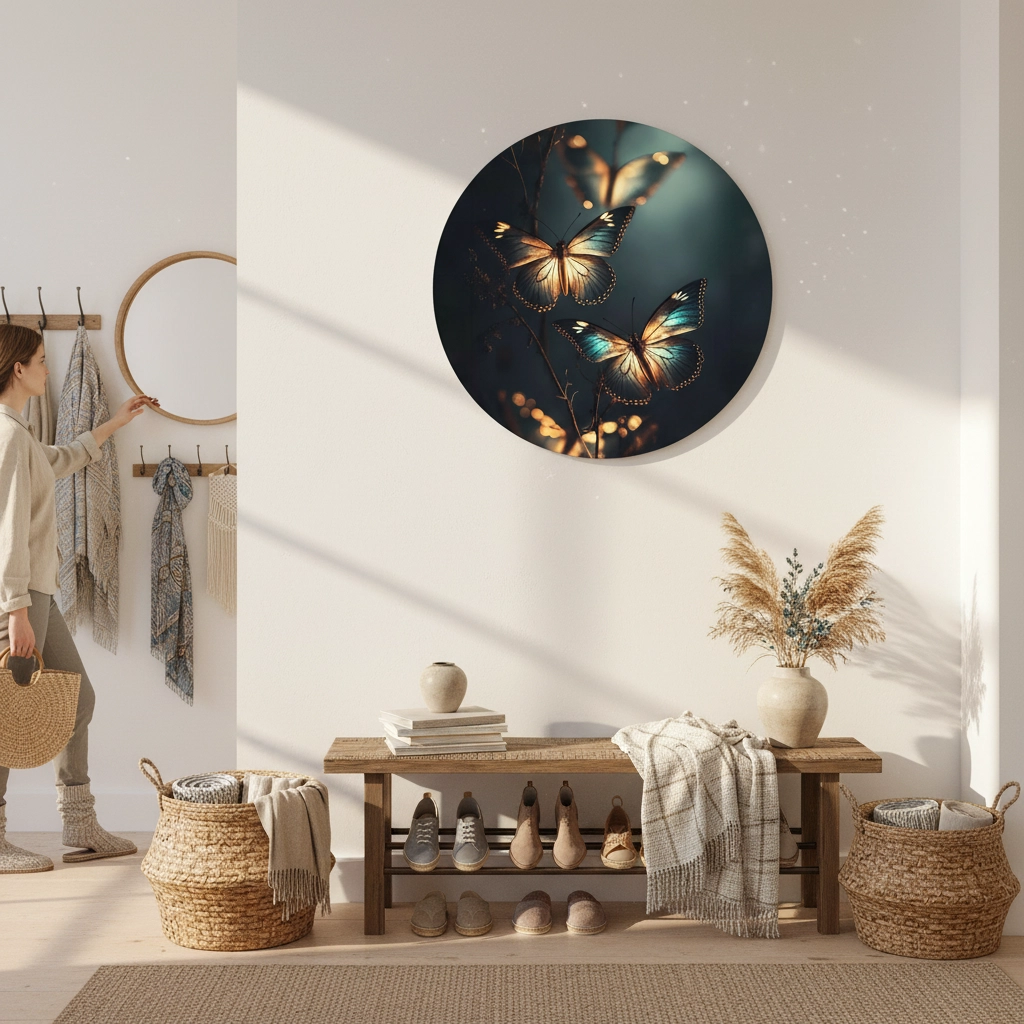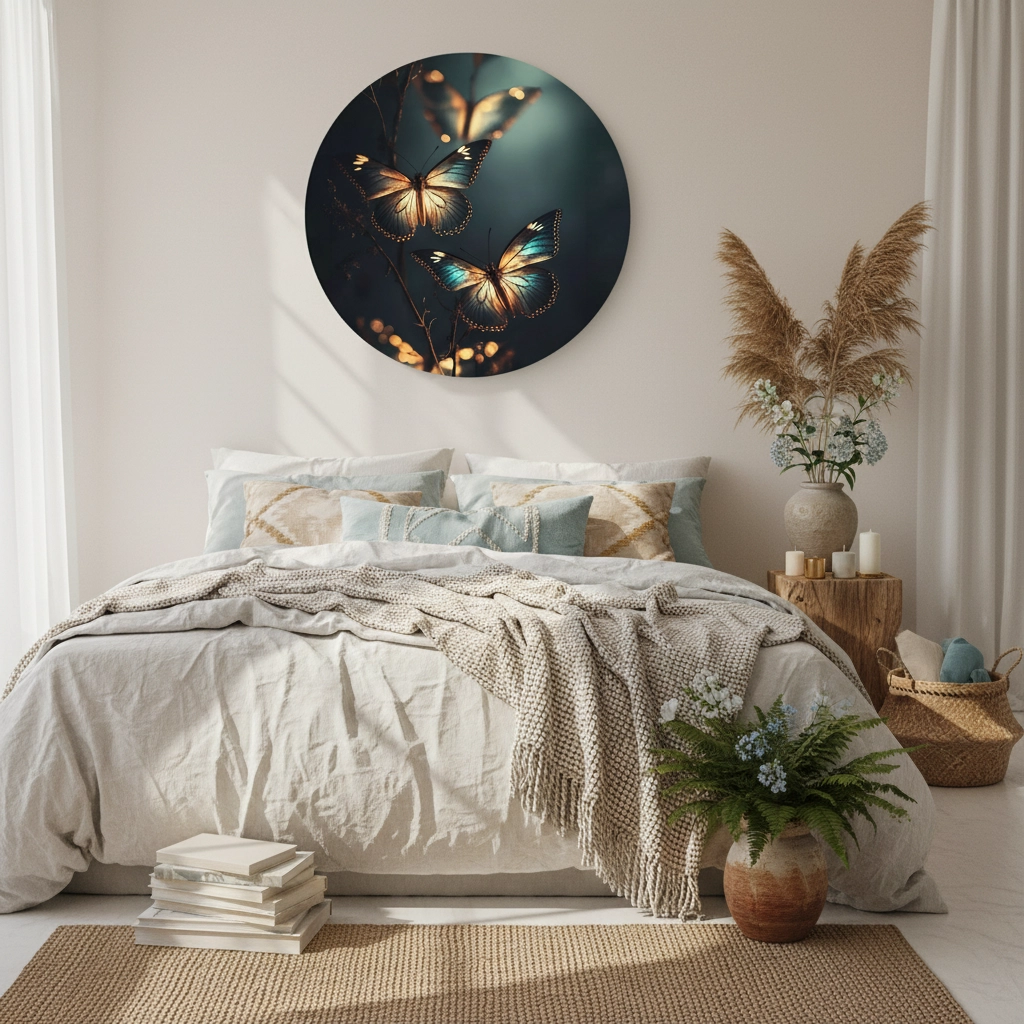 Een magisch beeld van blauwe vlinders met een warme, gouden lichtval—alsof het net “golden hour” is. De combinatie van diep blauw en zachte glans maakt dit kunstwerk speels én luxe tegelijk. Mooi in een licht interieur waar je net wat meer kleur en sfeer wil toevoegen, zonder dat het druk wordt.