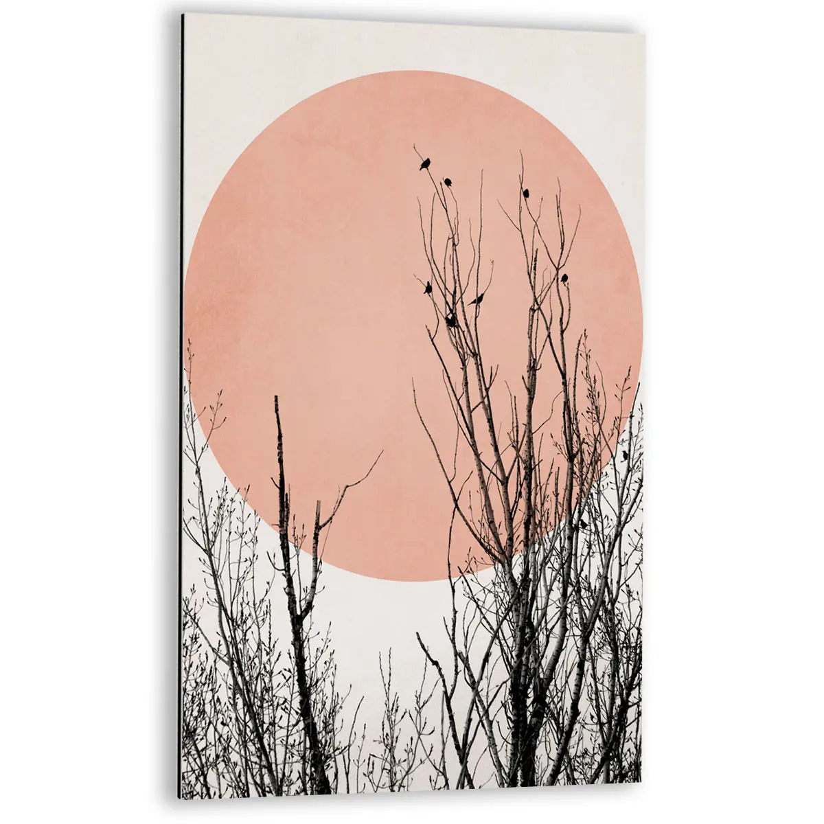 Een artistieke compositie van silhouet takken tegen een grote roze zon op een neutrale achtergrond. De contrast tussen de donkere, gedetailleerde takken en de zachte roze cirkel creëert een krachtig maar rustgevend beeld. Deze print voegt een moderne, minimalistische touch toe aan elk interieur en past perfect in een eigentijdse of Japans geïnspireerde woonstijl.