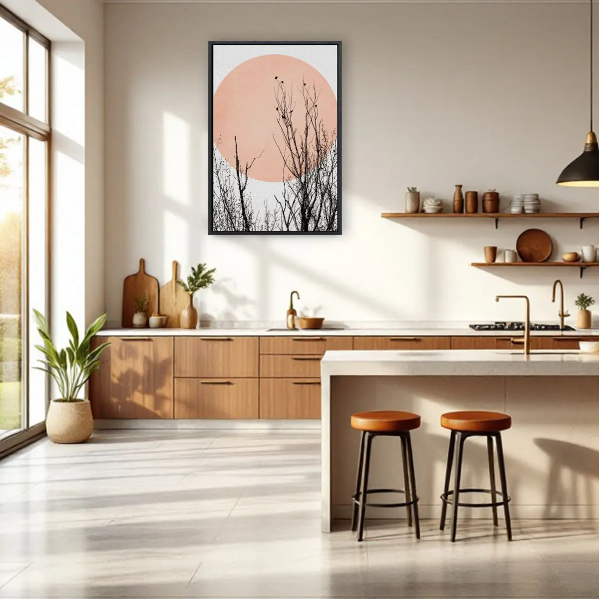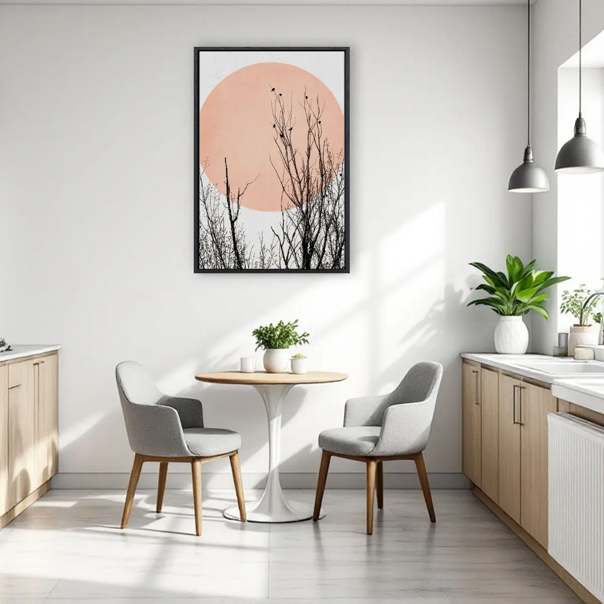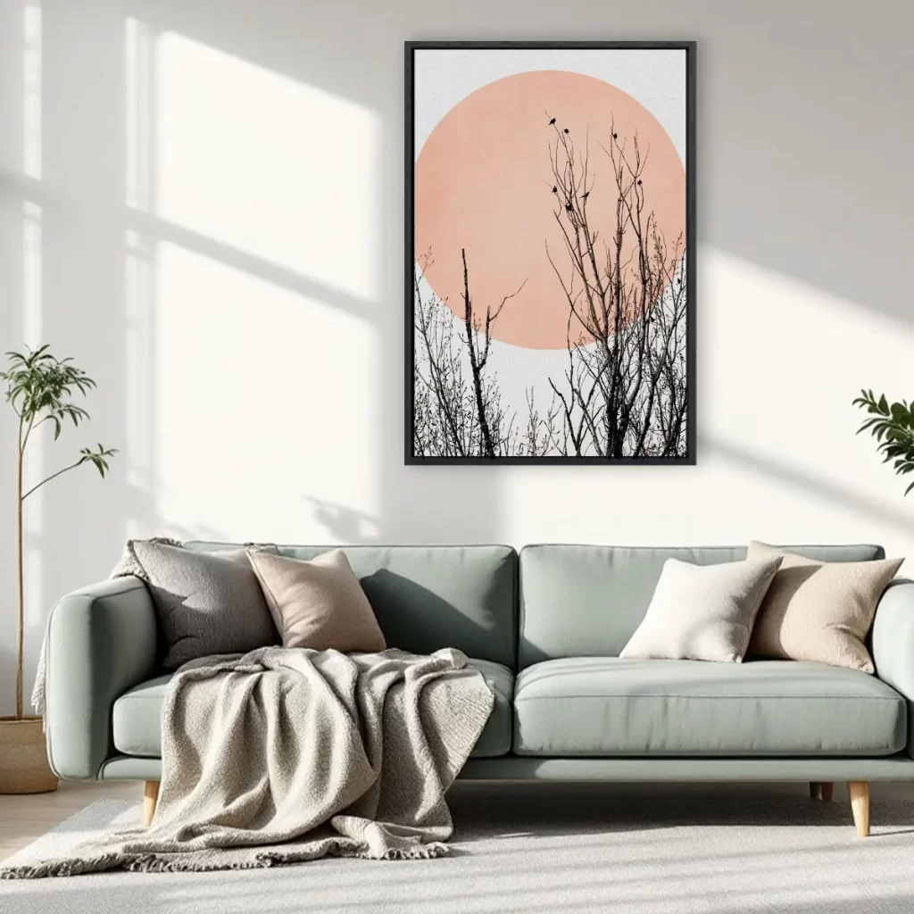 Een artistieke compositie van silhouet takken tegen een grote roze zon op een neutrale achtergrond. De contrast tussen de donkere, gedetailleerde takken en de zachte roze cirkel creëert een krachtig maar rustgevend beeld. Deze print voegt een moderne, minimalistische touch toe aan elk interieur en past perfect in een eigentijdse of Japans geïnspireerde woonstijl.