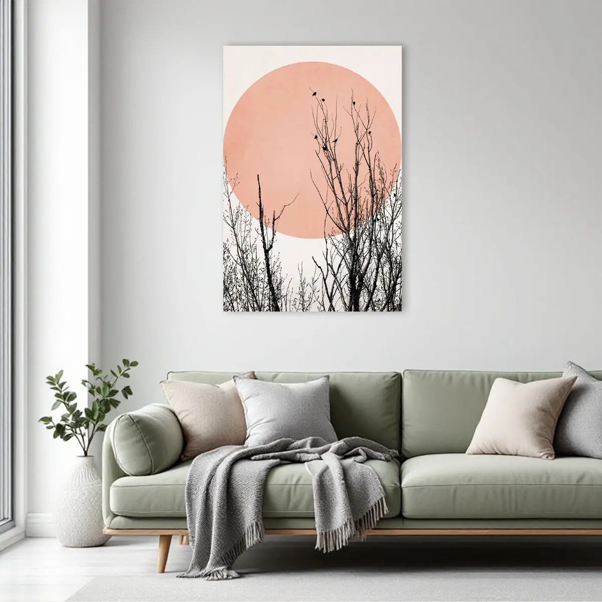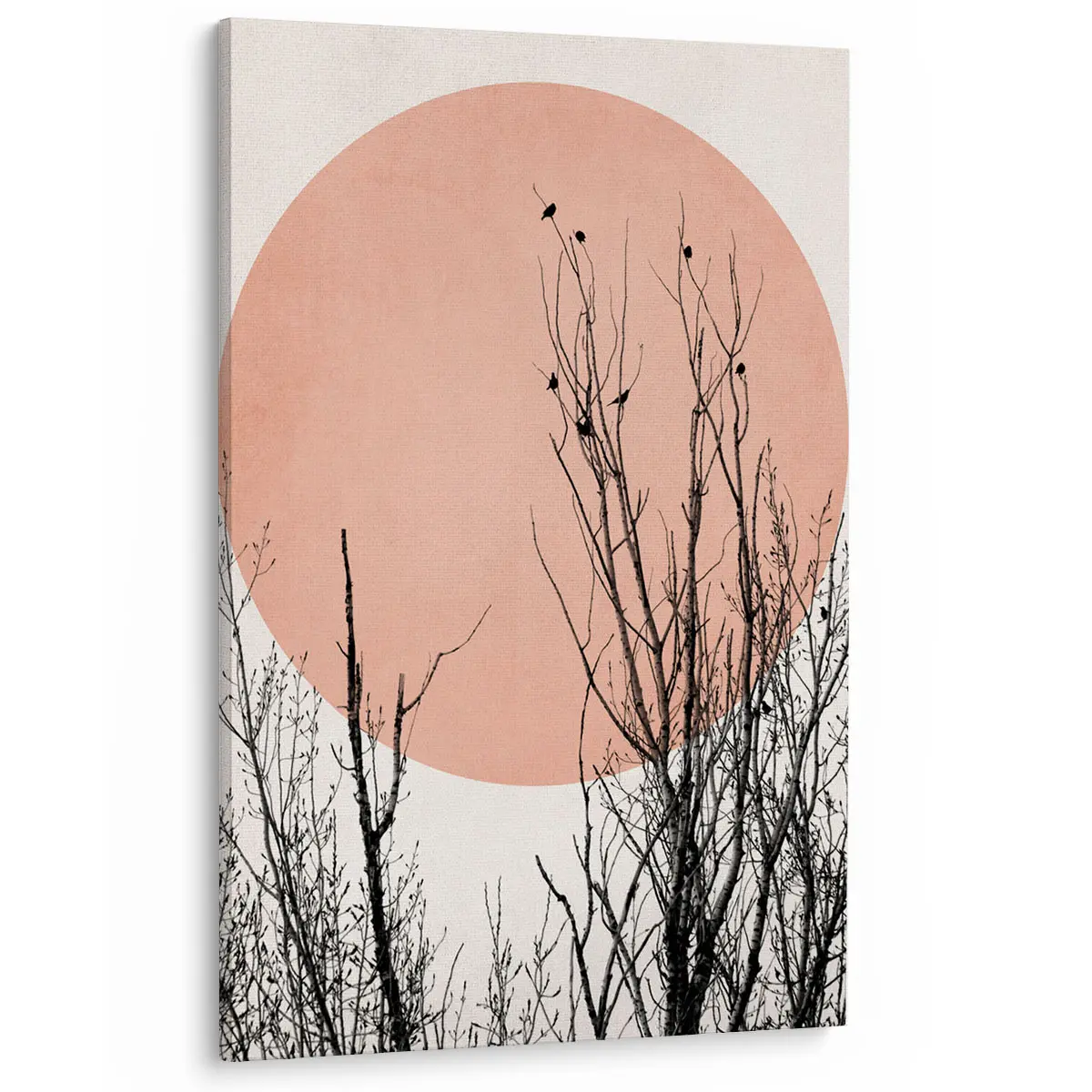Een artistieke compositie van silhouet takken tegen een grote roze zon op een neutrale achtergrond. De contrast tussen de donkere, gedetailleerde takken en de zachte roze cirkel creëert een krachtig maar rustgevend beeld. Deze print voegt een moderne, minimalistische touch toe aan elk interieur en past perfect in een eigentijdse of Japans geïnspireerde woonstijl.