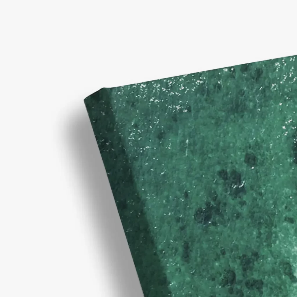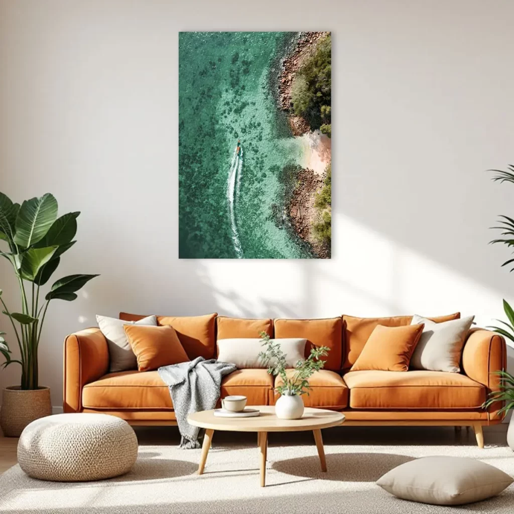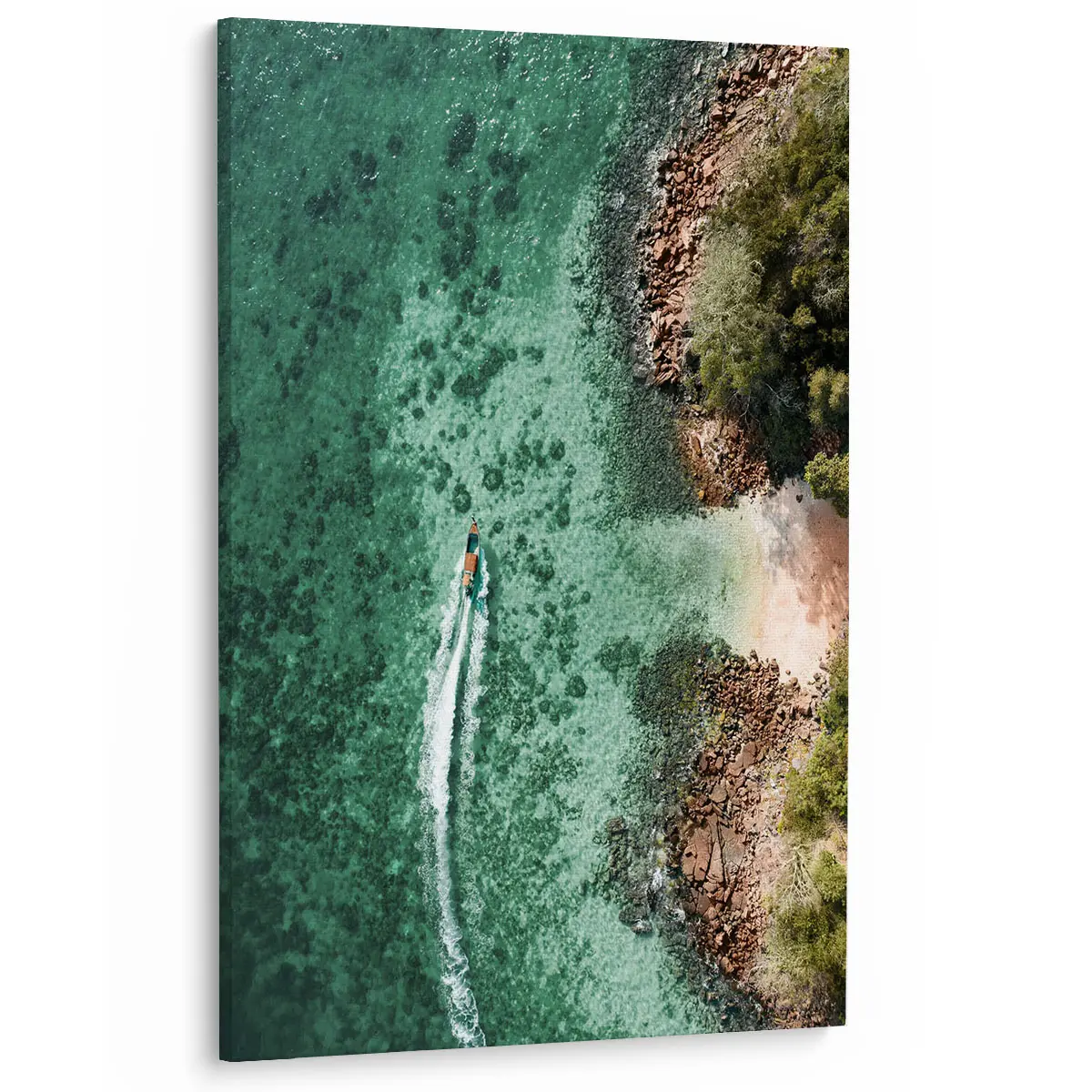 Een spectaculaire luchtfoto van een boot die door turquoise water vaart langs een rotsachtige kustlijn. Het contrast tussen het heldere water, de ruige rotsen en de weelderige groene vegetatie creëert een adembenemend tropisch tafereel. Deze print brengt direct vakantiegevoel en een gevoel van vrijheid in huis, perfect voor een modern of kustgeïnspireerd interieur.