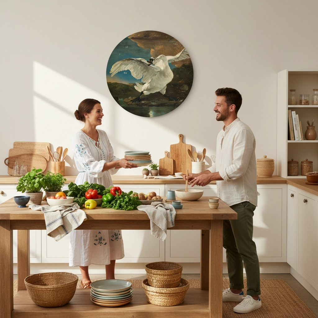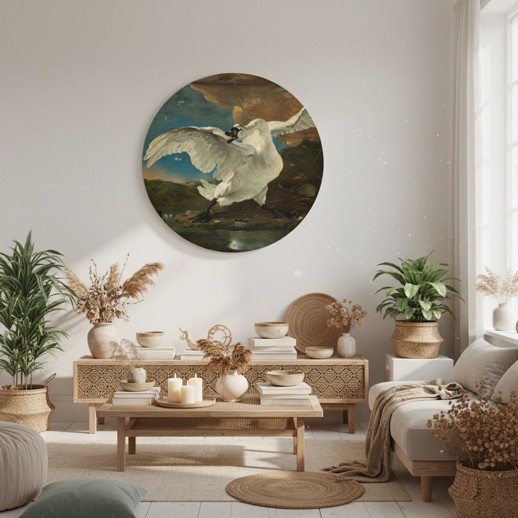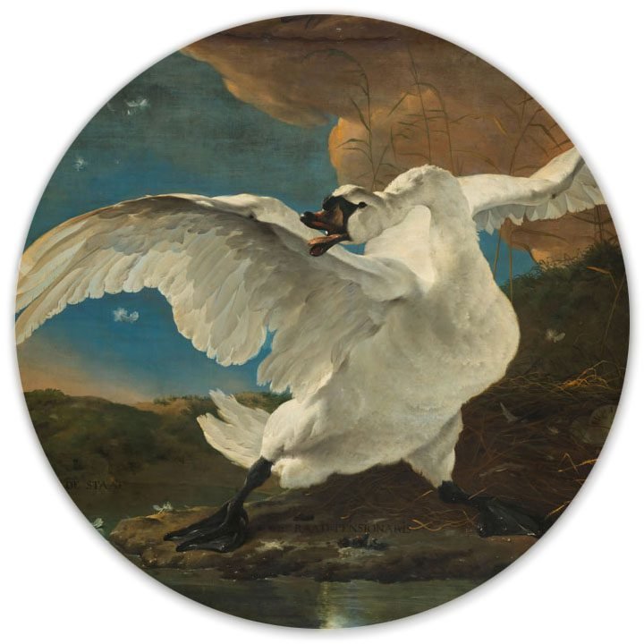 Een krachtig en dramatisch schilderij van een zwaan die haar nest verdedigt, met wijd gespreide vleugels en een intense uitstraling. De combinatie van zachte lichttinten in het verenkleed en de diepe blauw-groene achtergrond geeft het werk een tijdloze, museumwaardige sfeer. Een echte blikvanger die rust, karakter en klassieke elegantie toevoegt aan je interieur.