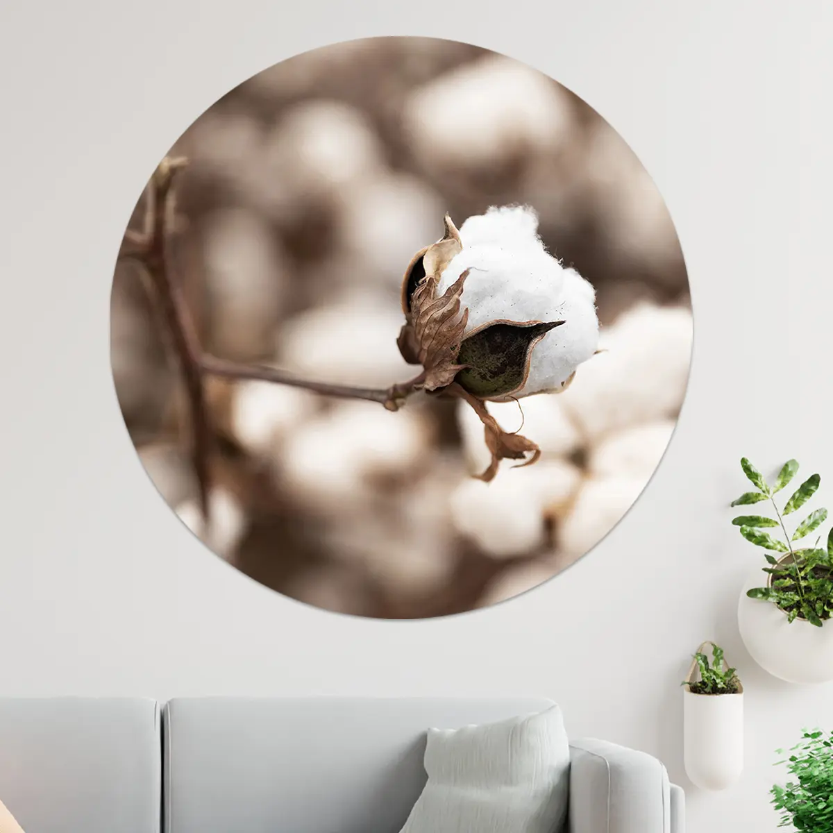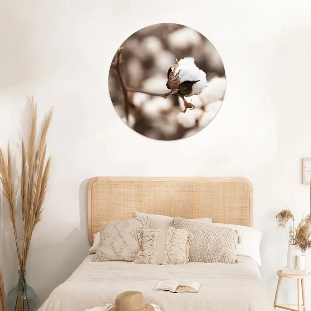Deze wanddecoratie legt de schoonheid van een katoenbloem vast in zijn meest pure vorm. Dit kunstwerk eert de fijne elegantie van de natuur en voegt een gevoel van vernieuwing en rust toe aan uw omgeving. Laat dit kunstwerk fungeren als een herinnering aan de kleine wonderen die ons omringen.
