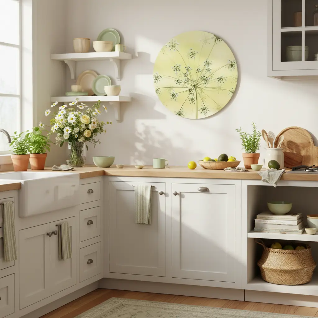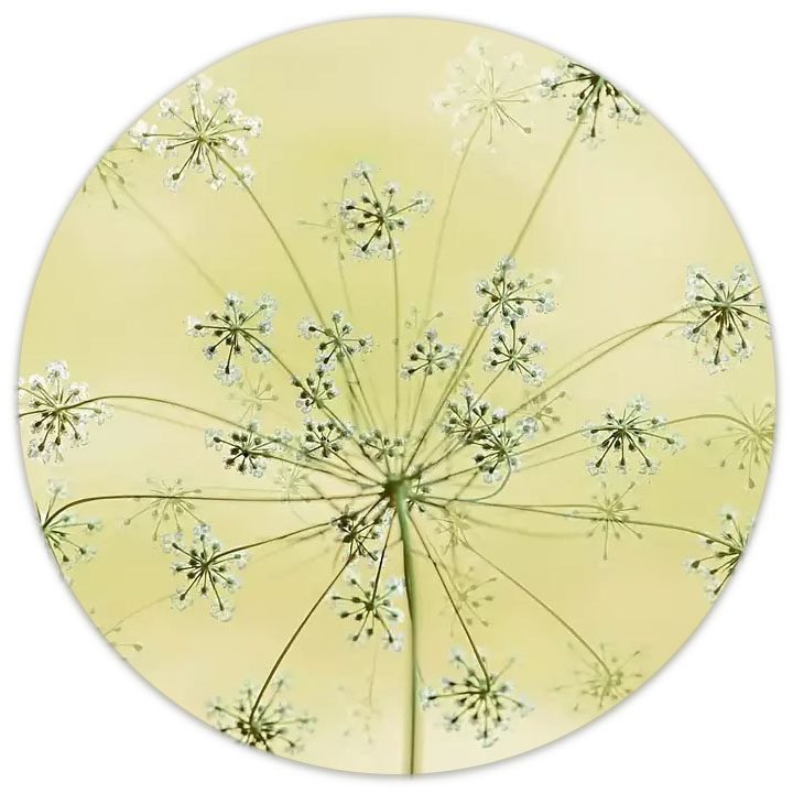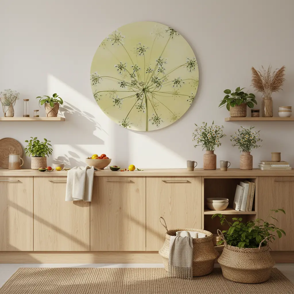 Deze muurcirkel toont een fijne dillebloem in zacht lichtgroen, met een luchtige en rustige uitstraling. De delicate bloemschermen en het subtiele kleurverloop geven je interieur een frisse, natuurlijke sfeer. Perfect voor een lichte boho setting met hout, linnen en zachte aardetinten.