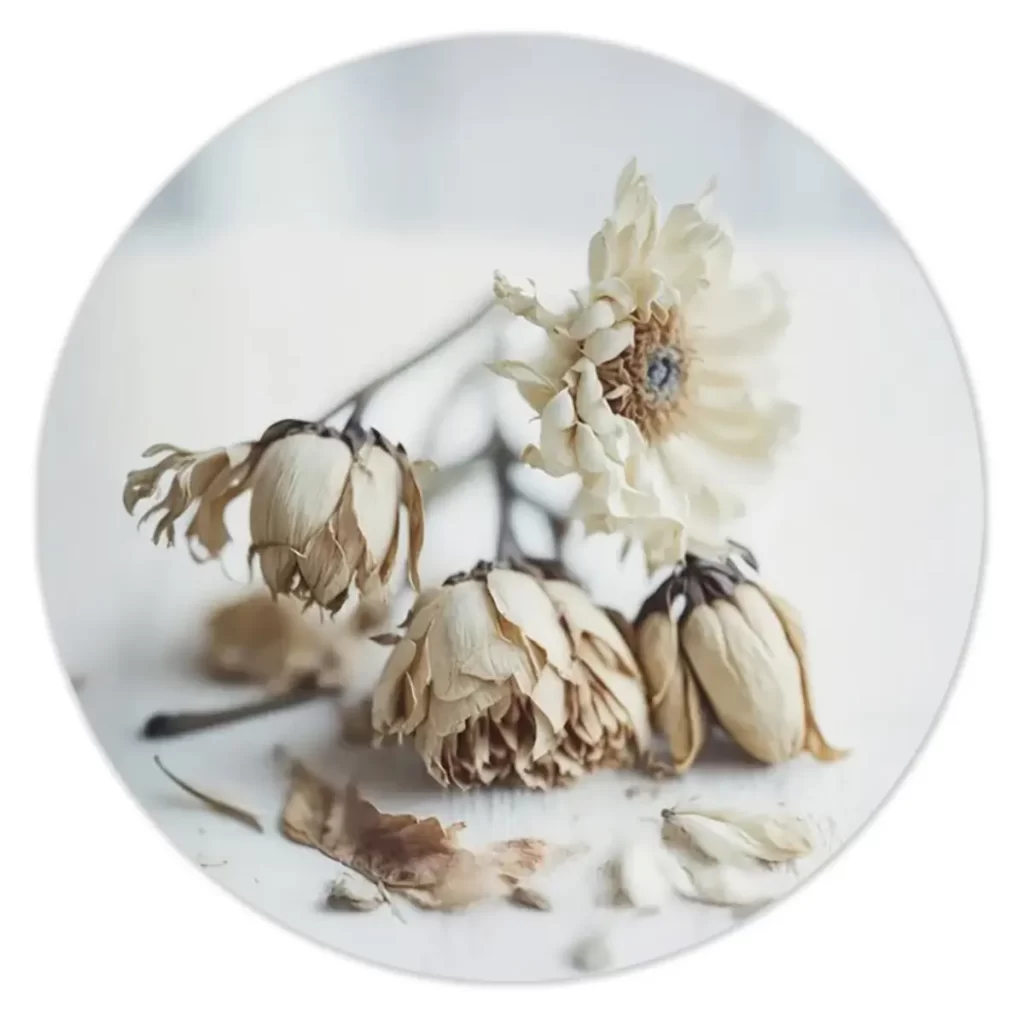 Deze artistieke compositie van uitgedroogde bloemen vertelt een verhaal van tijdloze elegantie. De zachte sepia tinten en de delicate texturen van de verwelkte bloemen creëren een sfeervolle, rustgevende wanddecoratie die perfect past in een minimalistisch of vintage interieur.