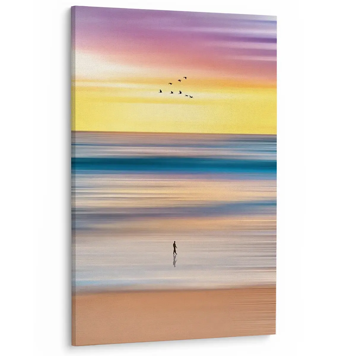 Een artistieke interpretatie van een strandwandeling, waarbij beweging en kleur samensmelten in een dromerige compositie.