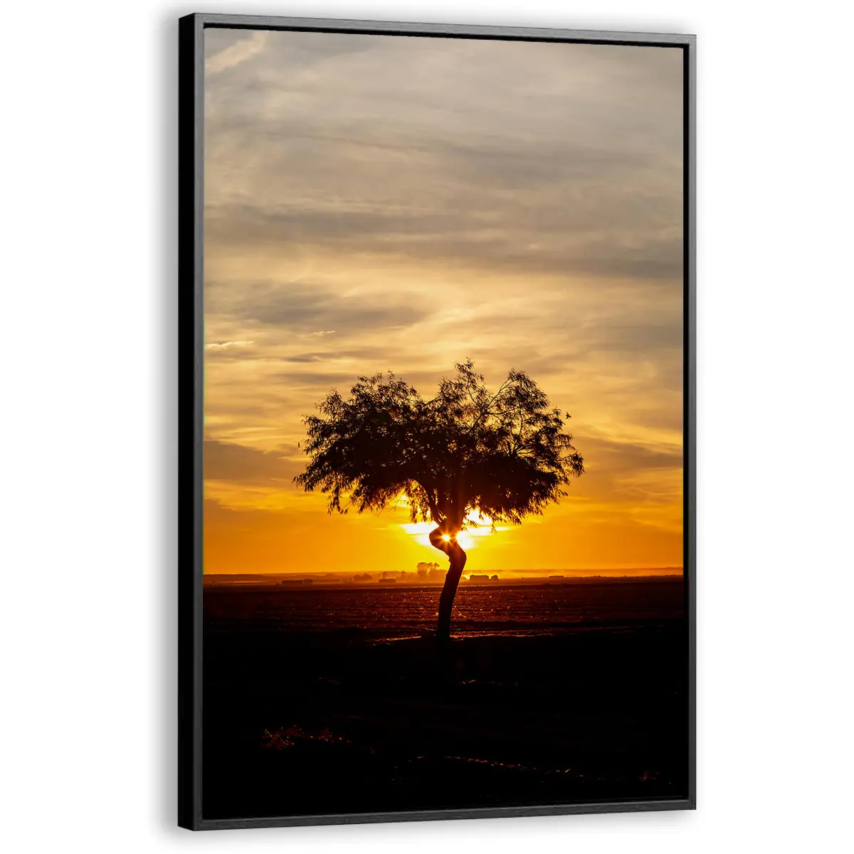 Een adembenemende zonsondergang met een solitaire boom als silhouet tegen de dramatische gouden hemel. De warme oranje en gele tinten van de lucht creëren een krachtige, emotionele sfeer die rust en contemplatie oproept. Als wanddecoratie brengt deze print een gevoel van sereniteit en natuurlijke schoonheid in elk interieur, perfect voor ruimtes waar je een moment van stilte en bezinning wilt creëren.