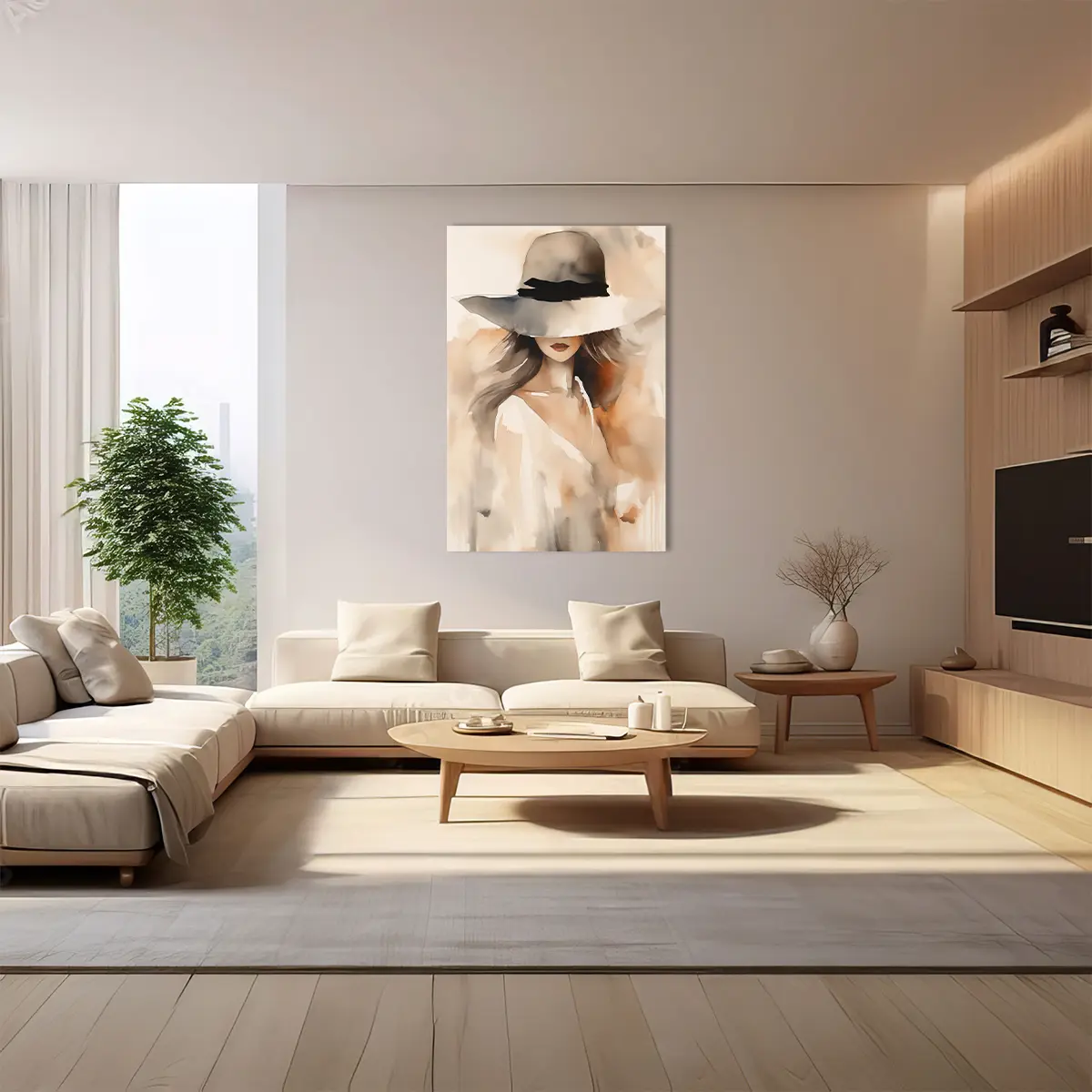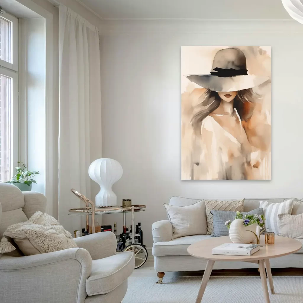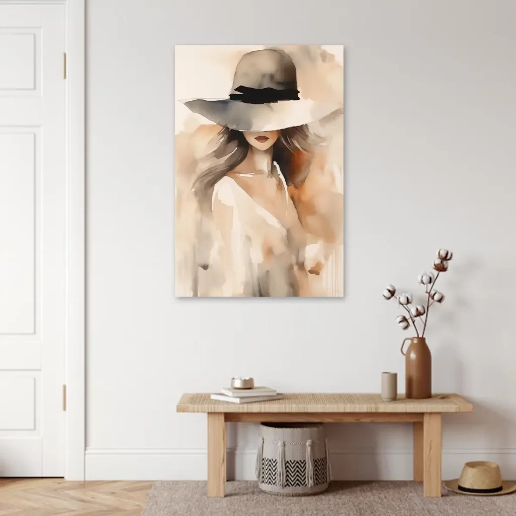 Een verfijnde aquarel van een elegante vrouw met een grote hoed, uitgevoerd in zachte, neutrale tinten. De vloeiende penseelstreken en de subtiele kleurovergangen creëren een tijdloze, romantische uitstraling. Als wanddecoratie voegt deze print een vleugje elegantie en artistieke verfijning toe aan elk interieur, perfect voor een slaapkamer of kleedkamer.