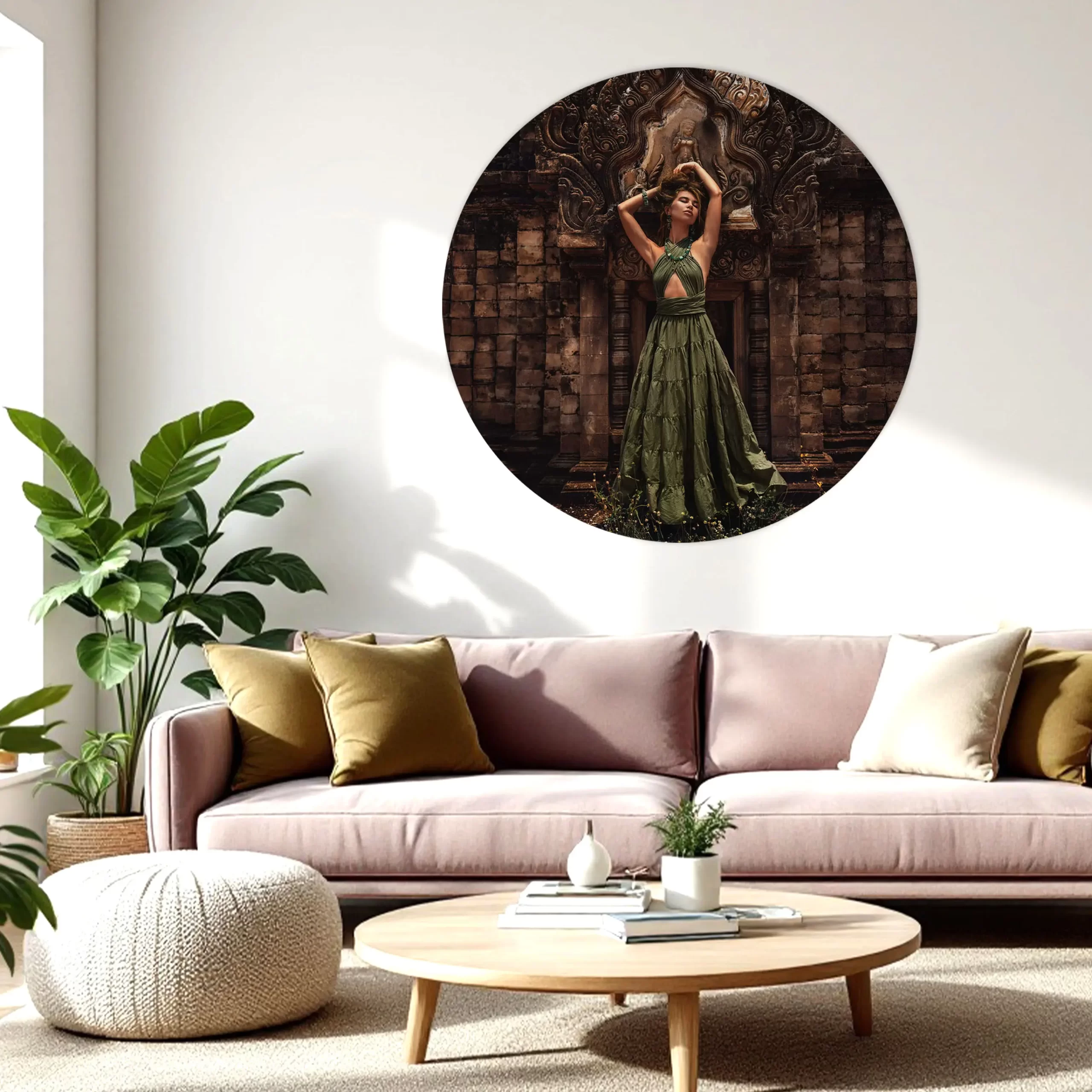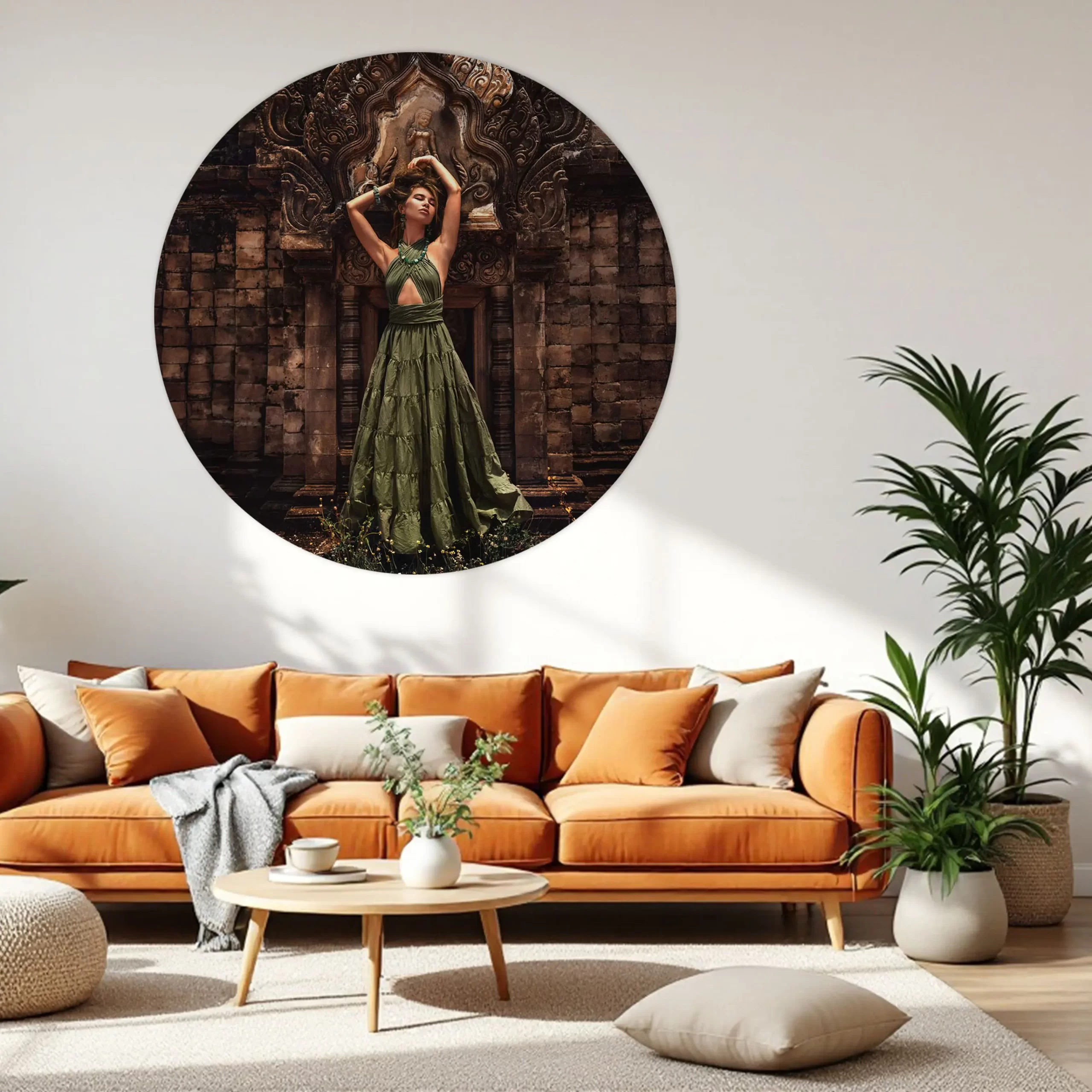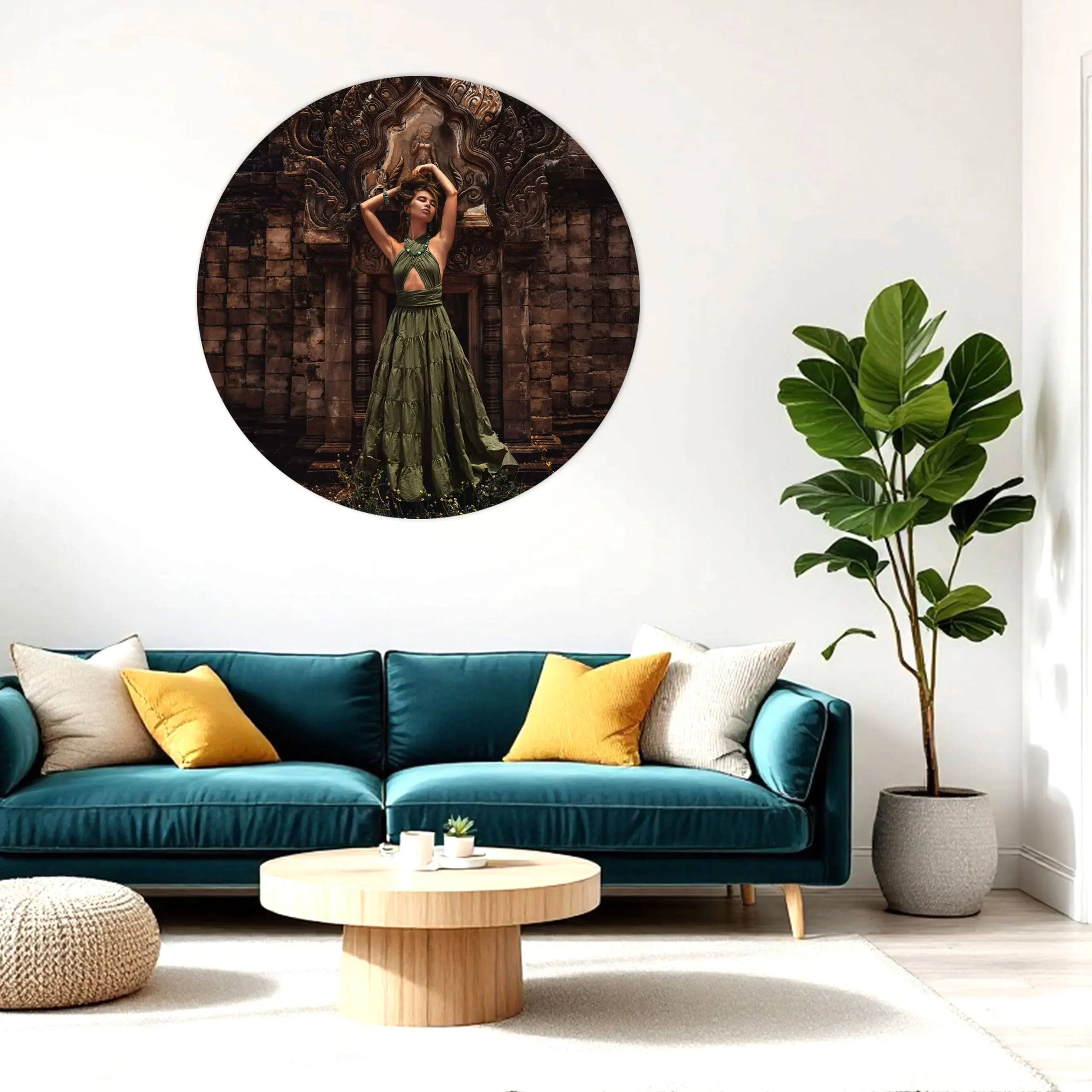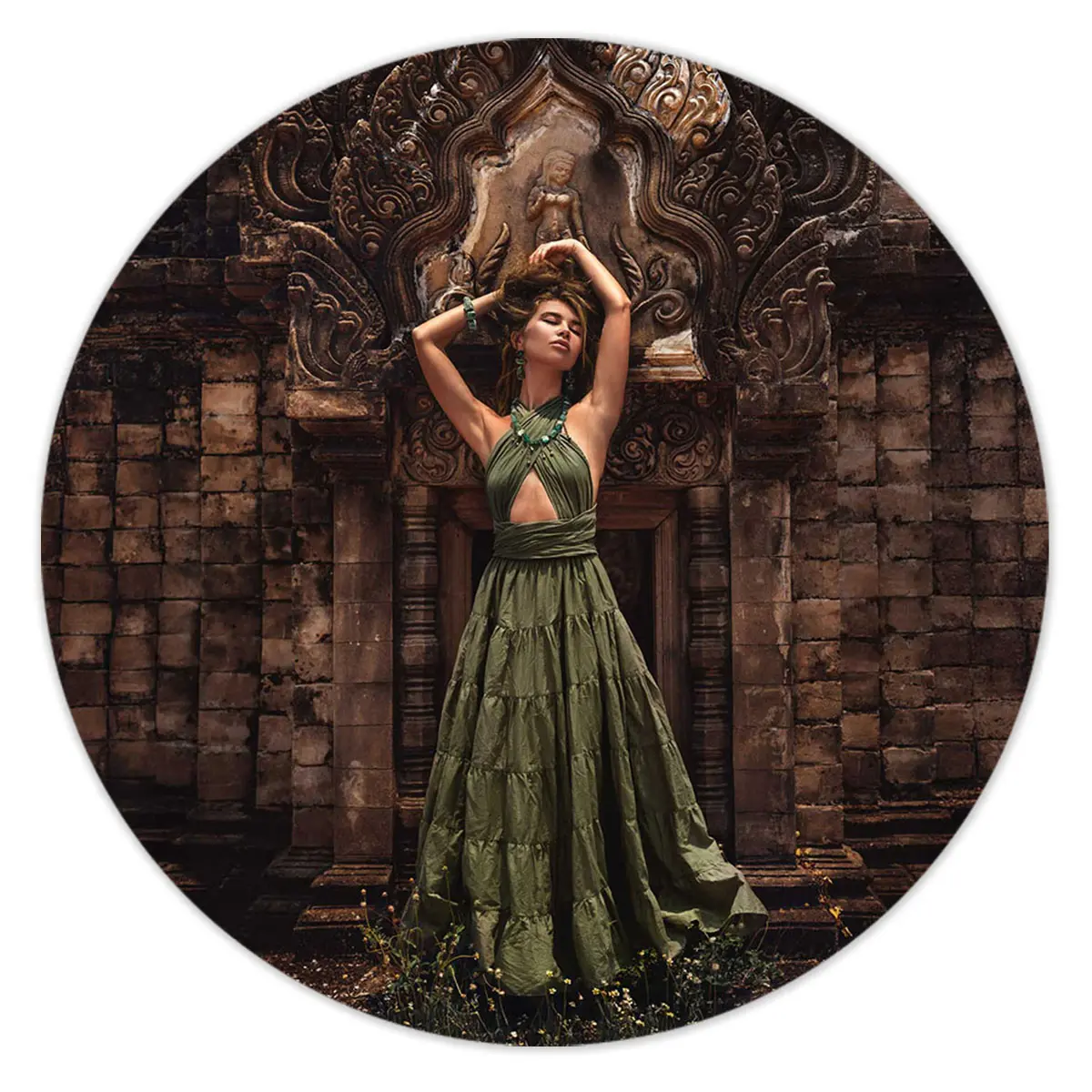 Een stijlvolle compositie van een vrouw in een prachtige groene jurk tegen de achtergrond van een rijk versierde tempelpoort. De warme bruintinten van de oude stenen contrasteren prachtig met het levendige groen van haar jurk en sieraden. Deze print combineert mode, cultuur en architectuur in één krachtig beeld dat perfect past in een modern of werelds interieur.