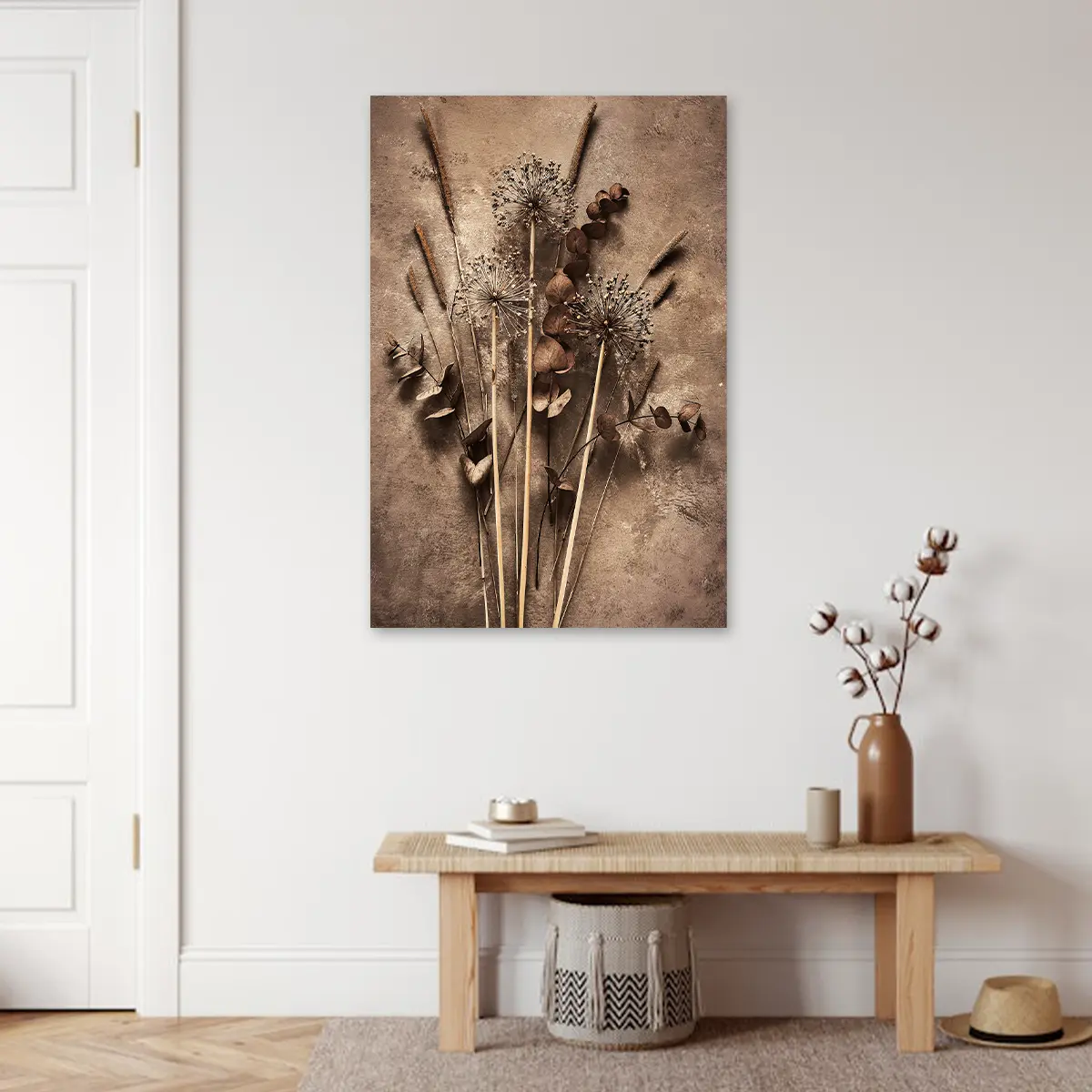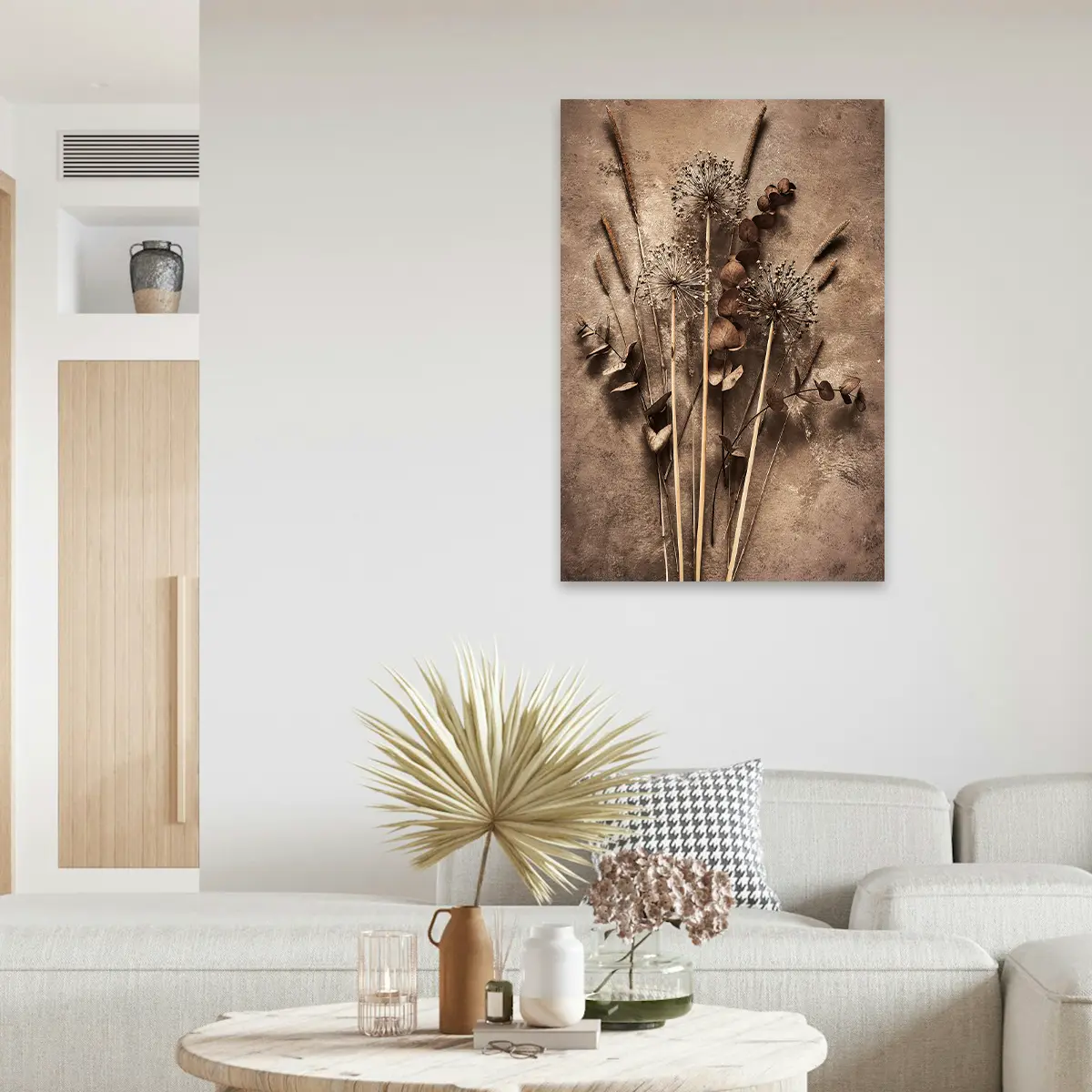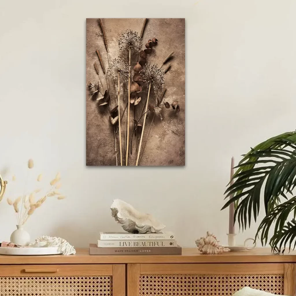 Een artistieke compositie van silhouet takken tegen een grote roze zon op een neutrale achtergrond. De contrast tussen de donkere, gedetailleerde takken en de zachte roze cirkel creëert een krachtig maar rustgevend beeld. Deze print voegt een moderne, minimalistische touch toe aan elk interieur en past perfect in een eigentijdse of Japans geïnspireerde woonstijl.