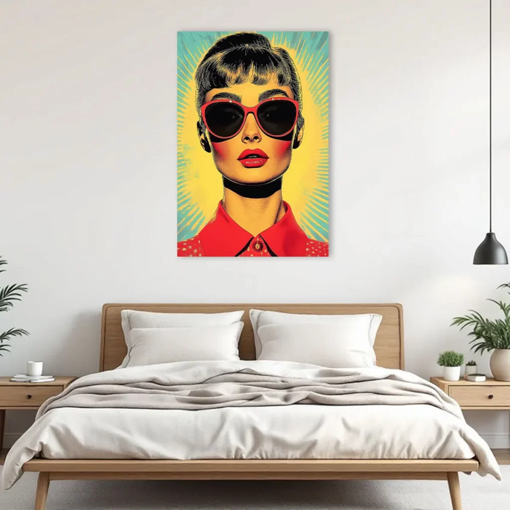 Een krachtige pop art interpretatie van een glamoureuze vrouw met rode zonnebril en lippen tegen een levendige geel-groene achtergrond. De vintage jaren ’60 esthetiek en de gedurfde kleurcombinaties maken deze print tot een echte eyecatcher. Als wanddecoratie voegt dit kunstwerk direct karakter en retro glamour toe aan elk modern interieur, perfect voor liefhebbers van vintage design en pop art.