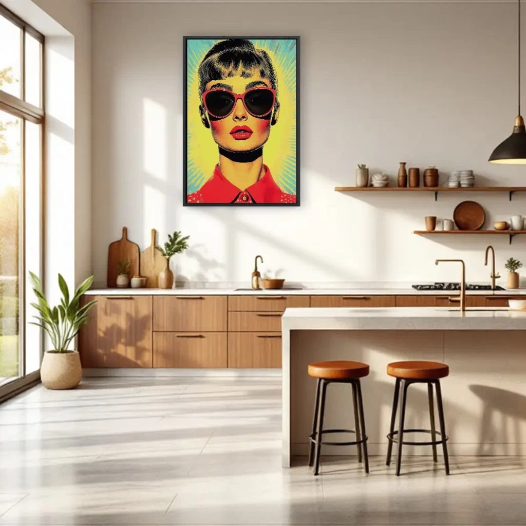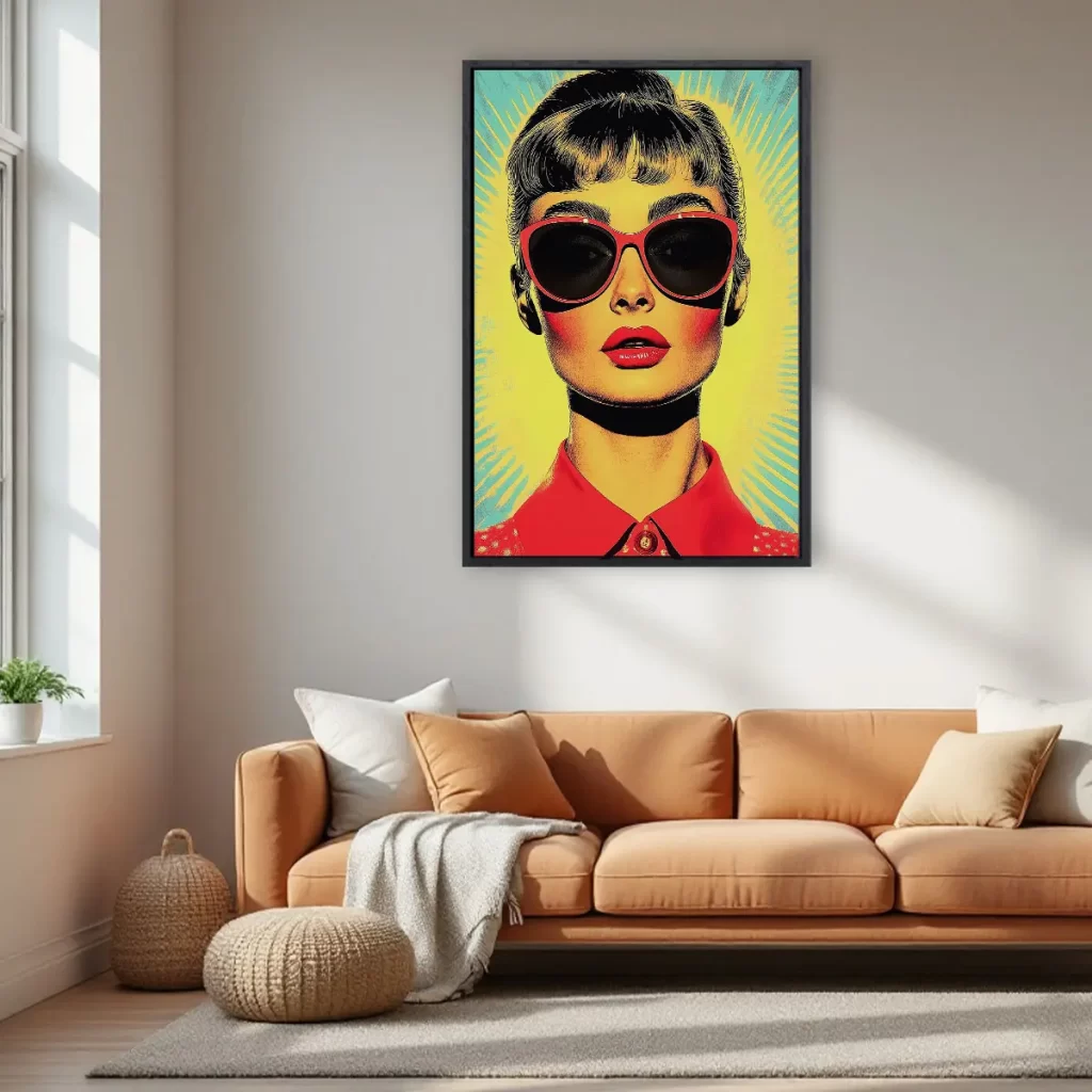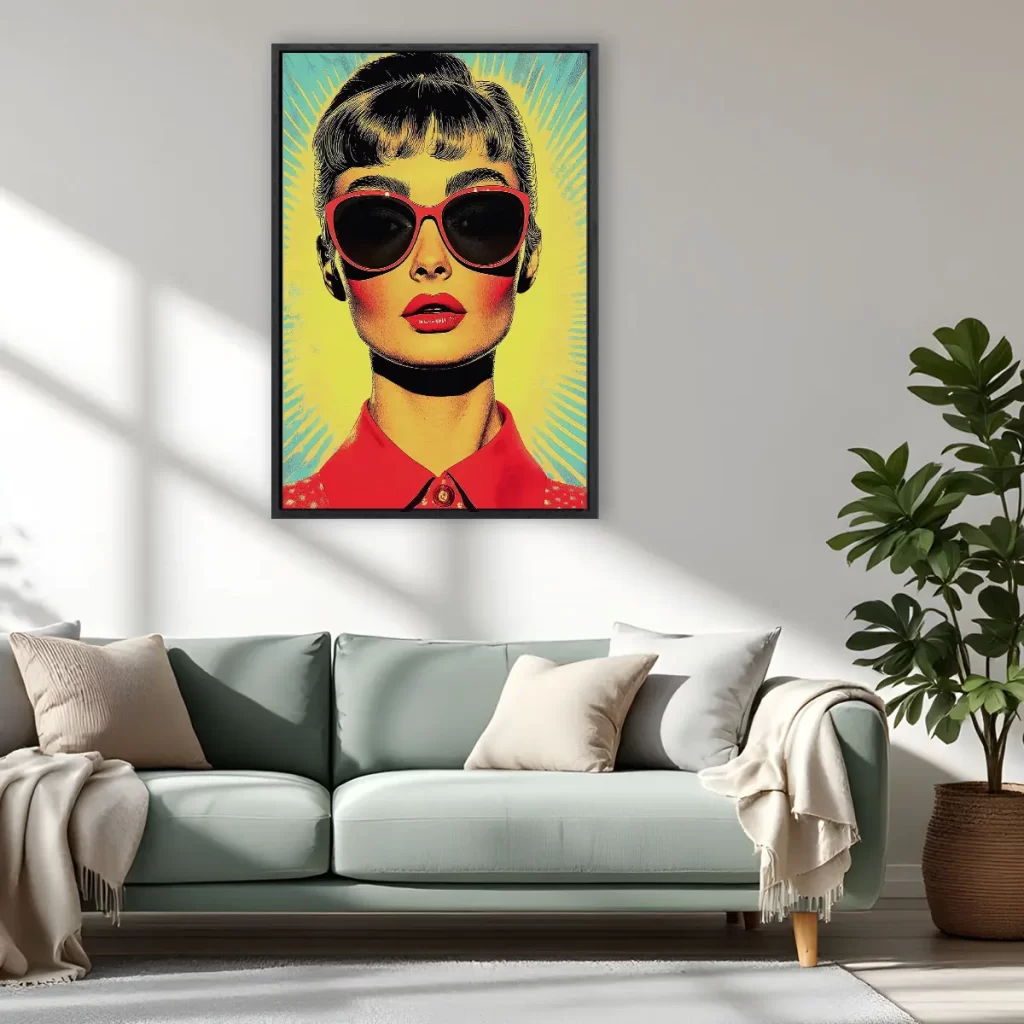 Een krachtige pop art interpretatie van een glamoureuze vrouw met rode zonnebril en lippen tegen een levendige geel-groene achtergrond. De vintage jaren '60 esthetiek en de gedurfde kleurcombinaties maken deze print tot een echte eyecatcher. Als wanddecoratie voegt dit kunstwerk direct karakter en retro glamour toe aan elk modern interieur, perfect voor liefhebbers van vintage design en pop art.