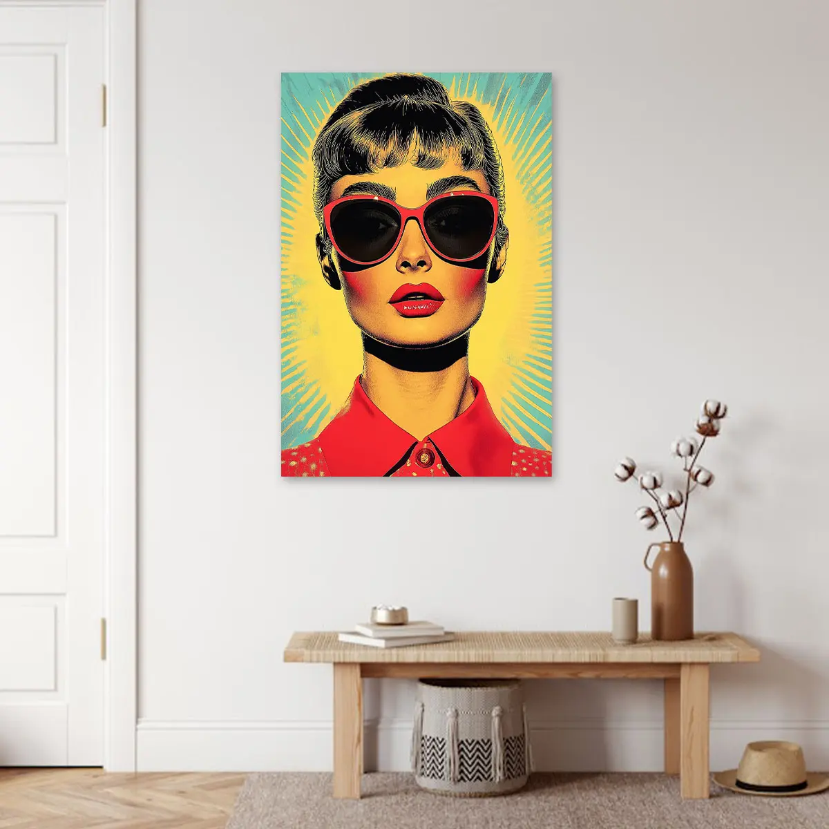 Een krachtige pop art interpretatie van een glamoureuze vrouw met rode zonnebril en lippen tegen een levendige geel-groene achtergrond. De vintage jaren ’60 esthetiek en de gedurfde kleurcombinaties maken deze print tot een echte eyecatcher. Als wanddecoratie voegt dit kunstwerk direct karakter en retro glamour toe aan elk modern interieur, perfect voor liefhebbers van vintage design en pop art.
