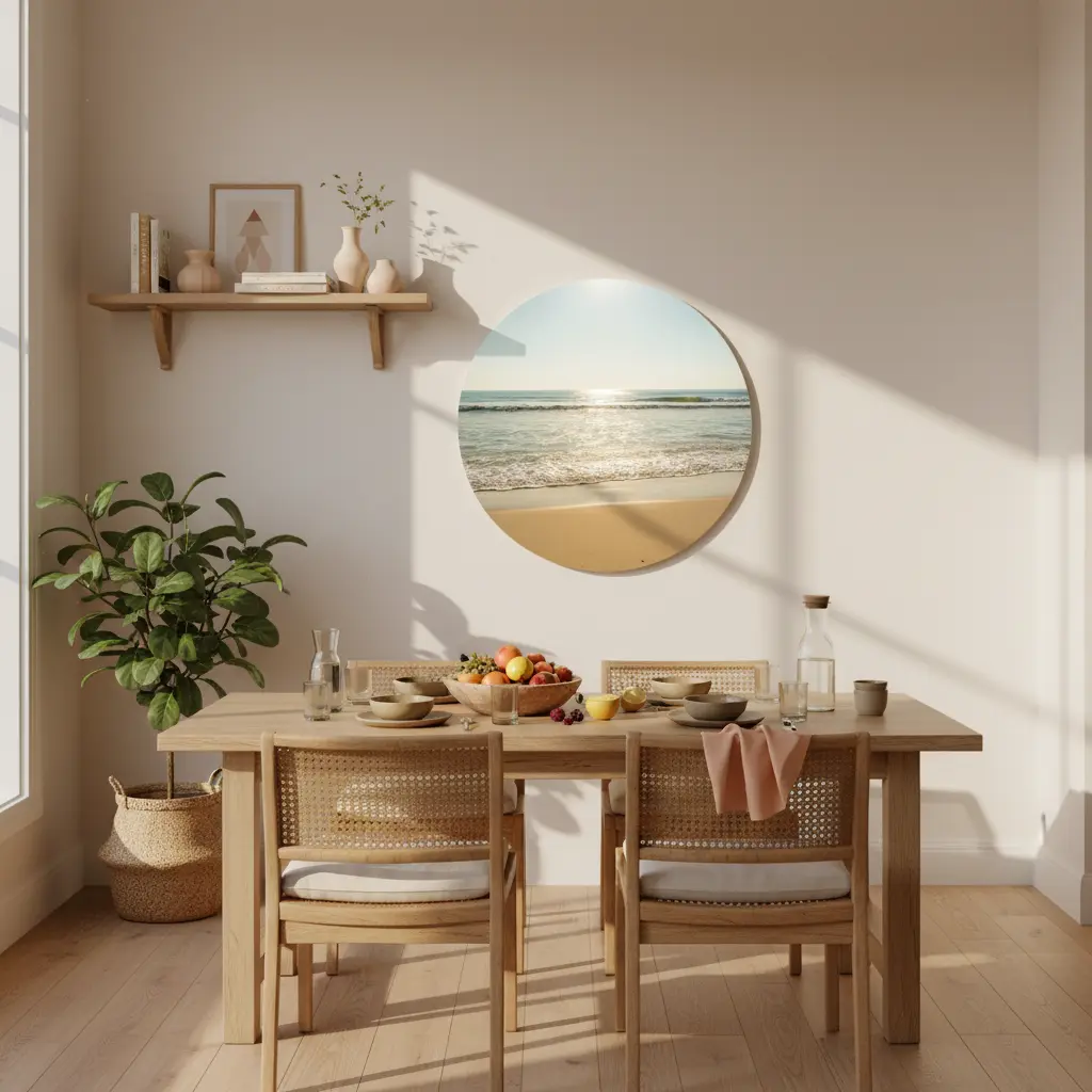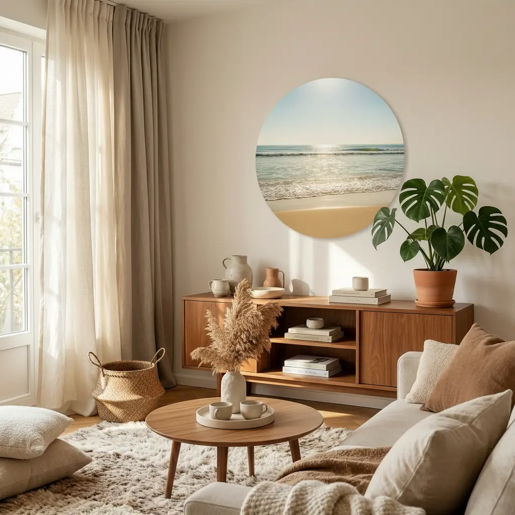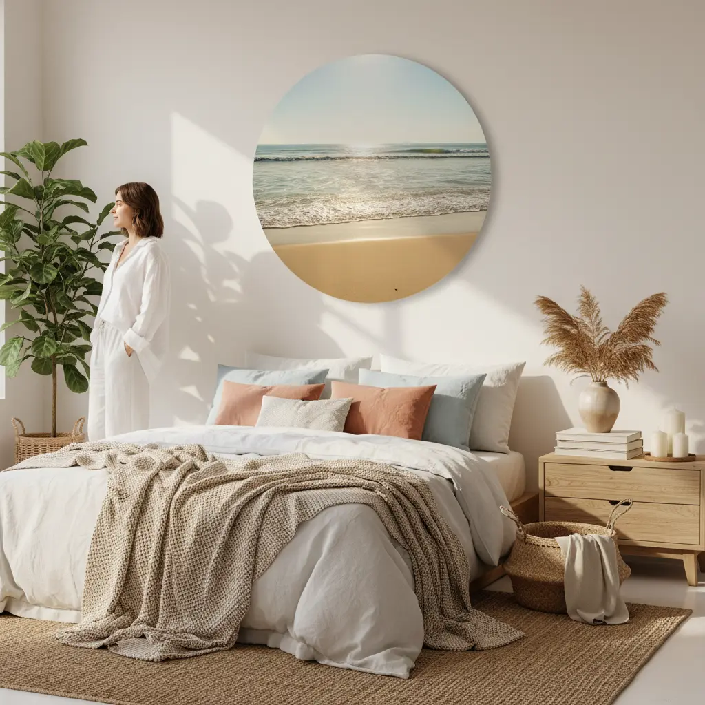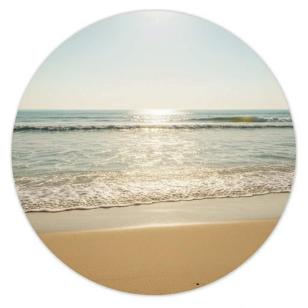 Een warme fotokunst print van zachte golven die breken op een licht zandstrand, met gouden reflecties in het water door de felle middagzon. De matte fine-art uitstraling en rustige horizon geven deze muurcirkel een premium, boho-vriendelijke look.