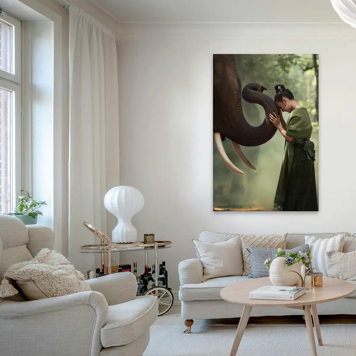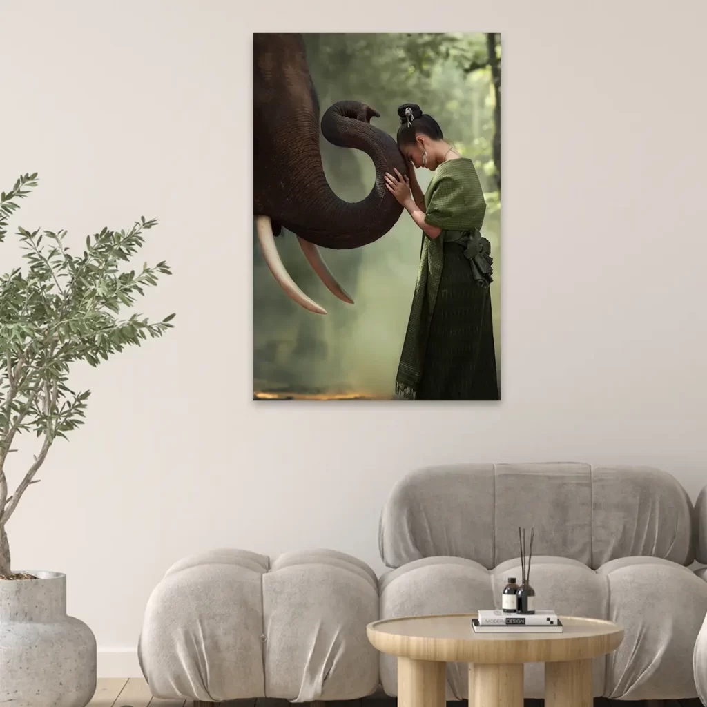 Een indrukwekkend beeld van een intiem moment tussen een vrouw in traditionele Thaise kleding en een majestueuze olifant. De zachte groene tinten van haar kleding harmoniëren prachtig met de natuurlijke achtergrond, terwijl het moment van verbinding een gevoel van rust en respect voor de natuur oproept. Als wanddecoratie brengt deze print een vleugje Aziatische sereniteit en culturele diepgang in elk interieur.