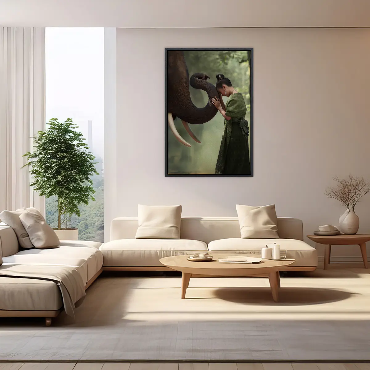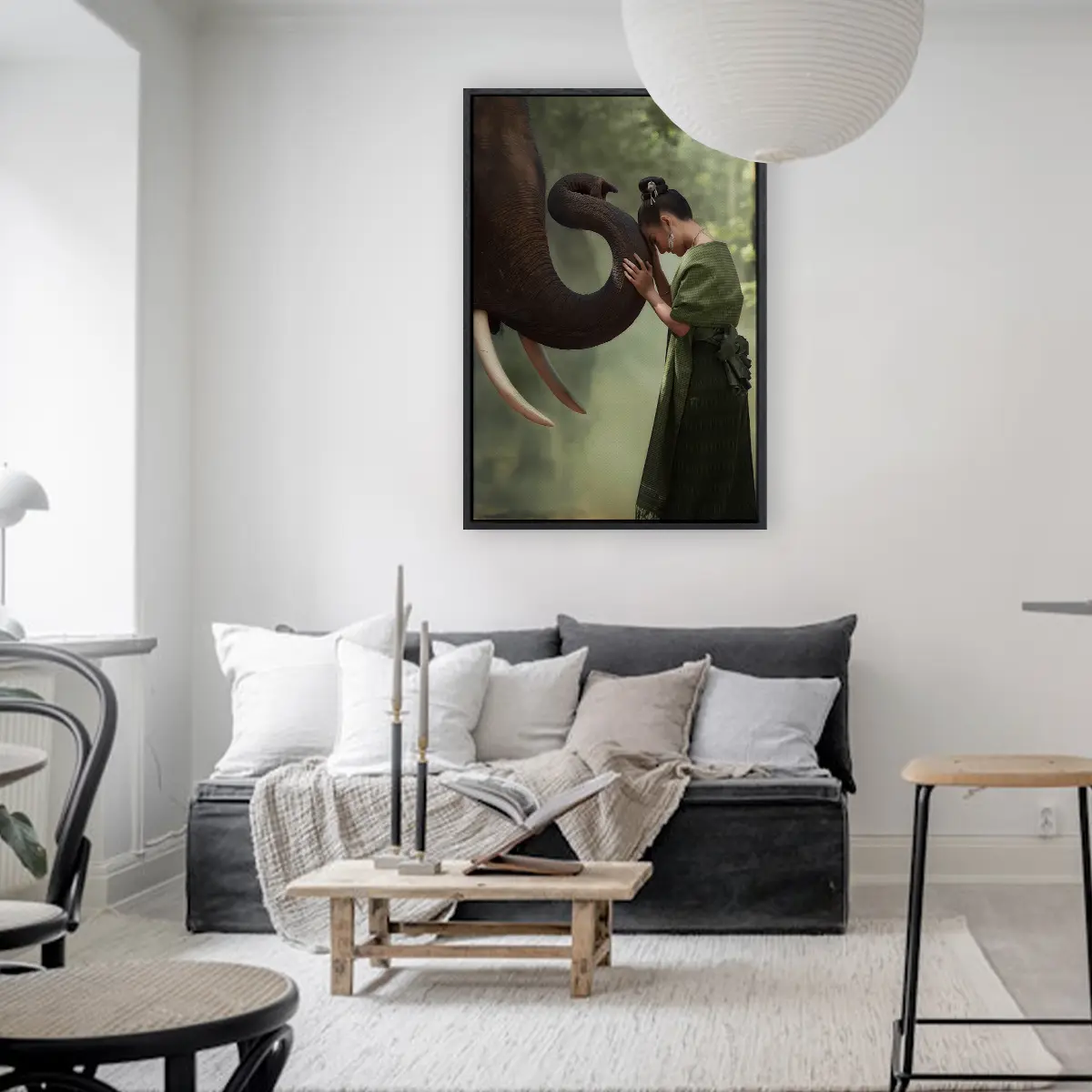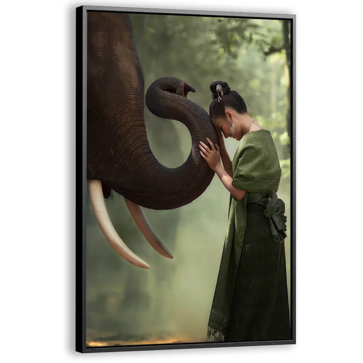 Een indrukwekkend beeld van een intiem moment tussen een vrouw in traditionele Thaise kleding en een majestueuze olifant. De zachte groene tinten van haar kleding harmoniëren prachtig met de natuurlijke achtergrond, terwijl het moment van verbinding een gevoel van rust en respect voor de natuur oproept. Als wanddecoratie brengt deze print een vleugje Aziatische sereniteit en culturele diepgang in elk interieur.