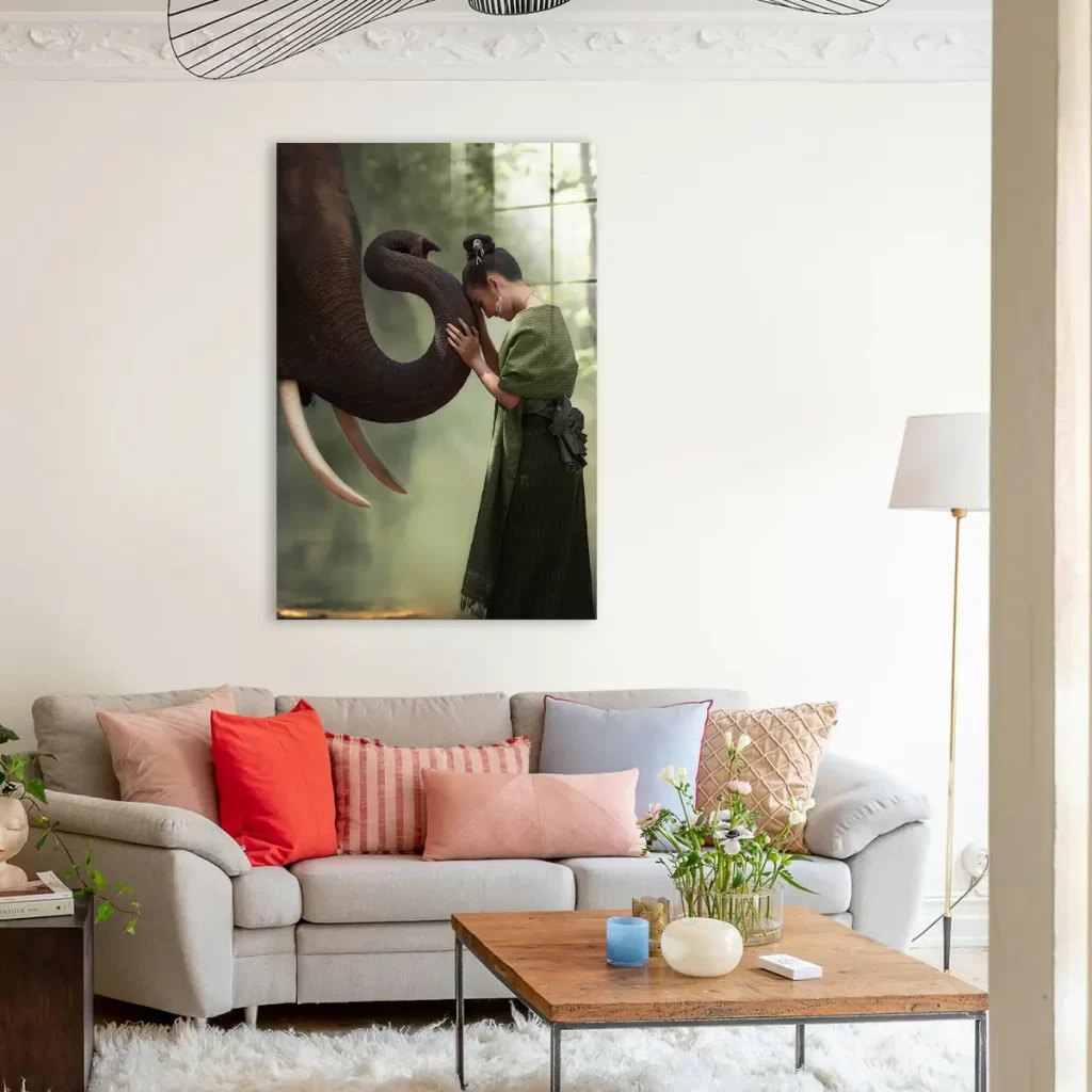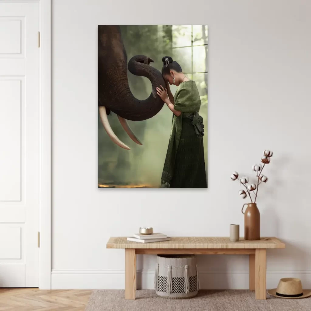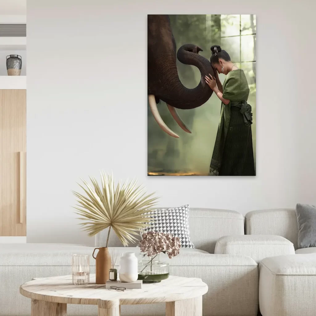 Een indrukwekkend beeld van een intiem moment tussen een vrouw in traditionele Thaise kleding en een majestueuze olifant. De zachte groene tinten van haar kleding harmoniëren prachtig met de natuurlijke achtergrond, terwijl het moment van verbinding een gevoel van rust en respect voor de natuur oproept. Als wanddecoratie brengt deze print een vleugje Aziatische sereniteit en culturele diepgang in elk interieur.