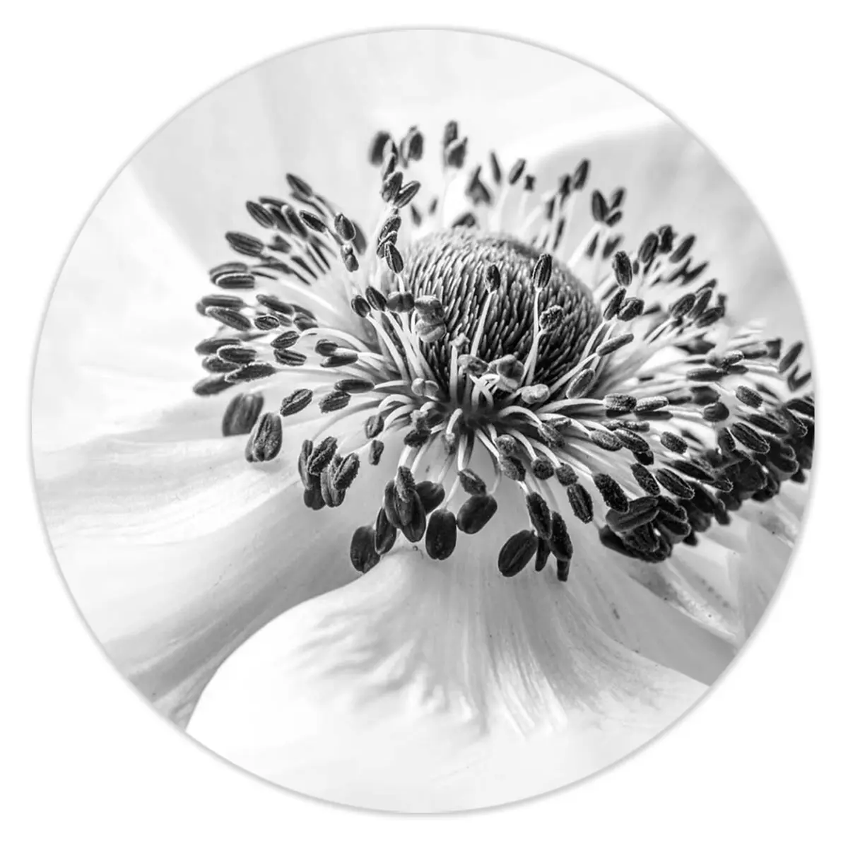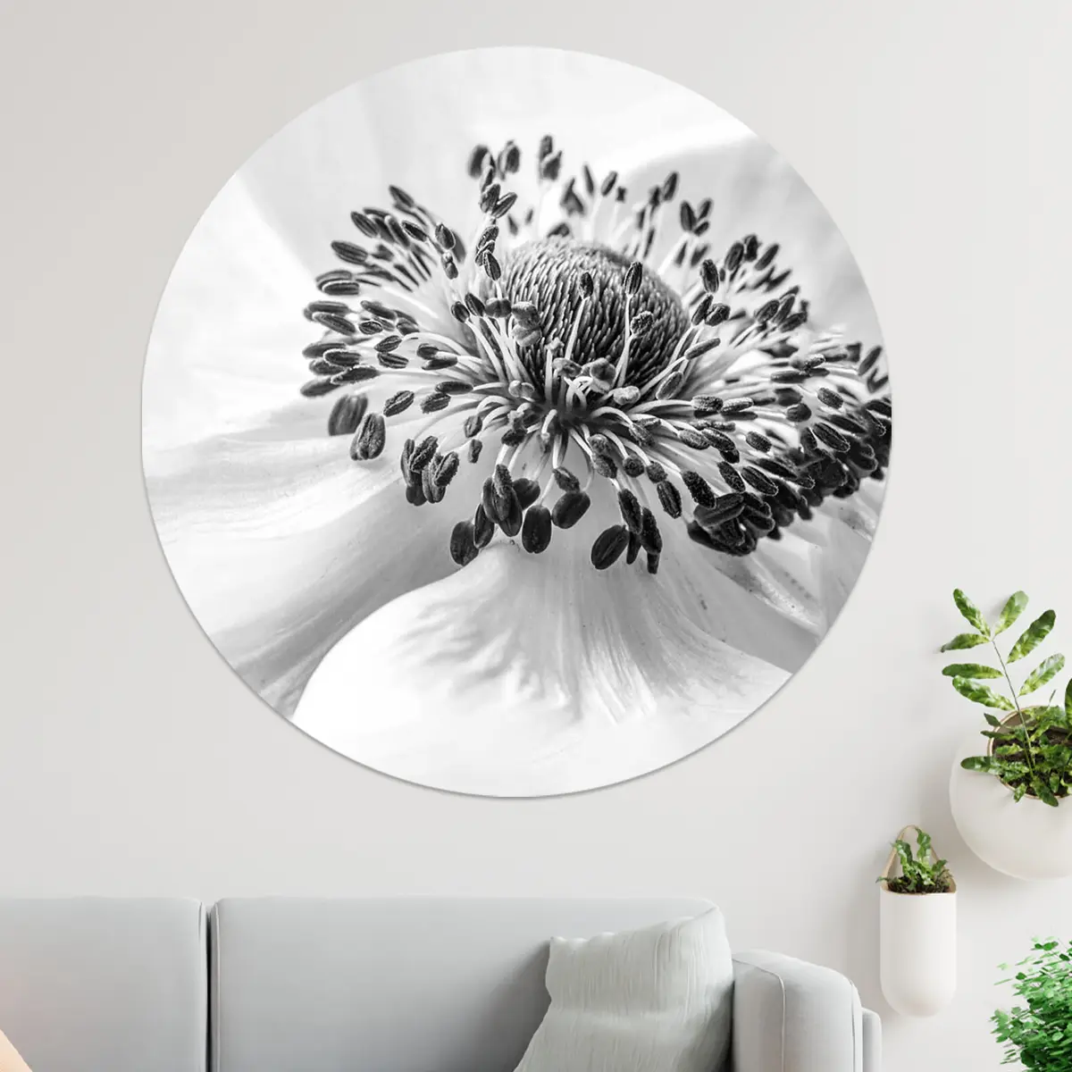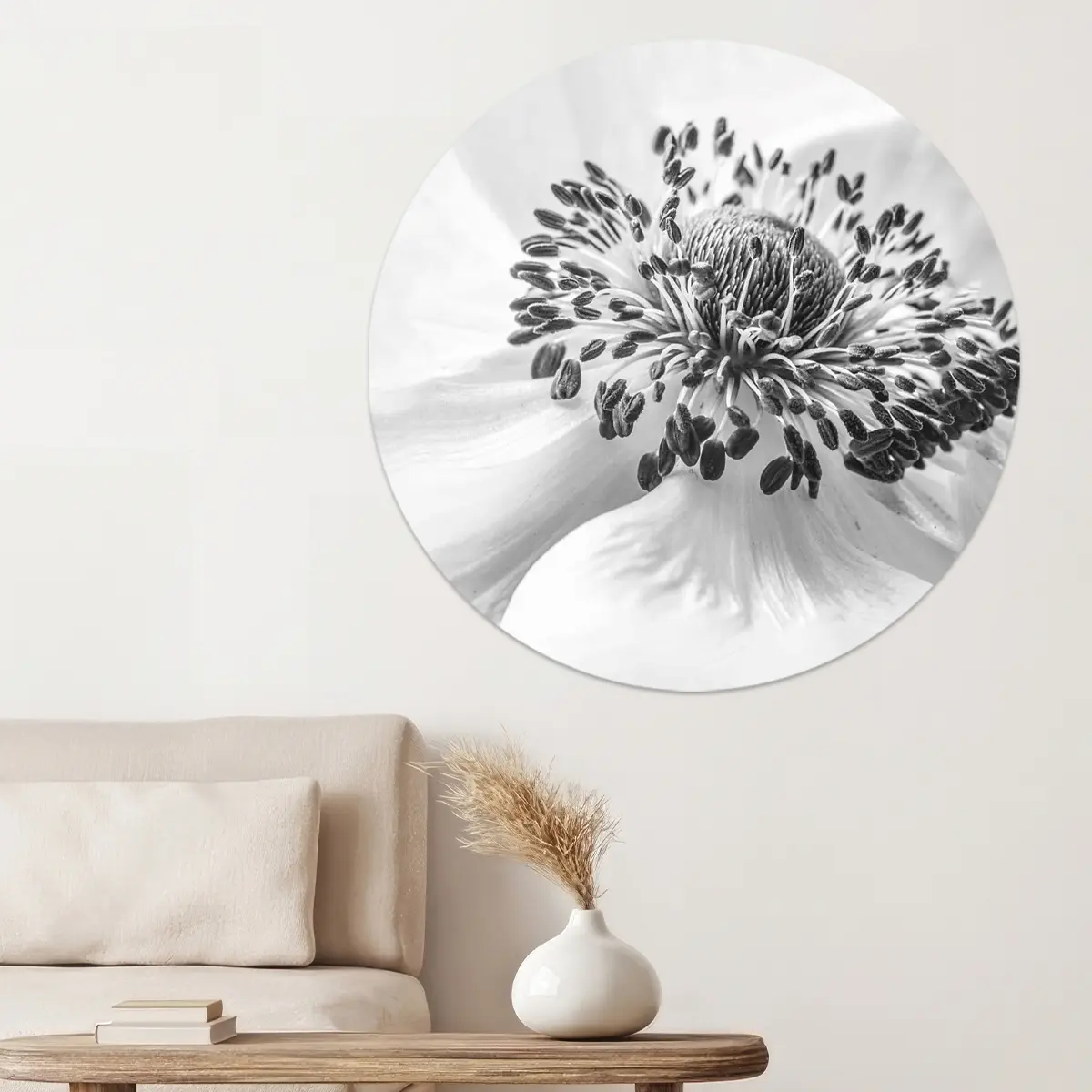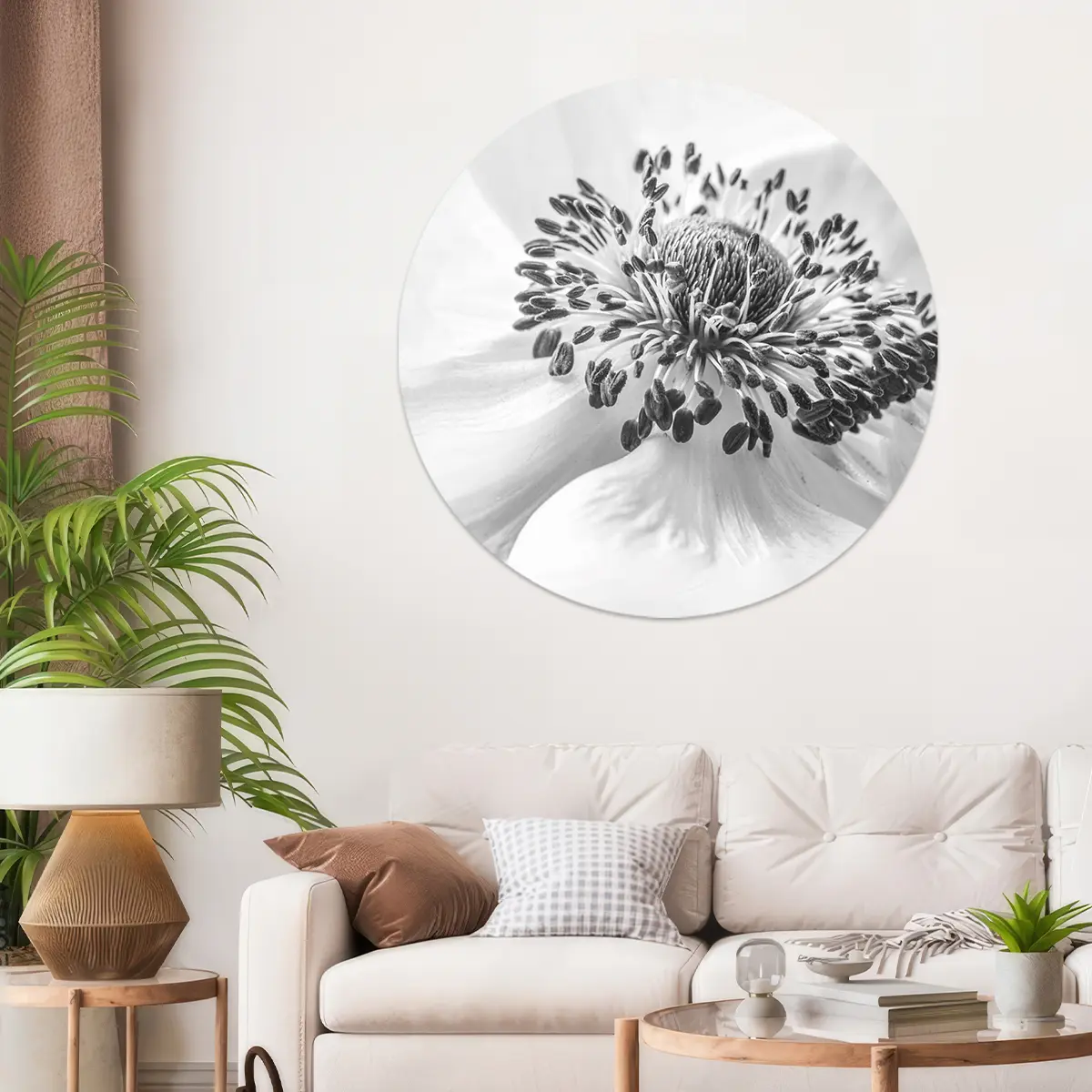 Een intieme zwart-wit macro-opname die de fascinerende details van een anemoon onthult. De zachte, bijna poëtische weergave van de bloem creëert een tijdloze elegantie die perfect past in zowel moderne als klassieke interieurs.