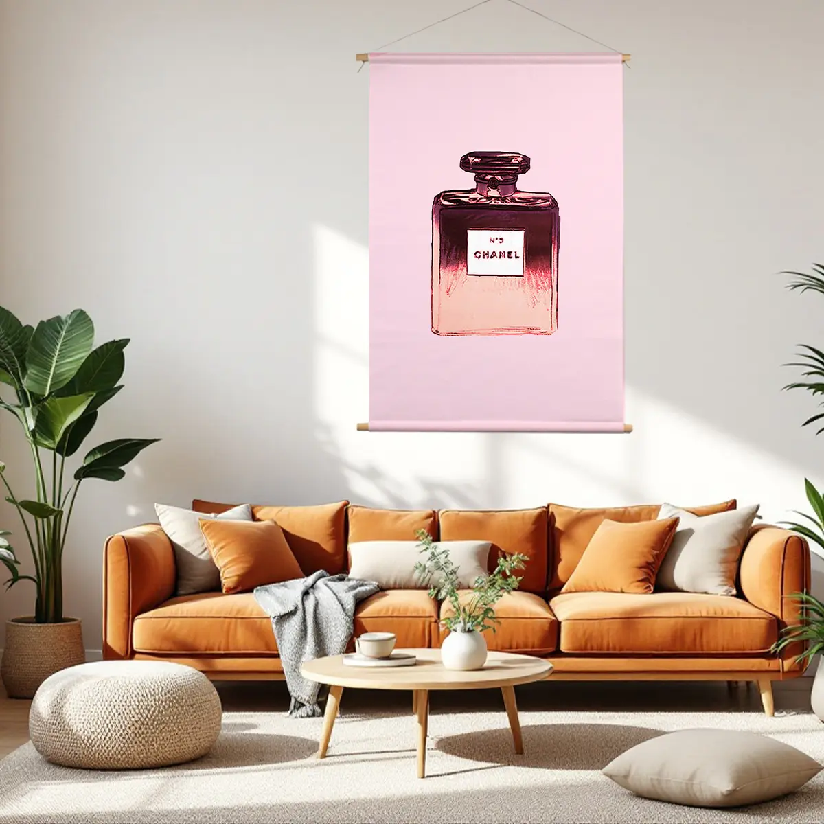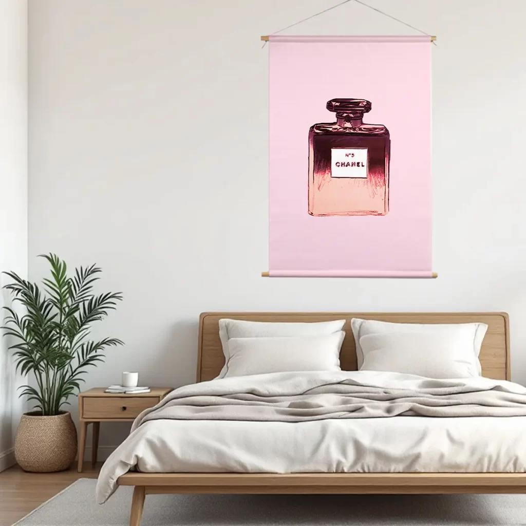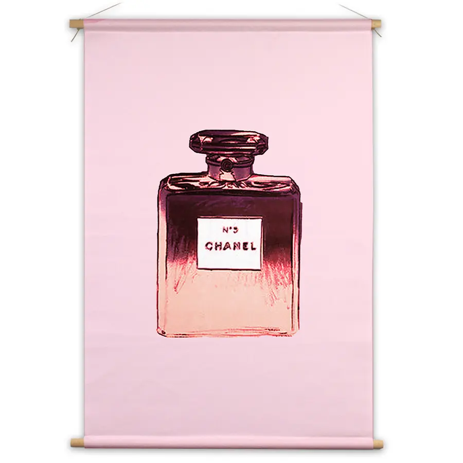 Een stijlvolle pop art interpretatie van een klassieke parfumfles in elegante roze en paarse tinten. De minimalistische achtergrond en de glanzende textuur van de fles creëren een luxueuze, moderne uitstraling. Als wanddecoratie brengt deze print een vleugje glamour en verfijning in elk interieur, perfect voor een slaapkamer, kleedkamer of badkamer waar elegantie centraal staat.