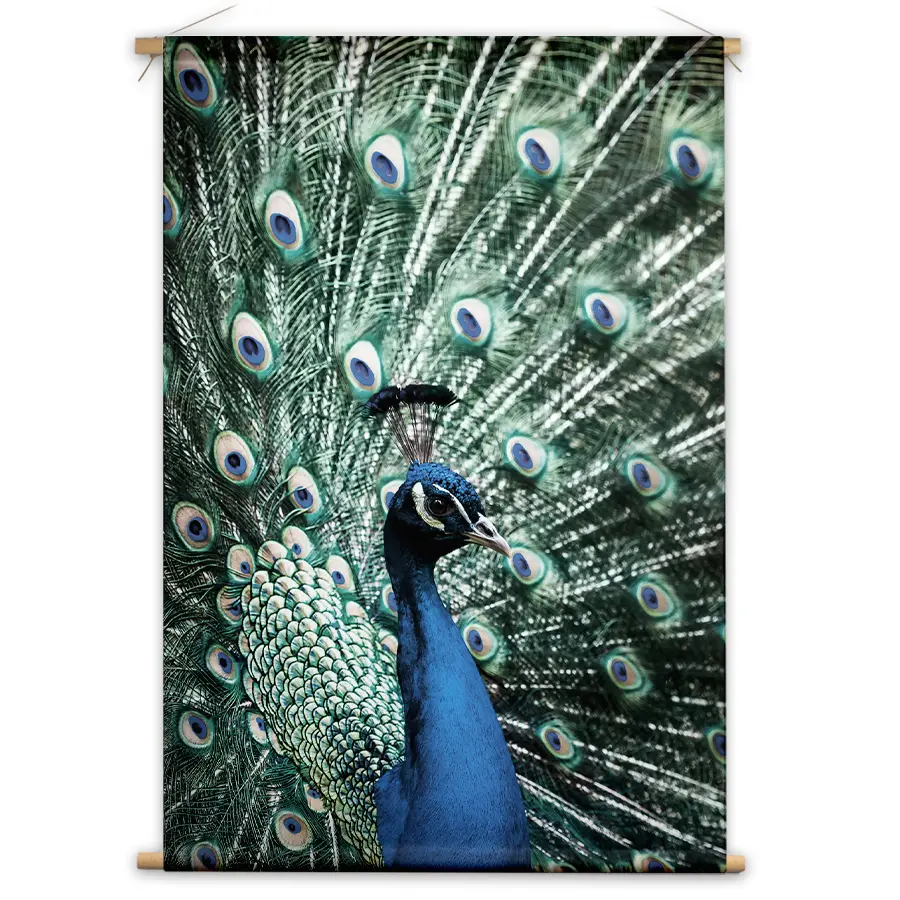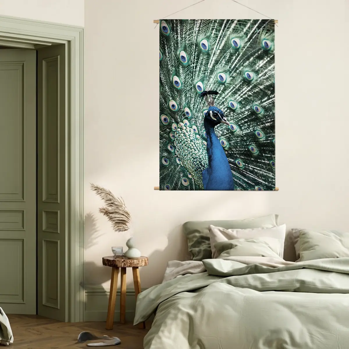 Dit kunstwerk toont de trotse en indrukwekkende schoonheid van een Indiase pauw, met zijn schitterende veren volledig uitgespreid. Het schilderij weerspiegelt de kenmerkende flamboyantie van het dier en de pracht van de natuur, met levendige kleuren en gedetailleerde.