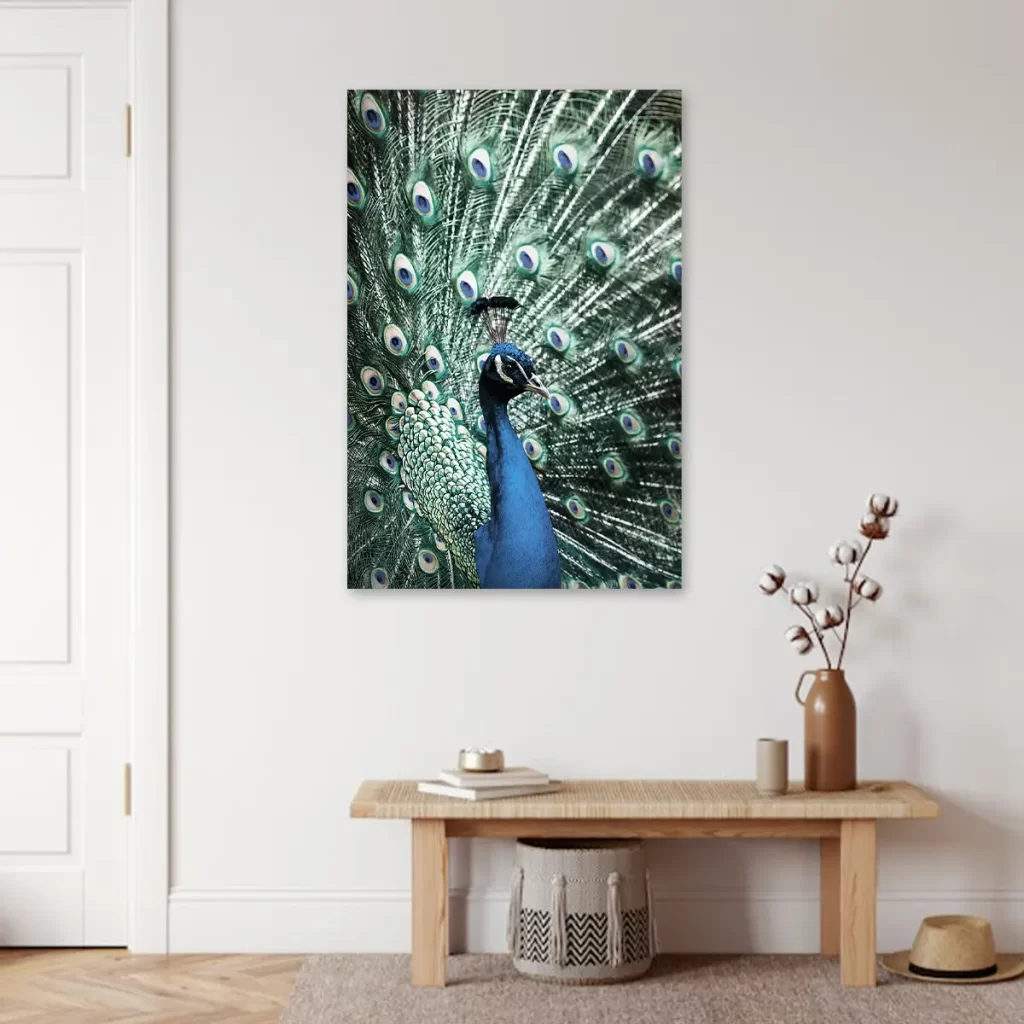 Dit kunstwerk toont de trotse en indrukwekkende schoonheid van een Indiase pauw, met zijn schitterende veren volledig uitgespreid. Het schilderij weerspiegelt de kenmerkende flamboyantie van het dier en de pracht van de natuur, met levendige kleuren en gedetailleerde.
