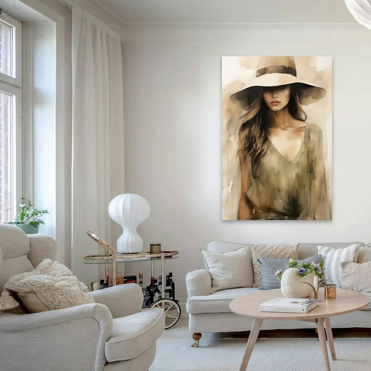 Deze Jonge Vrouw is een betoverend schilderij dat een fascinerende vrouw toont in zachte olijfgroene tinten. Haar blik is sterk maar kalm, en de breedgerande hoed werpt een schaduw over een deel van haar gezicht, wat een gevoel van mystiek en elegantie creëert. De delicate penseelstreken met aquarel benadrukken haar vrouwelijke schoonheid en maakt van deze wanddecoratie een prachtig middelpunt voor elk modern interieur.