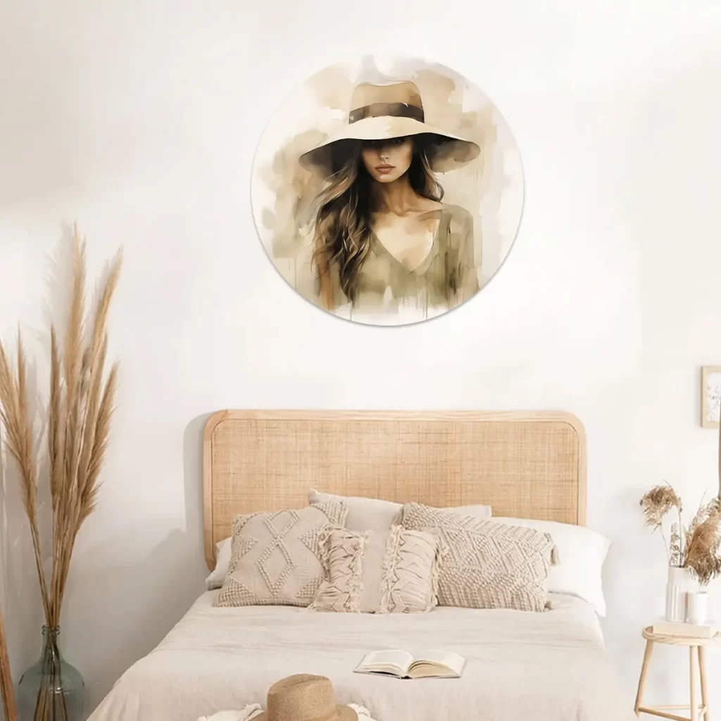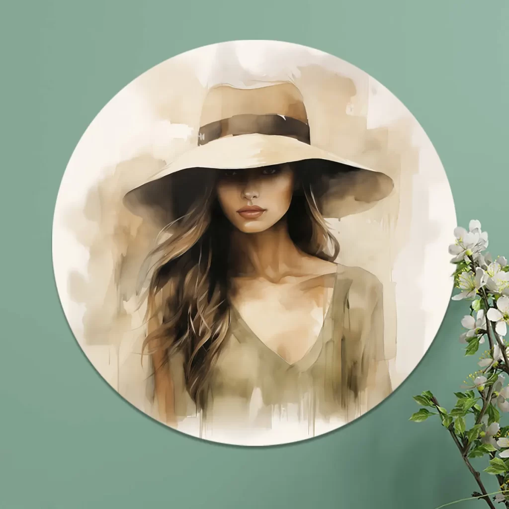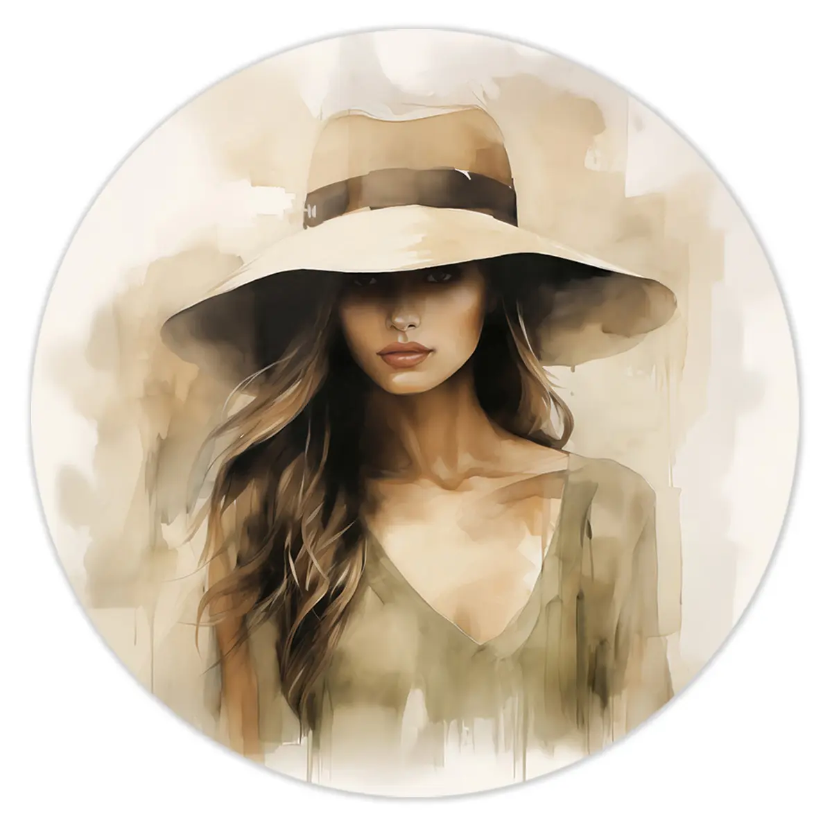 Deze Jonge Vrouw is een betoverend schilderij dat een fascinerende vrouw toont in zachte olijfgroene tinten. Haar blik is sterk maar kalm, en de breedgerande hoed werpt een schaduw over een deel van haar gezicht, wat een gevoel van mystiek en elegantie creëert. De delicate penseelstreken met aquarel benadrukken haar vrouwelijke schoonheid en maakt van deze wanddecoratie een prachtig middelpunt voor elk modern interieur.
