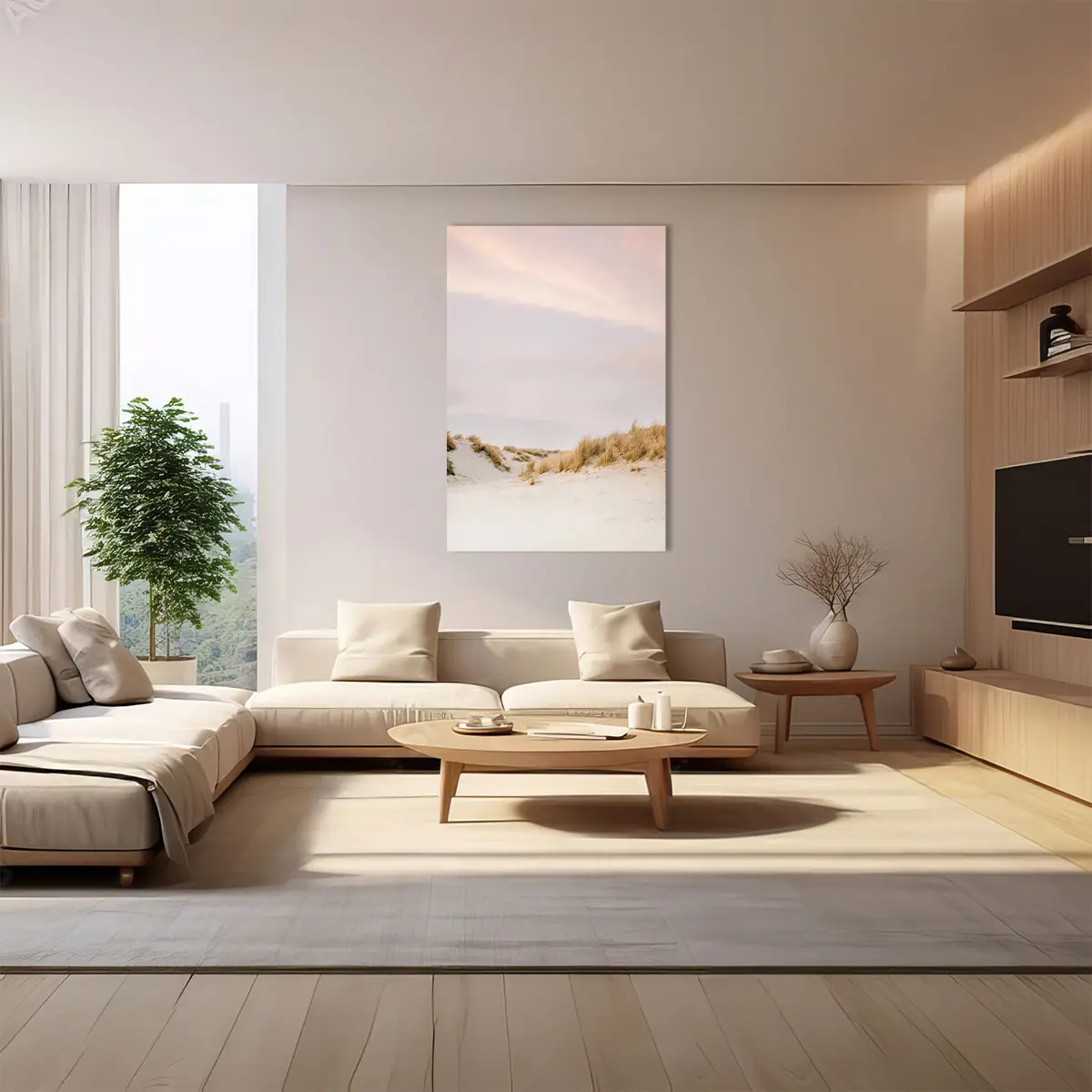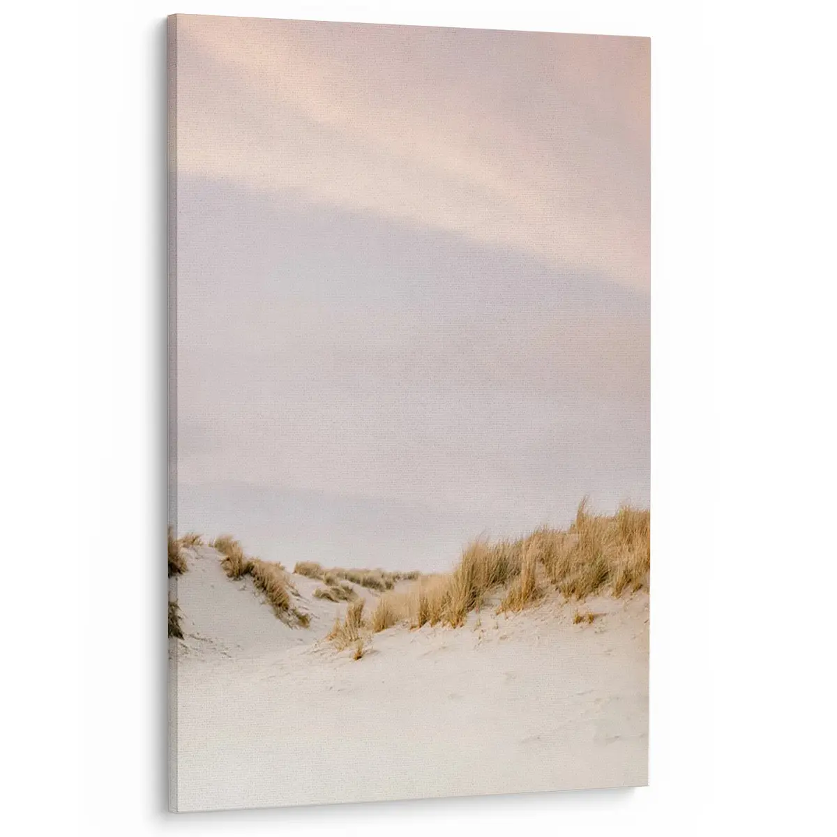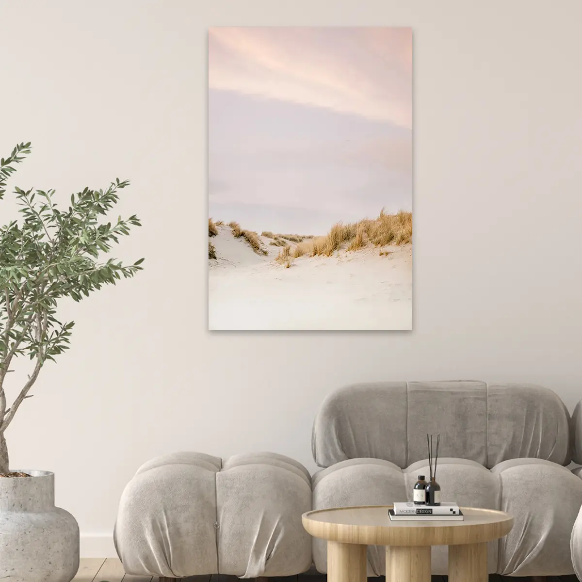Een poëtisch beeld van helmgras wiegend in de duinen, gevangen in zachte, romantische tinten. De subtiele kleurschakeringen en de natuurlijke texturen van het helmgras creëren een tijdloos stukje Nederlandse kustschoonheid. Deze print brengt rust en natuurlijke elegantie in huis, perfect voor een stijlvol, natuurlijk interieur.