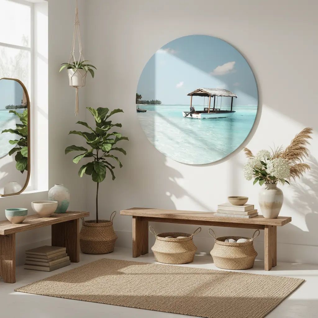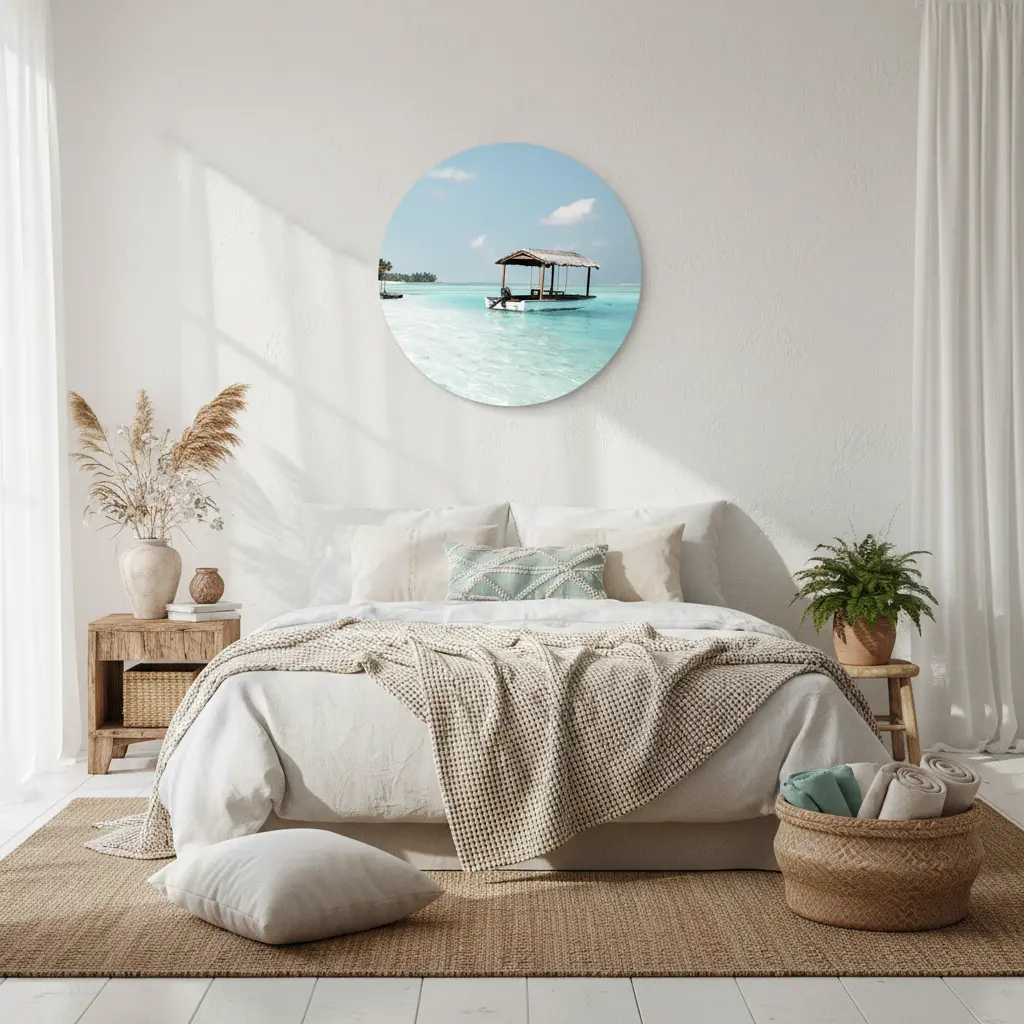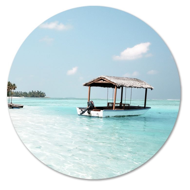 Een rustig kustbeeld met een bootje op helder turquoise water en een zachte blauwe lucht. Brengt een frisse, zomerse sfeer en lichte beach vibes in je interieur.
