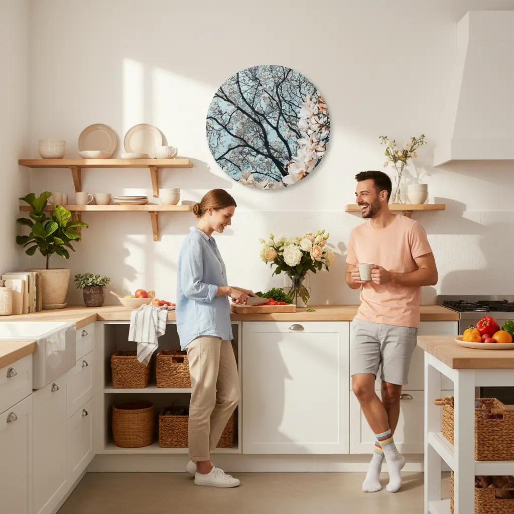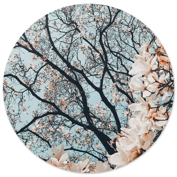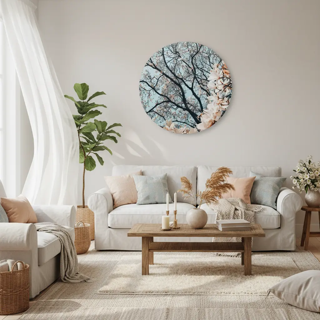 Sfeervolle magnoliabloesem met fijne takken en zachte crèmetinten tegen een frisse lichtblauwe lucht. Een rustige, elegante blikvanger die licht en ruimte brengt in je interieur en prachtig combineert met hout, linnen en natuurlijke accessoires.