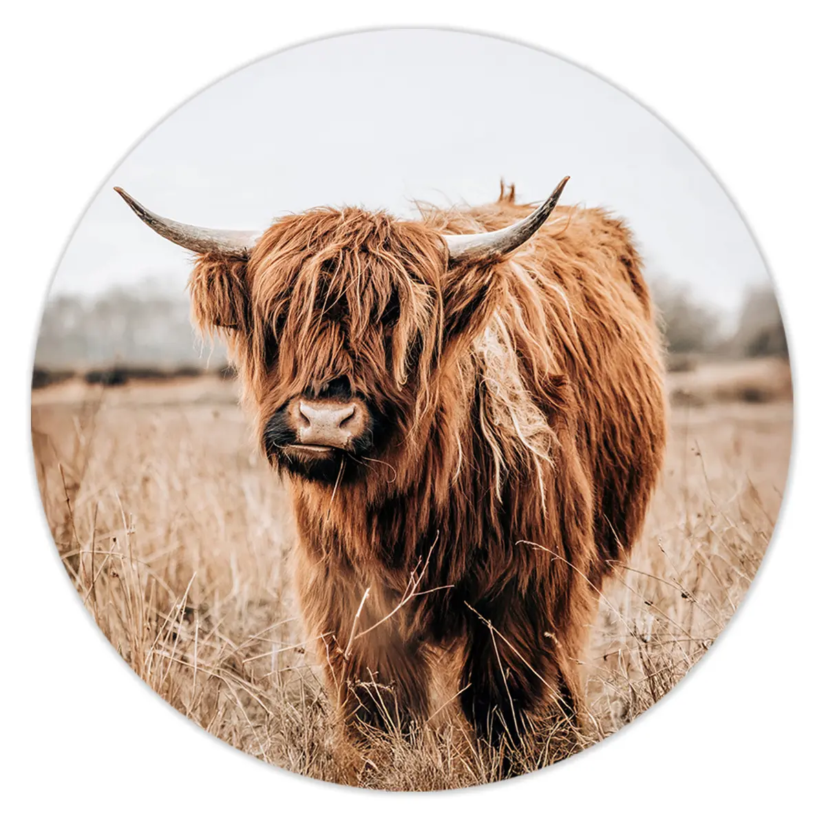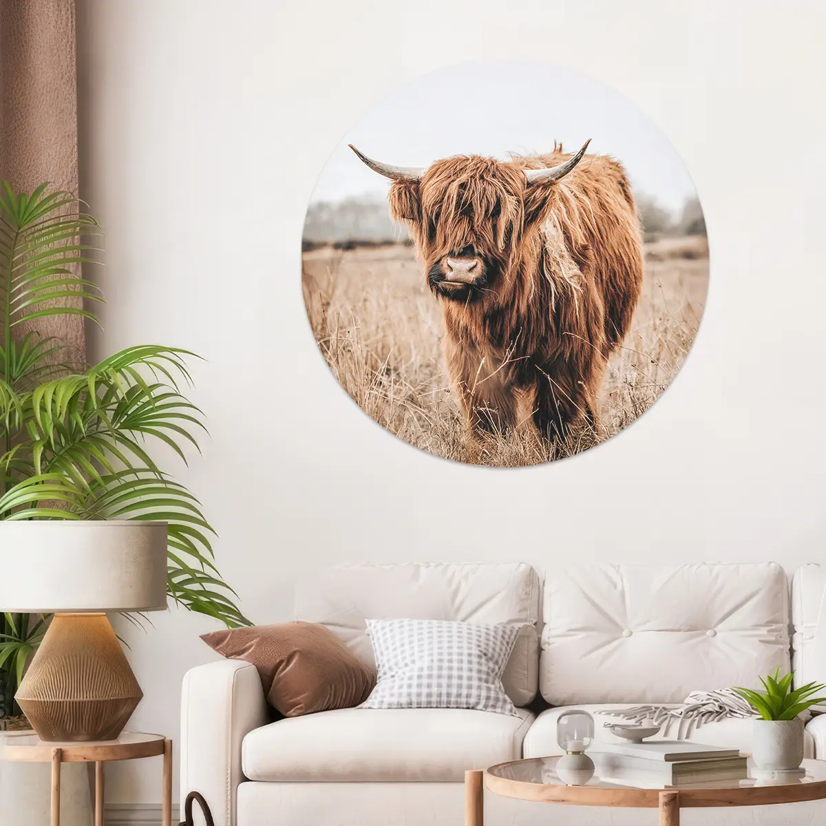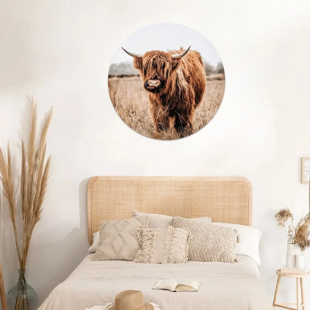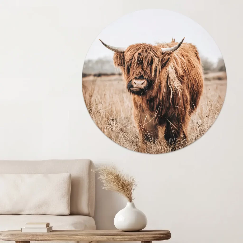 Deze krachtige foto van een Schotse Hooglander straalt rust en natuurlijke schoonheid uit. De warme bruintinten creëren een rustieke sfeer die perfect past in een modern of landelijk interieur.