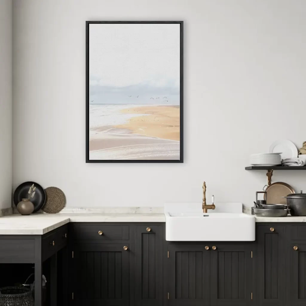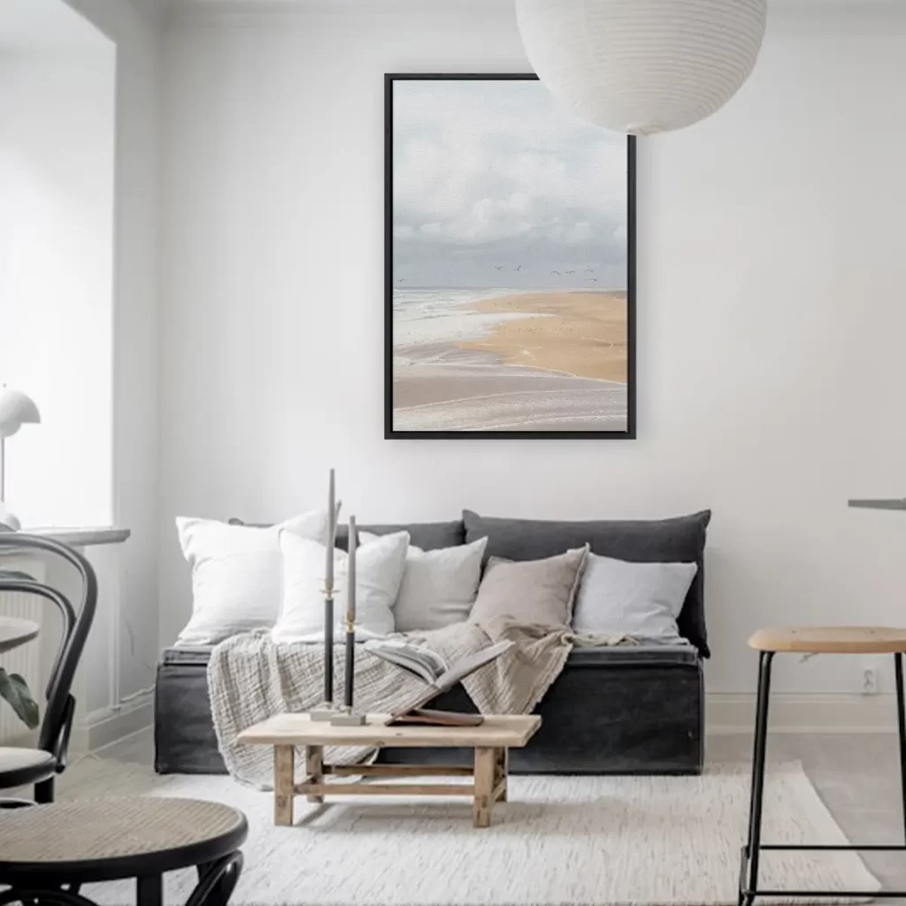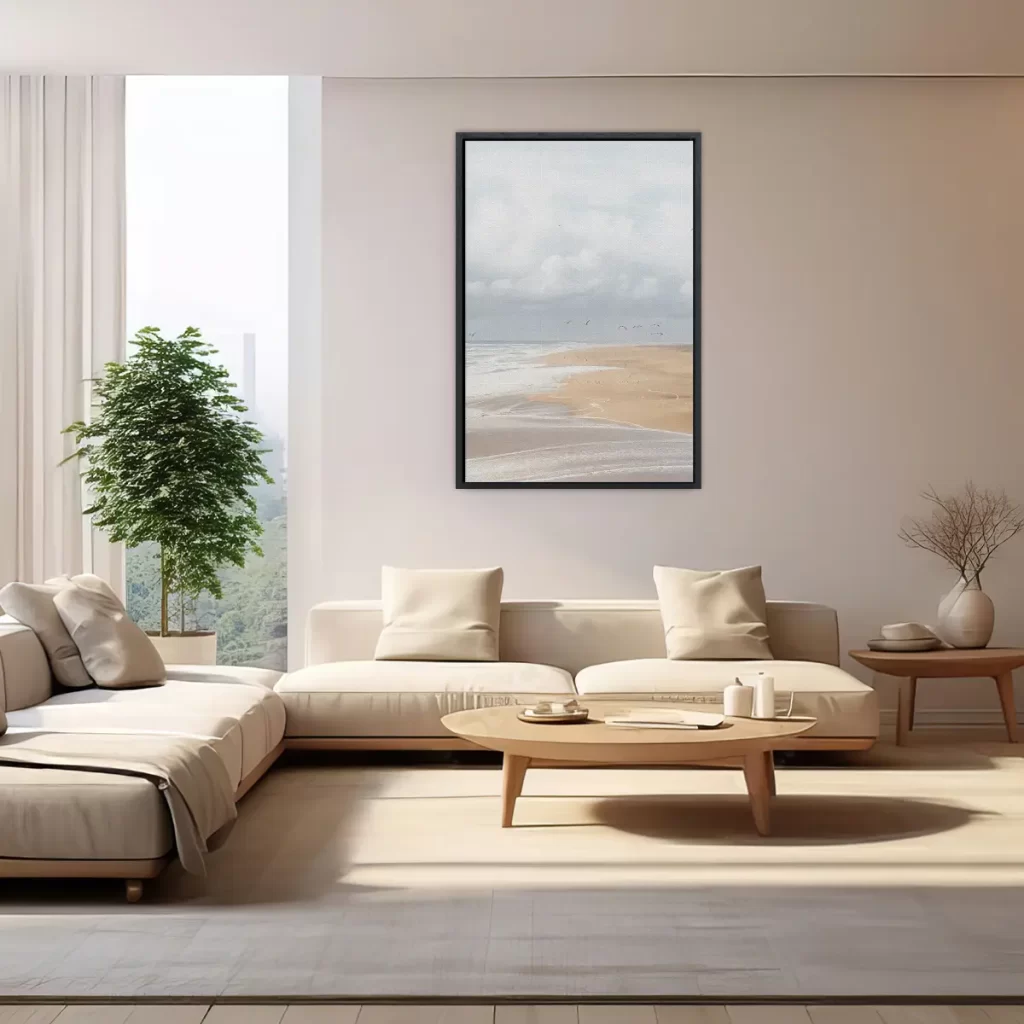 Een sereen strandlandschap in zachte, neutrale tinten waar meeuwen sierlijk door de lucht zweven. De mistige atmosfeer en het zachte kleurenpalet creëren een rustgevende sfeer die perfect past in een modern of Scandinavisch interieur. Als wanddecoratie brengt deze print de kalme energie van een winterse stranddag in huis.