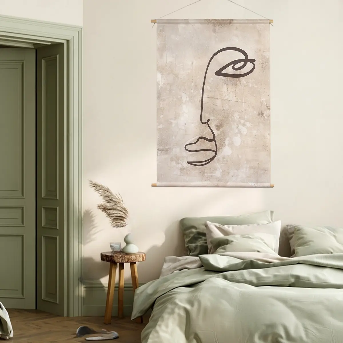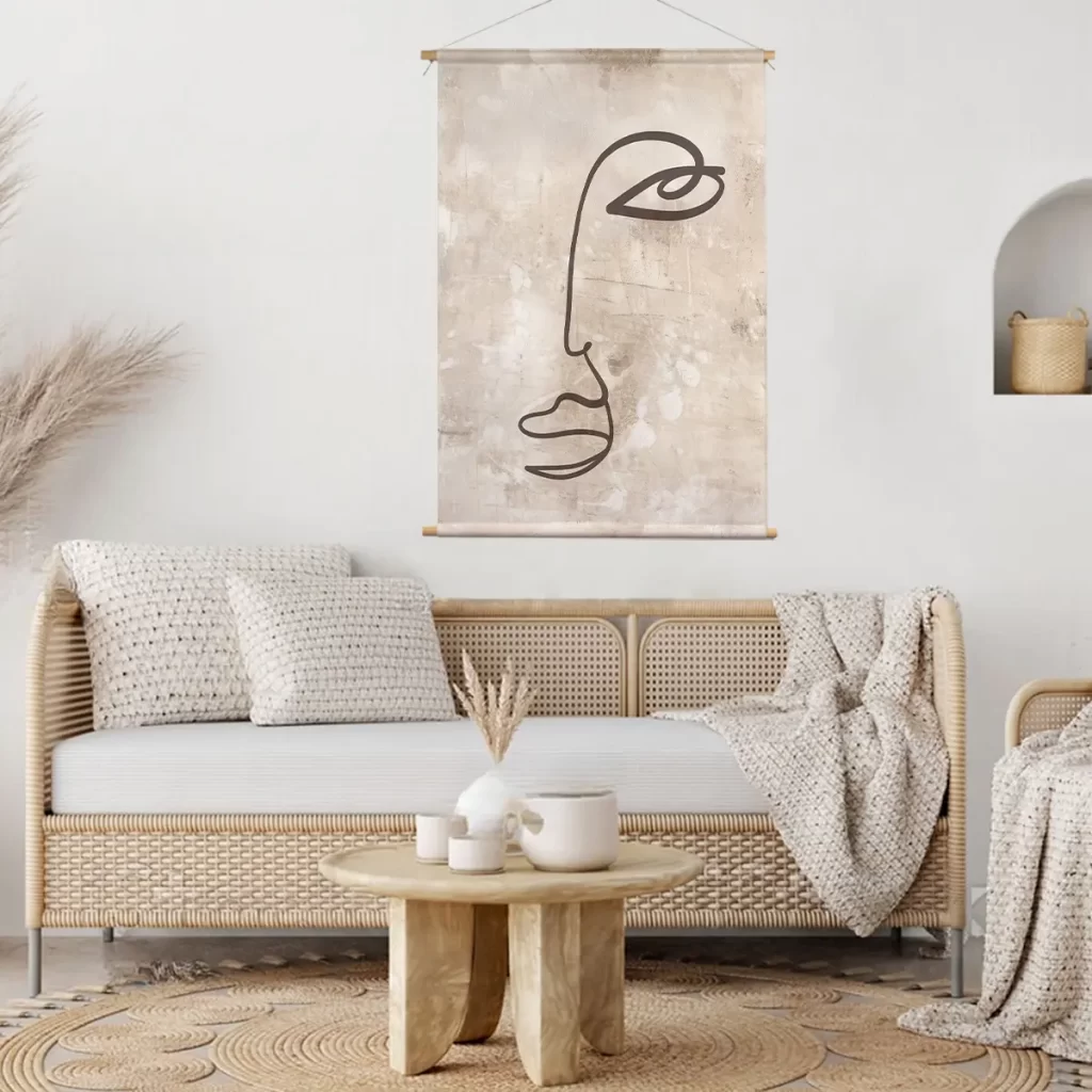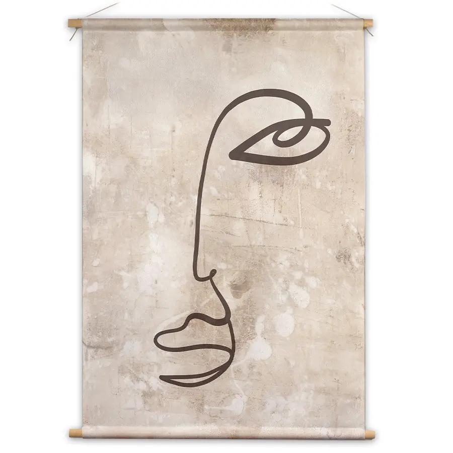 Een elegante, minimalistische lijntekening van een gezichtsprofiel op een subtiele beige achtergrond met textuur. De eenvoud van de enkele lijn creëert een krachtig, modern kunstwerk dat perfect past in een minimalistisch of Scandinavisch interieur. Deze print voegt een vleugje artistieke verfijning toe aan elke ruimte zonder te overheersen.