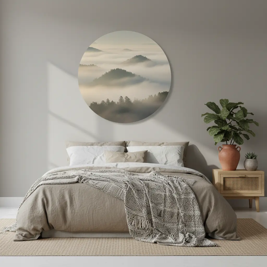 Mistige bergtoppen omhuld door zachte ochtendmist, met subtiele bomen die door de nevel schijnen. De warme grijze en crème tinten met salie-groene accenten creëren een serene, rustgevende sfeer die perfect past in een boho of minimalistisch interieur met linnen, rotan en keramiek.