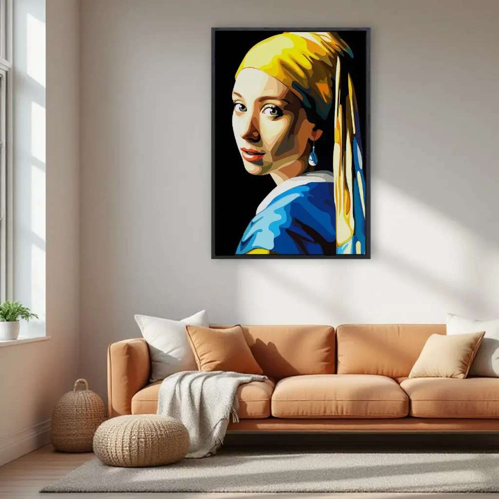 Een eigentijdse pop art versie van het klassieke "Meisje met de Parel" in heldere, geometrische kleuren. De combinatie van geel, blauw en warme huidtinten geeft dit iconische kunstwerk een frisse, moderne twist. Als wanddecoratie brengt deze print een perfecte balans tussen klassieke kunst en hedendaagse stijl, ideaal voor kunstliefhebbers die houden van moderne interpretaties van tijdloze meesterwerken.