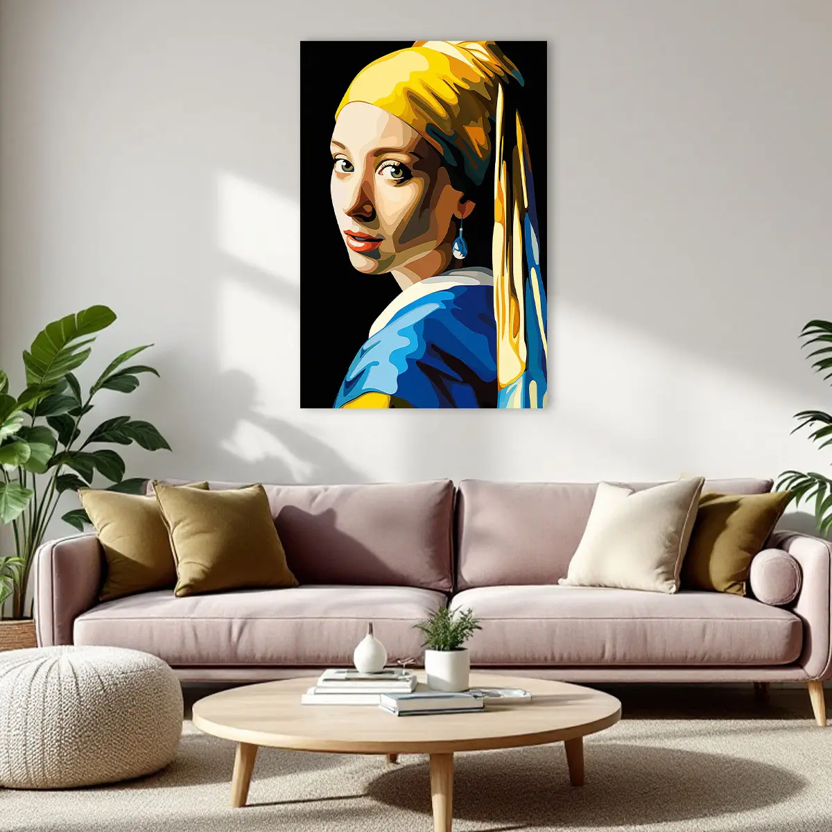 Een eigentijdse pop art versie van het klassieke “Meisje met de Parel” in heldere, geometrische kleuren. De combinatie van geel, blauw en warme huidtinten geeft dit iconische kunstwerk een frisse, moderne twist. Als wanddecoratie brengt deze print een perfecte balans tussen klassieke kunst en hedendaagse stijl, ideaal voor kunstliefhebbers die houden van moderne interpretaties van tijdloze meesterwerken.