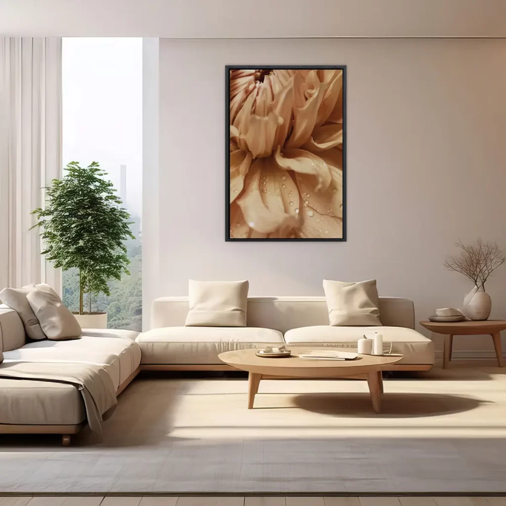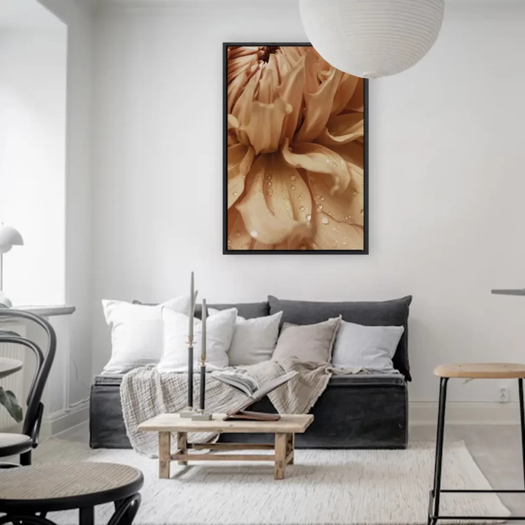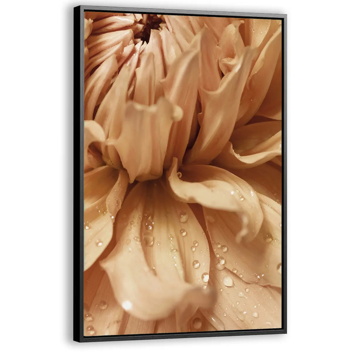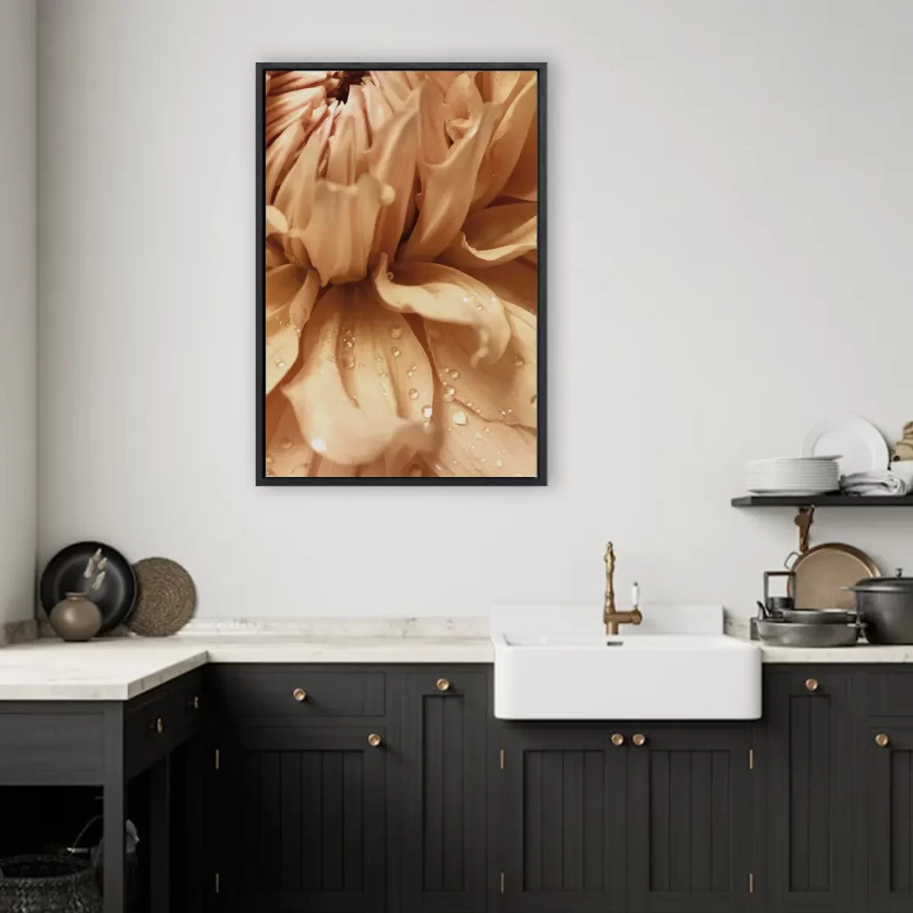 Een intieme macro-opname van delicate bloemblaadjes bedekt met glinsterende waterdruppels. De zachte, champagne-achtige tinten en de kristalheldere dauwdruppels creëren een beeld van pure elegantie en verfijning. Deze print voegt een vleugje luxe en sereniteit toe aan elk interieur.