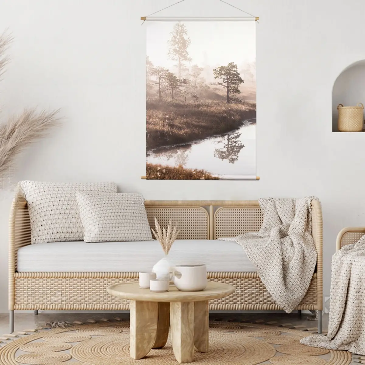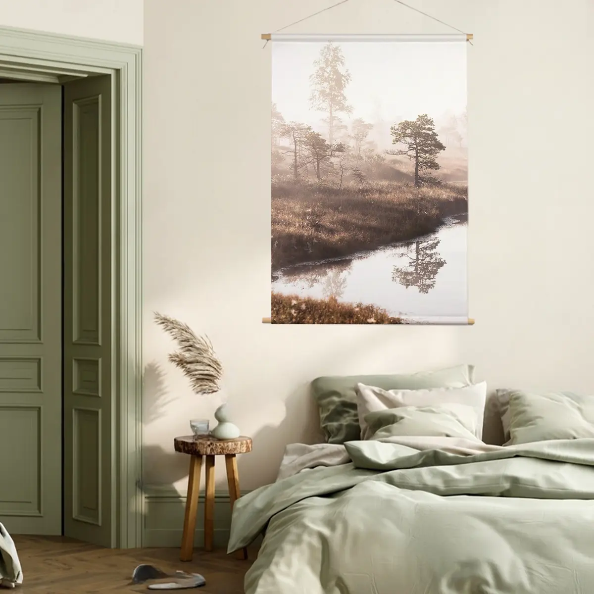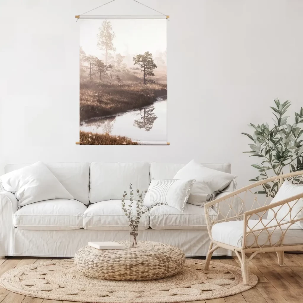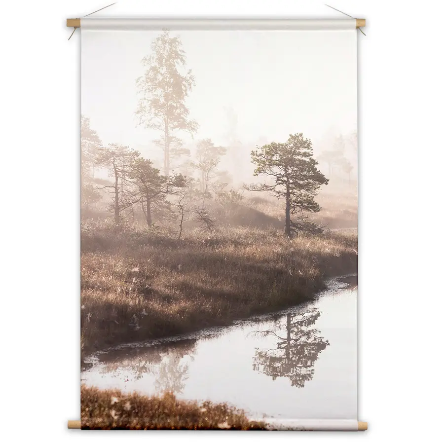 Een dromerig landschap waar dennenbomen zich spiegelen in stil water, gehuld in zachte ochtendmist. De warme zonnestralen die door de mist schijnen creëren een magisch moment. Deze wanddecoratie brengt de serene rust van een vroege ochtend in de natuur naar binnen.
