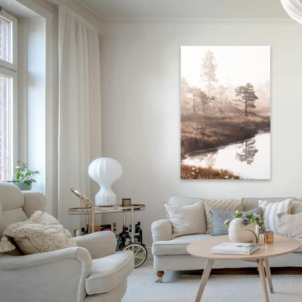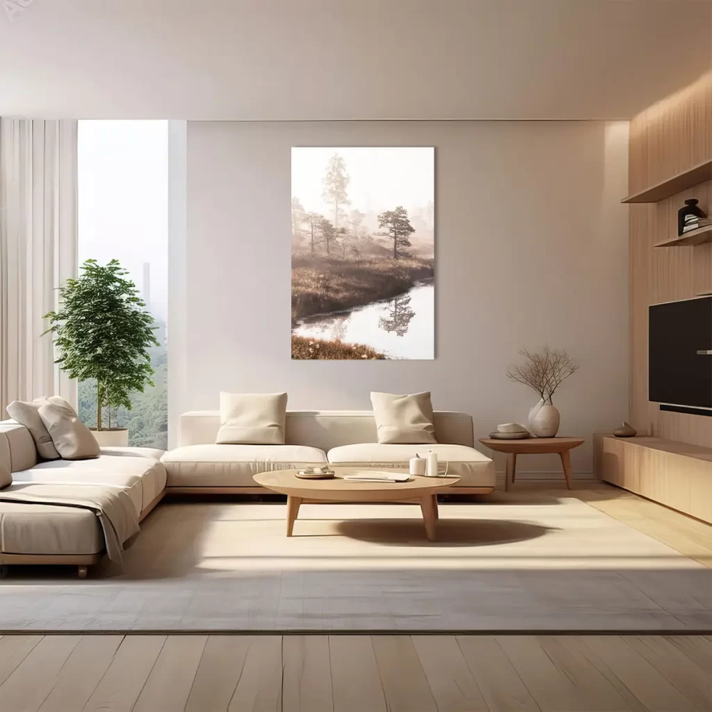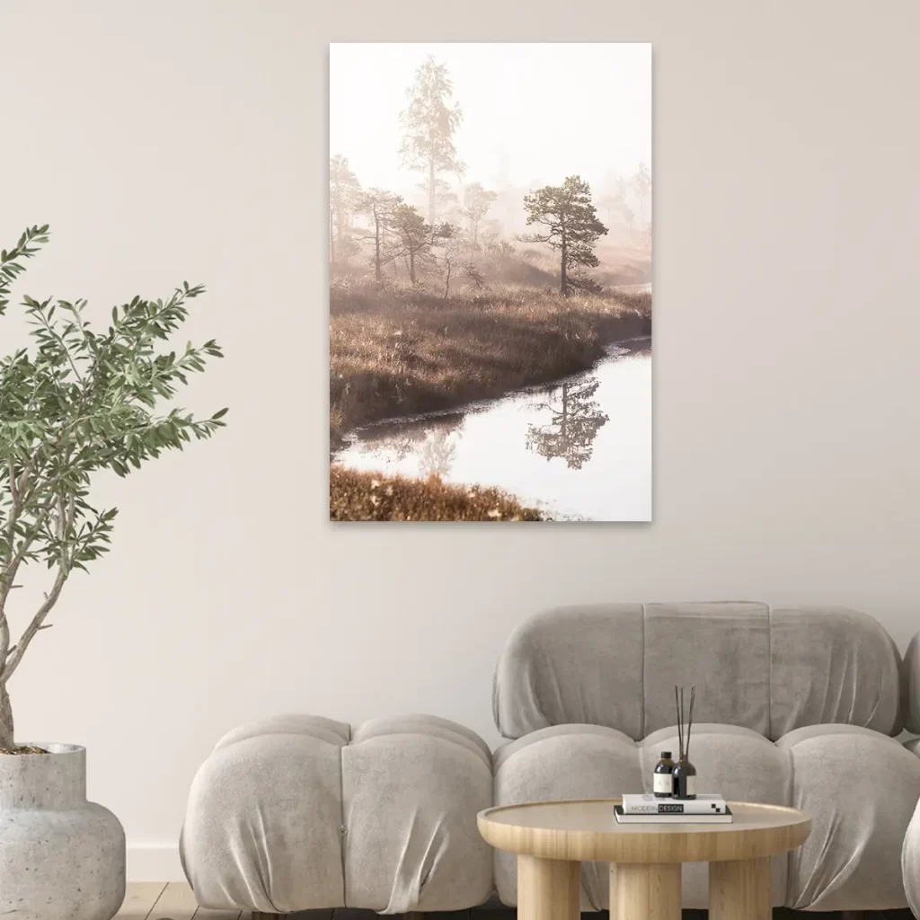 Een dromerig landschap waar dennenbomen zich spiegelen in stil water, gehuld in zachte ochtendmist. De warme zonnestralen die door de mist schijnen creëren een magisch moment. Deze wanddecoratie brengt de serene rust van een vroege ochtend in de natuur naar binnen.